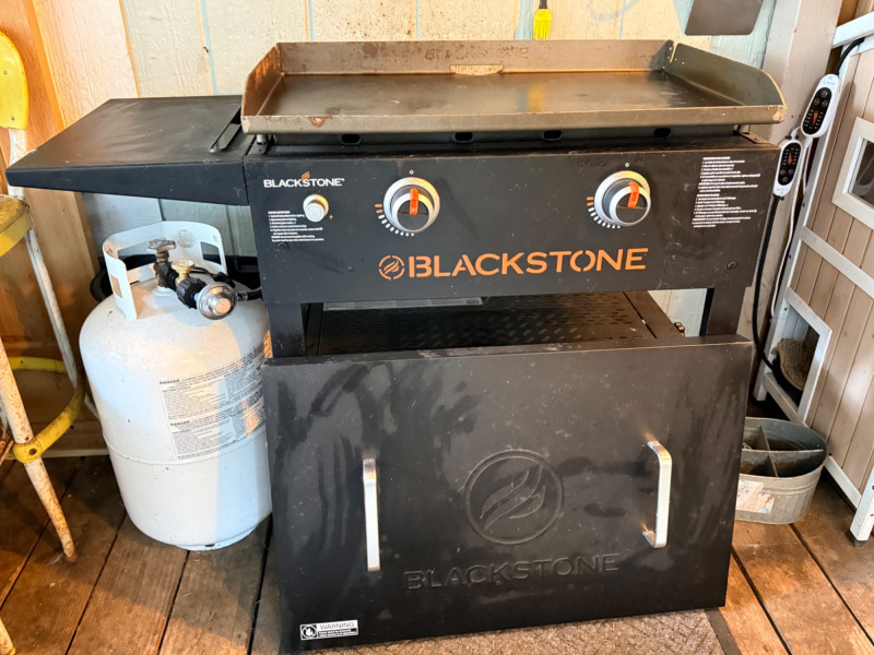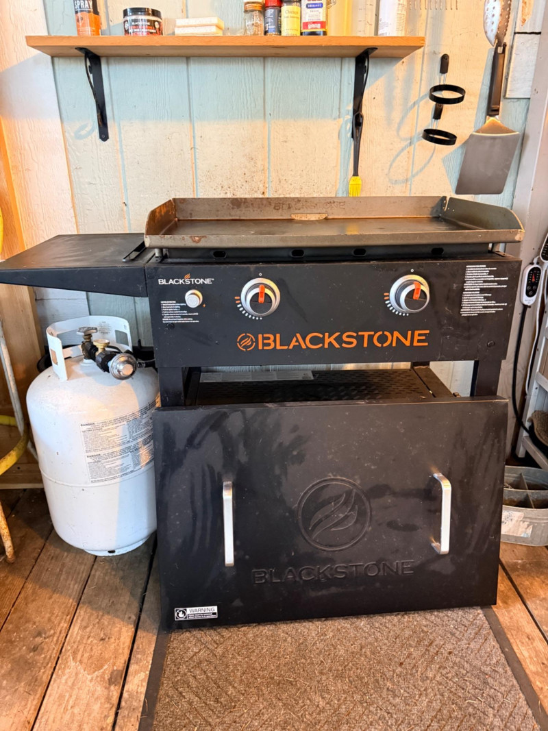Blackstone Original 28” Omnivore Griddle Features two independently controlled heat zones and the Omnivore plate, which preheats quickly and uses less fuel. Reviewers on Forbes Vetted named it the "Best Flat-Top Grill Overall" for its intuitive design and sturdy build. 28”x18.5”x37” tall 7 gallon propane tank and Blackstone spatula included.