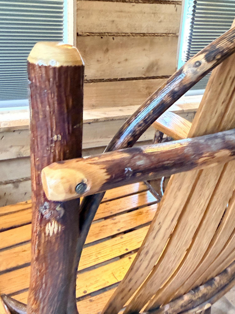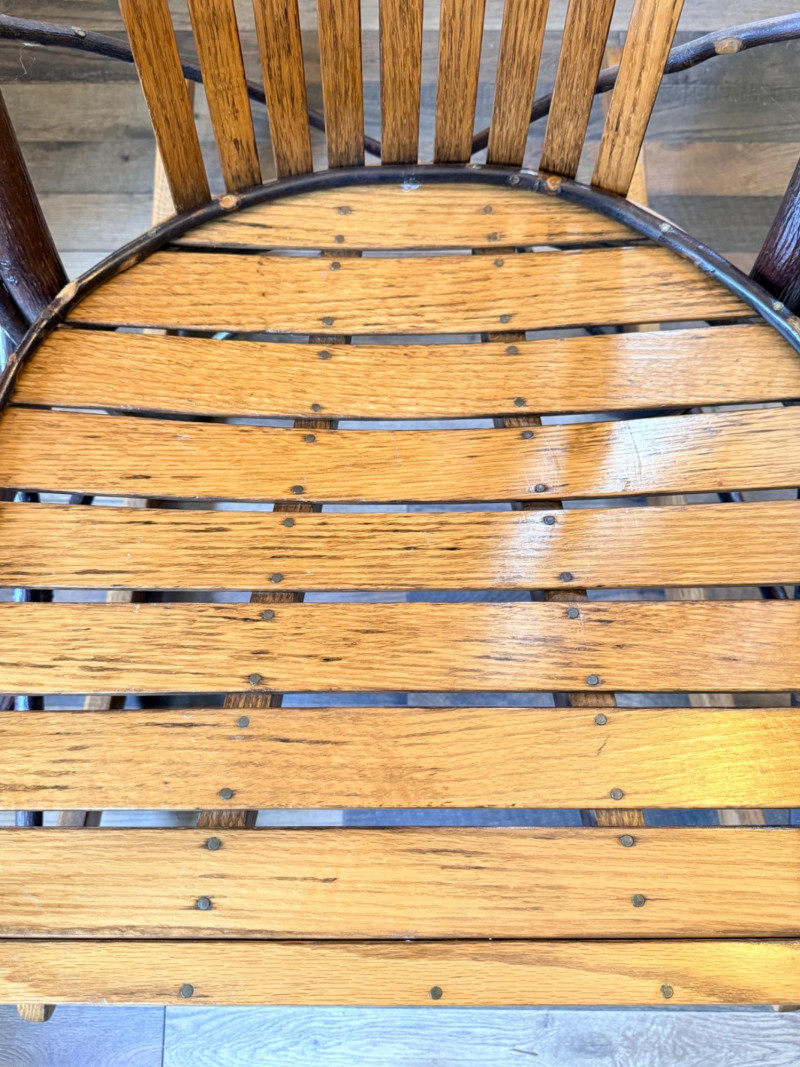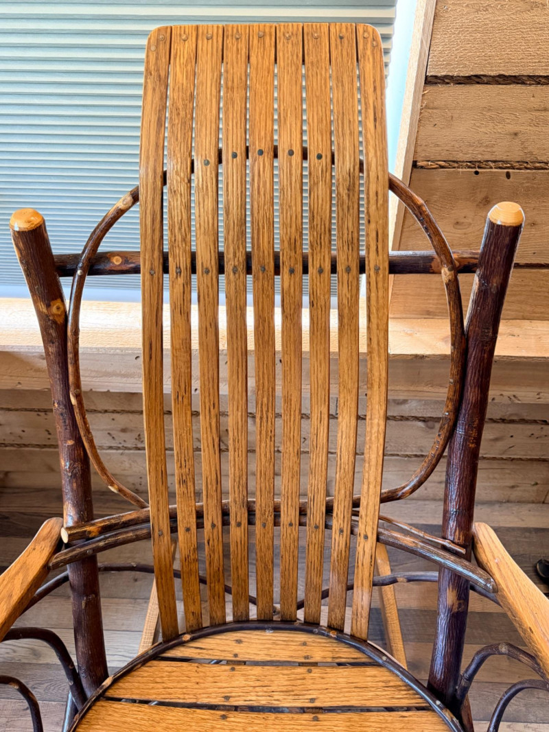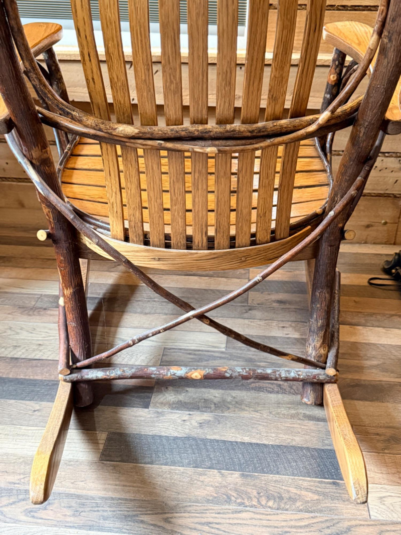 Handcrafted Amish bentwood rocking chair made of hickory sticks and oak slats. Beautifully hand nailed and handcrafted. Signed and dated by maker.