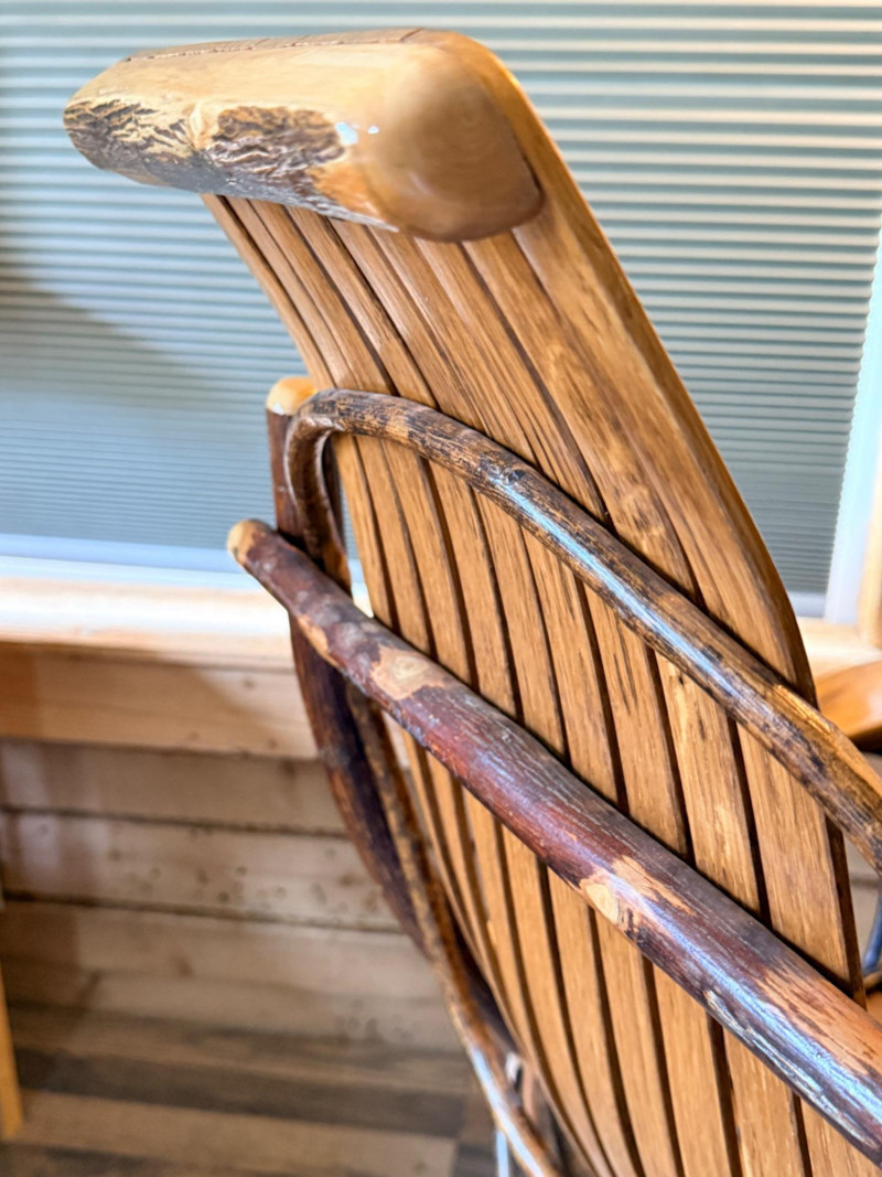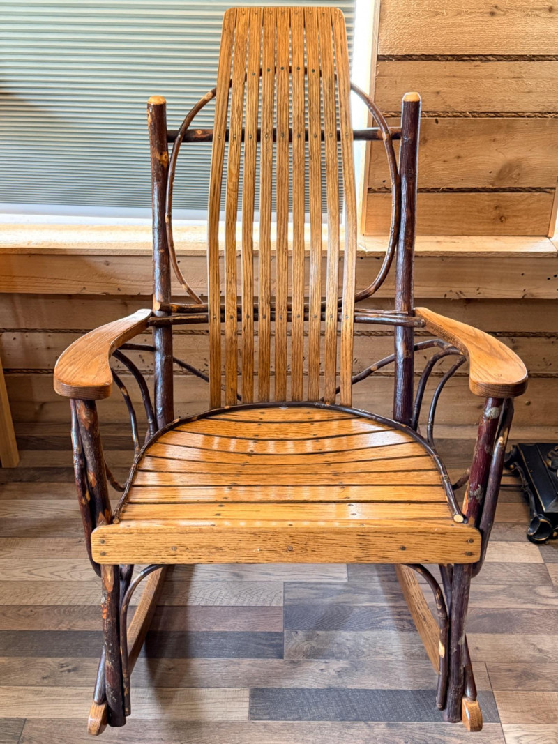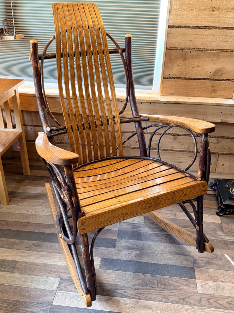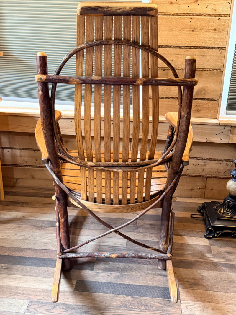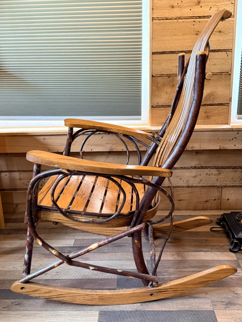 Handcrafted Amish bentwood rocking chair made of hickory sticks and oak slats. Beautifully hand nailed and handcrafted. Signed and dated by maker.