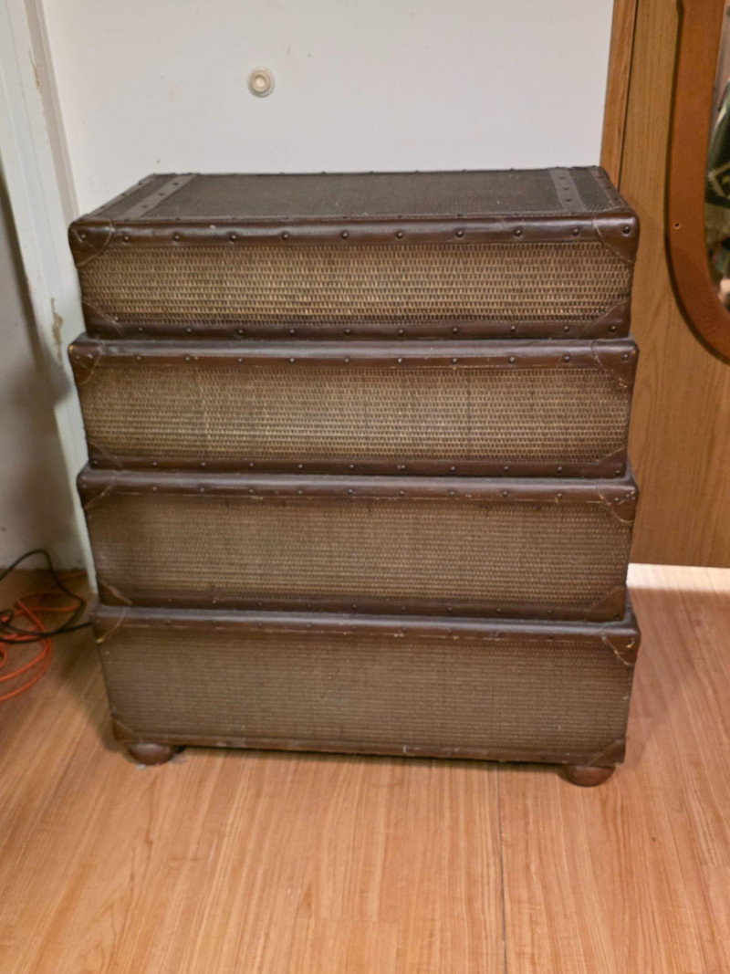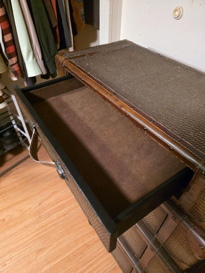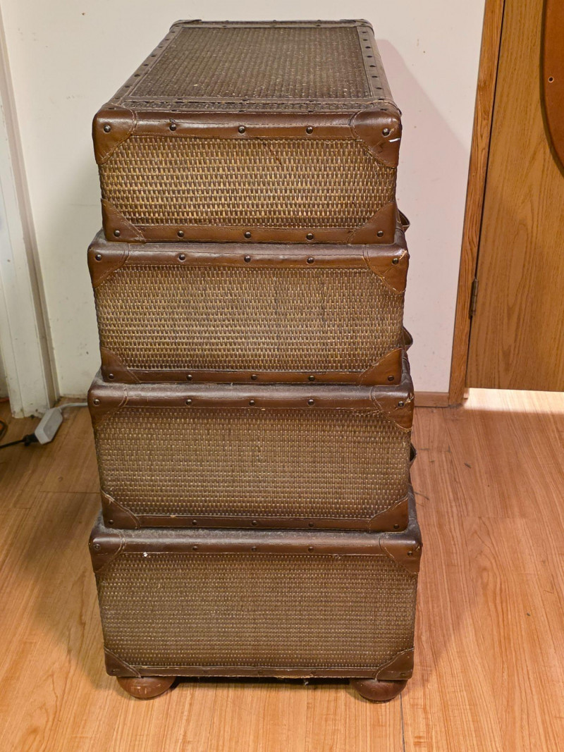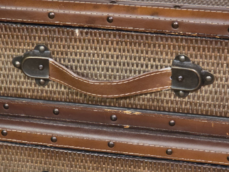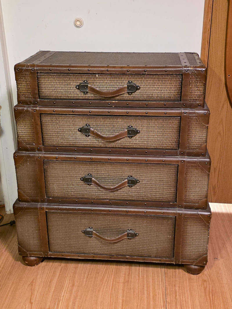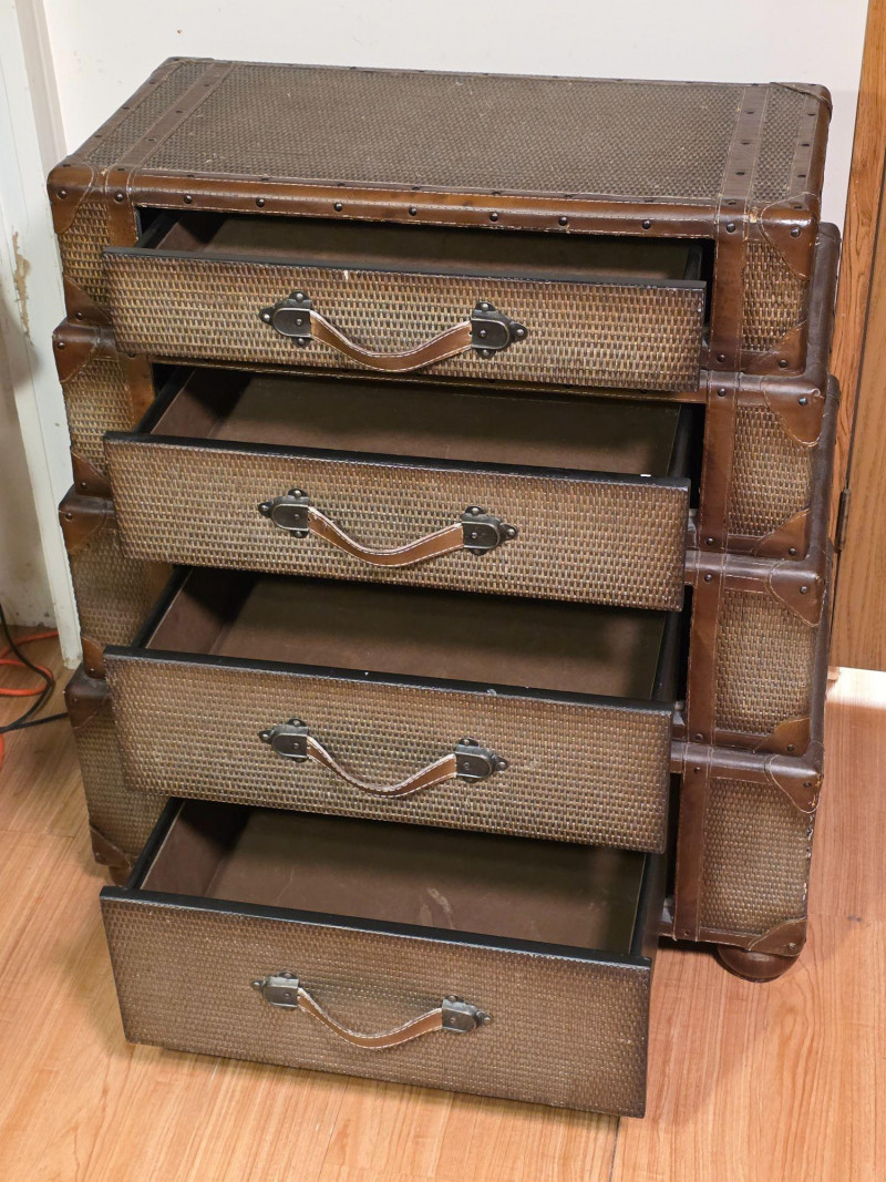 Chest Of Drawers Designed To Resemble A Stack Of Luggage Vintage-style, four-drawer dresser is designed to look like a stack of luggage Featuring woven rattan fronts, leather-wrapped handles, and brass-colored stud details In vintage condition with minor flaws, see pics! 37.5"T x 34"W x 19"D