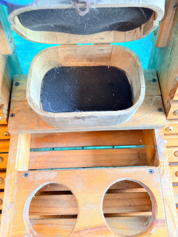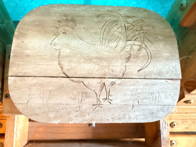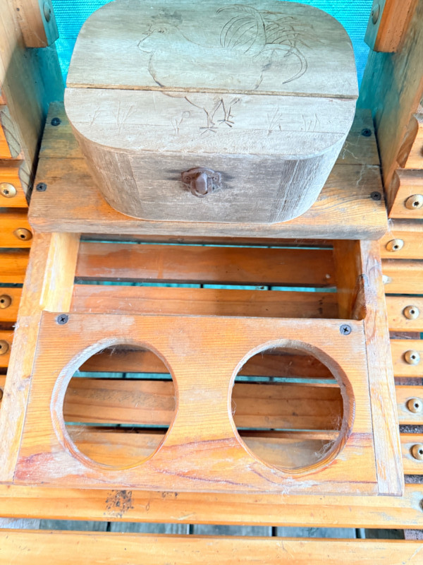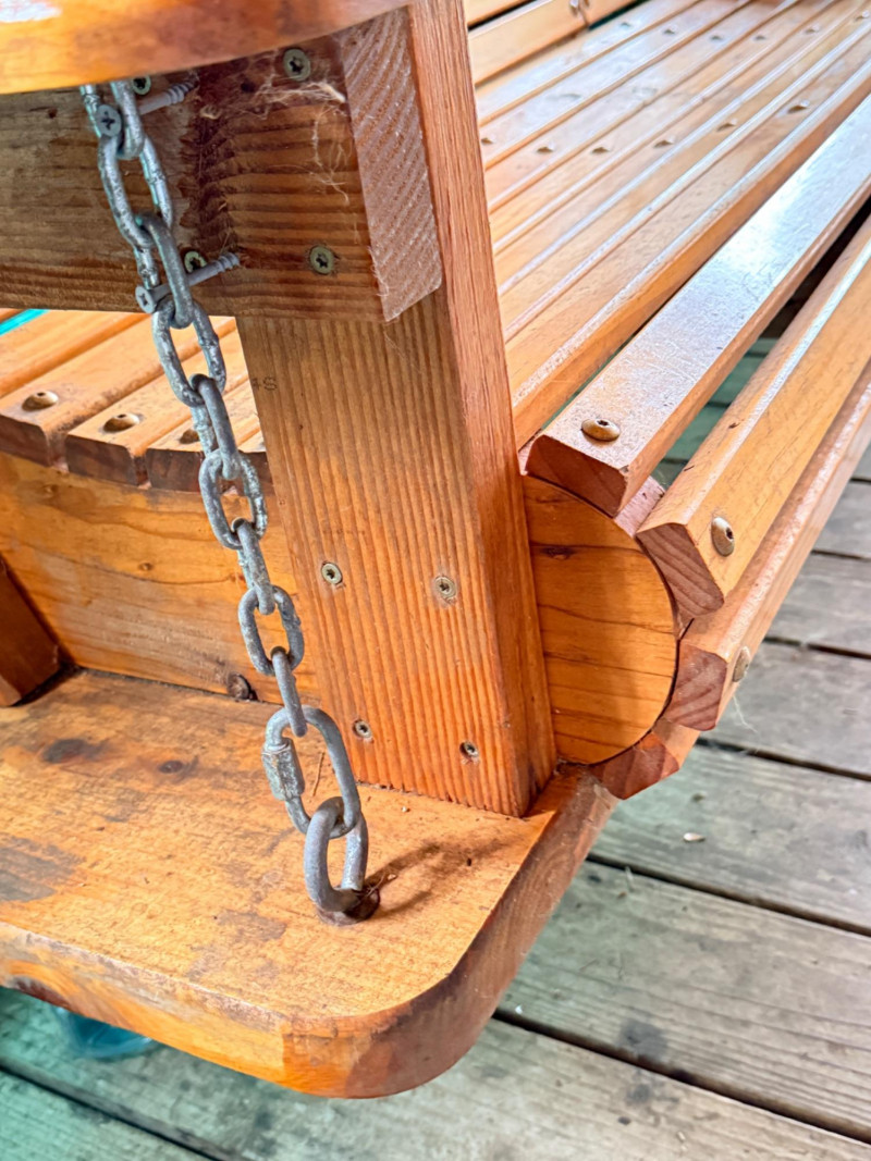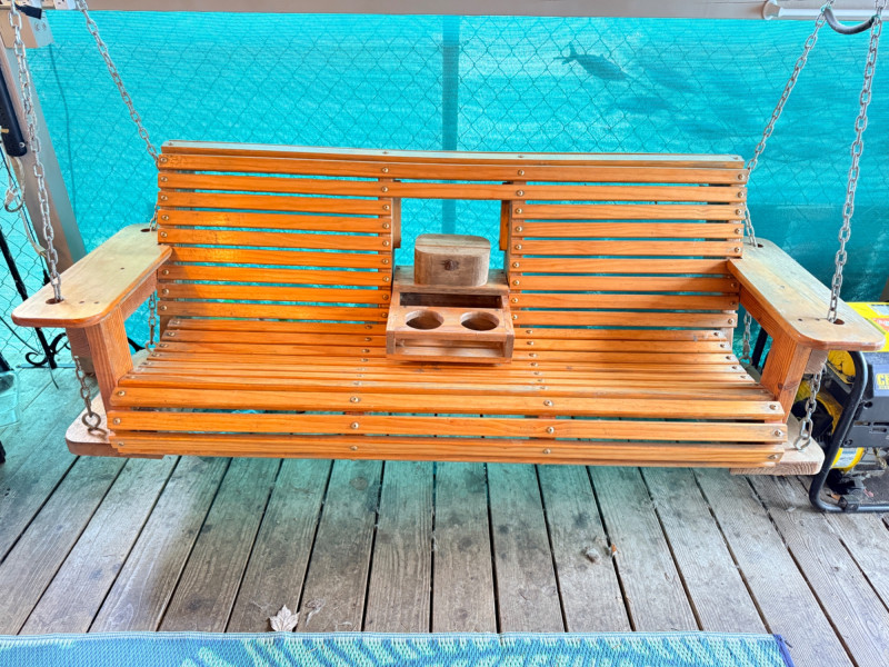 Hand Crafted 71” Pine Porch Swing This handmade pine swing is solid built and heavy duty with its wide armrests, curved back and seat for comfort. A flip down center console holds 2 beverages and a wooden box with a rooster design. The box lid is currently broken, but attached.