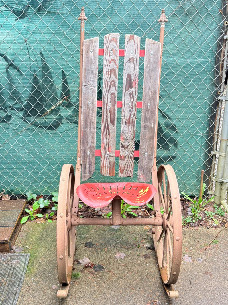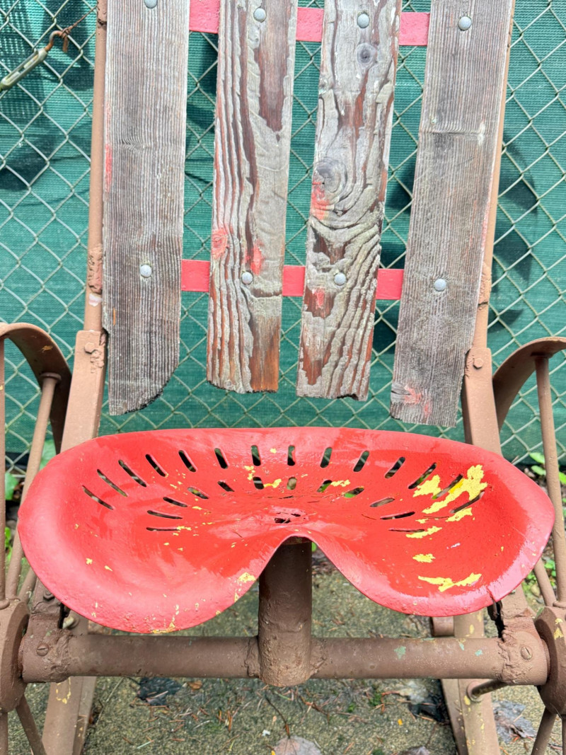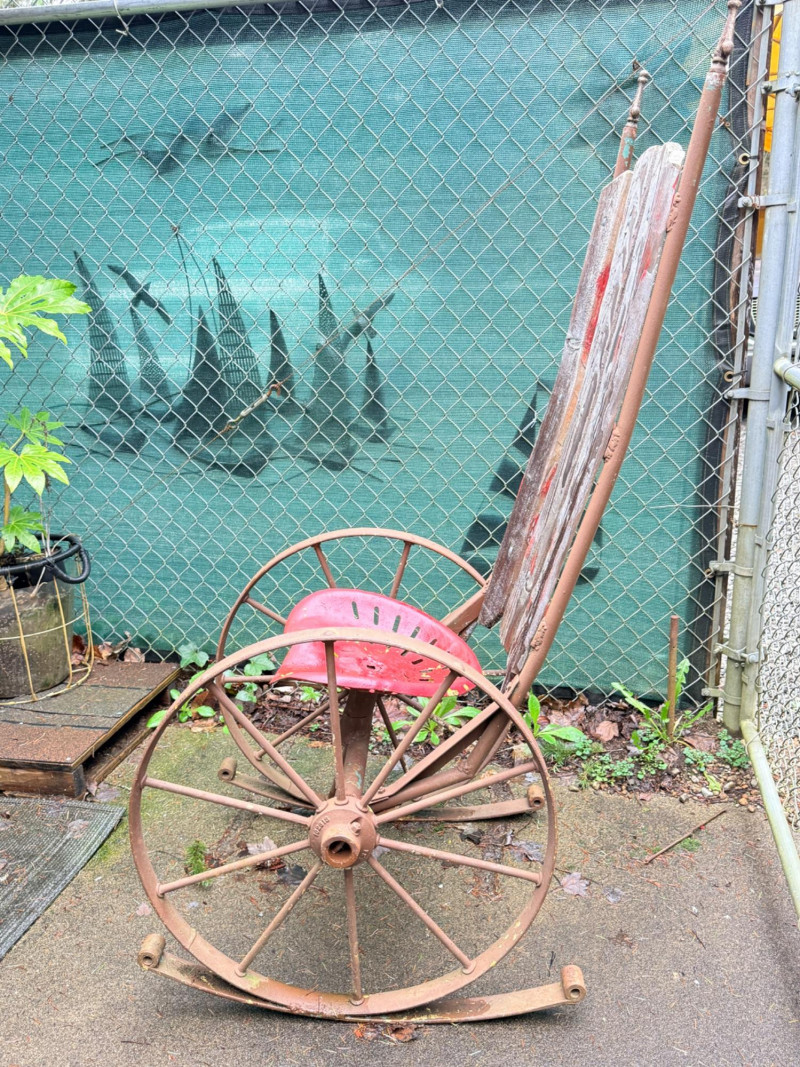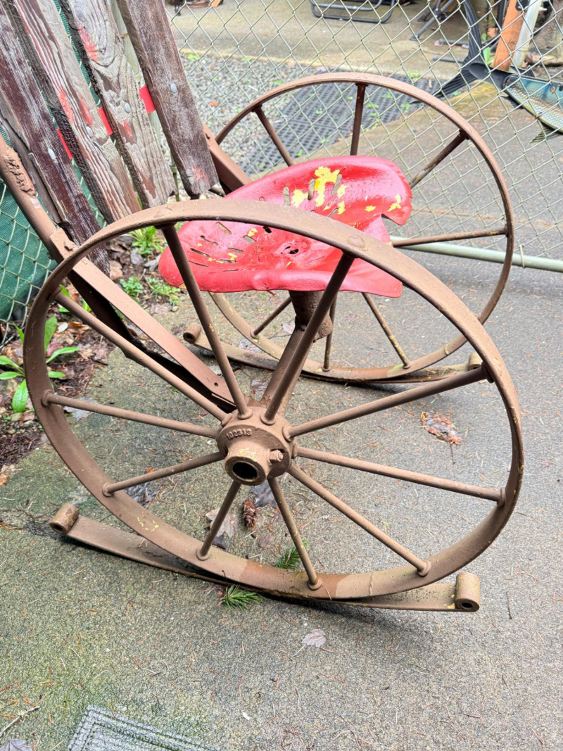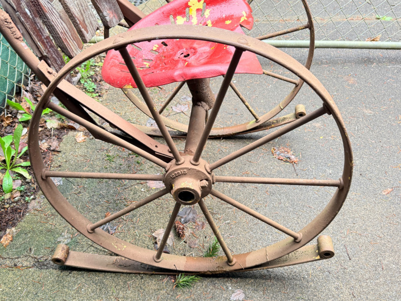 Metal tractor seat and iron spoke wheels mounted on leaf springs. Weathered wood slat back with iron garden finials. One of a kind, for sure. 26” wheel diameter