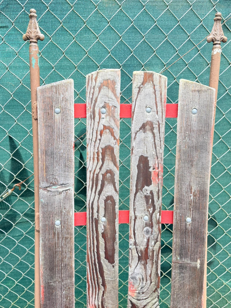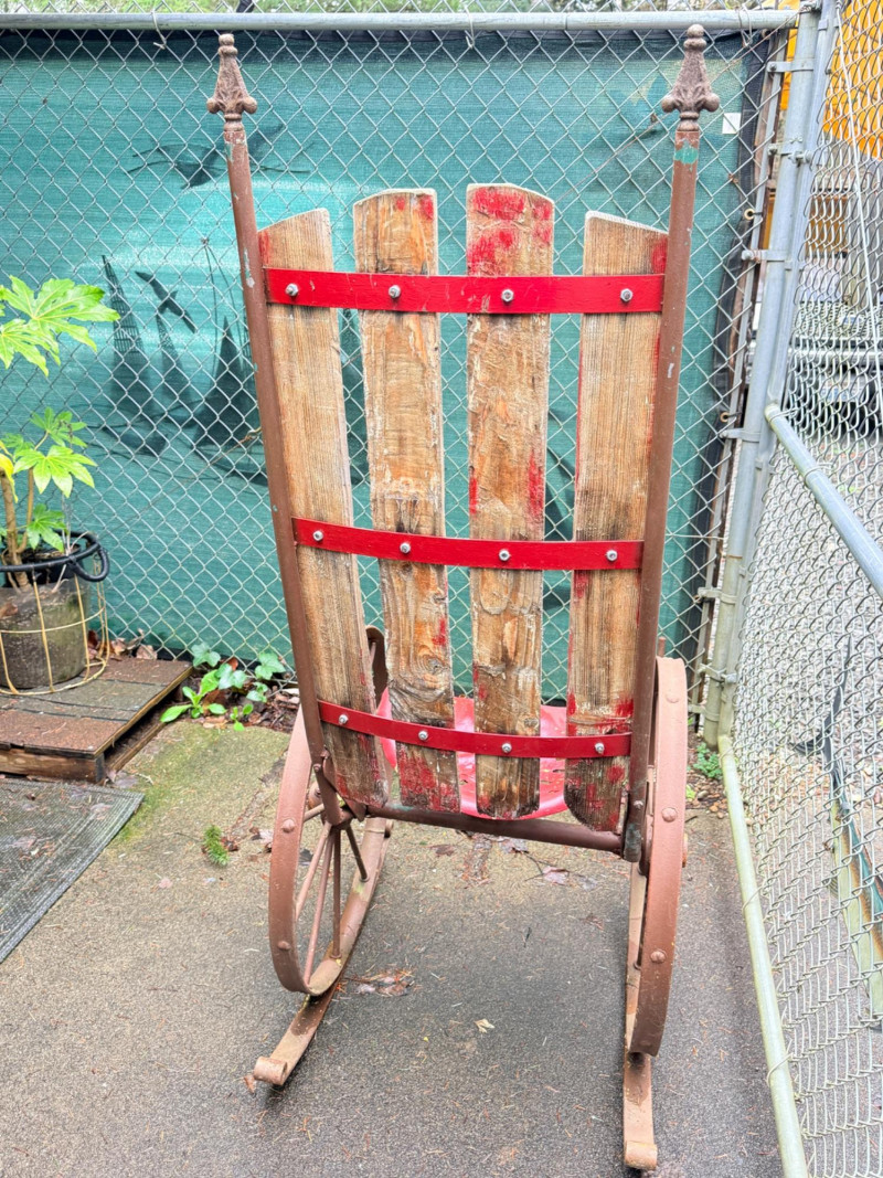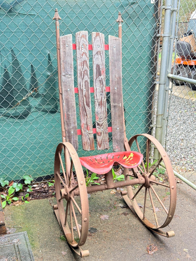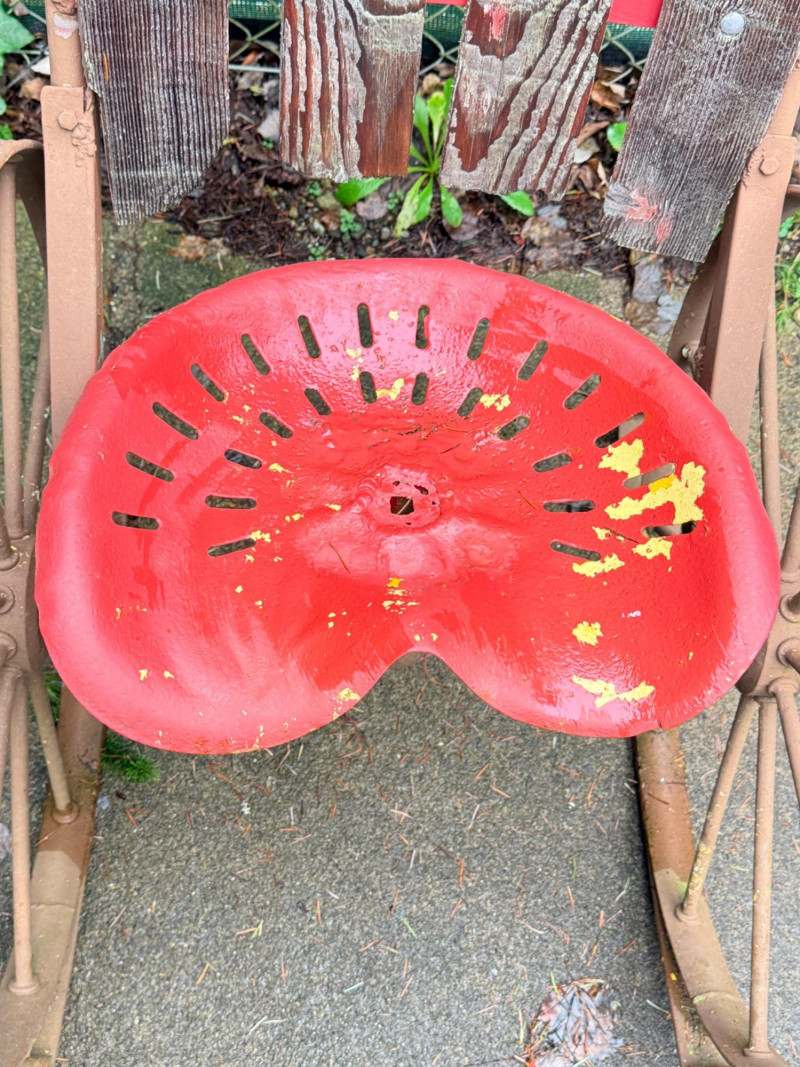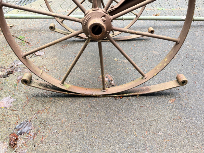 Metal tractor seat and iron spoke wheels mounted on leaf springs. Weathered wood slat back with iron garden finials. One of a kind, for sure. 26” wheel diameter