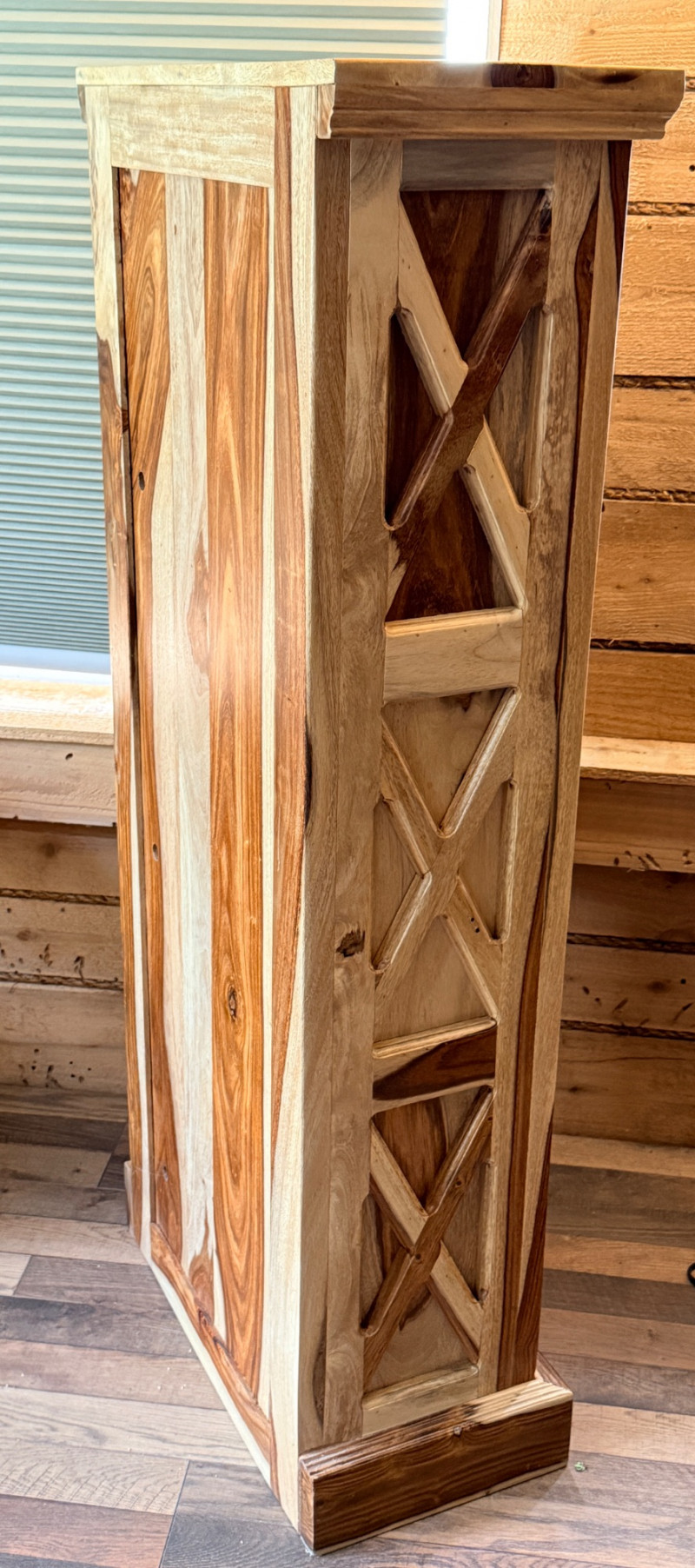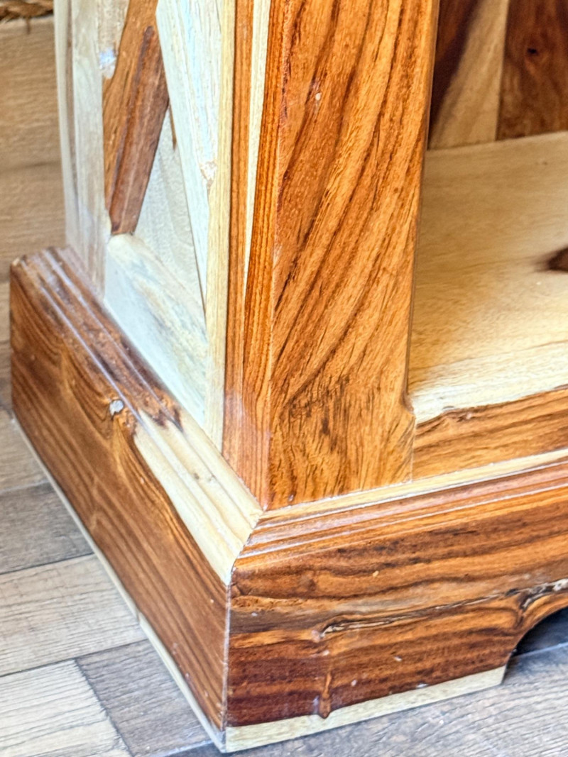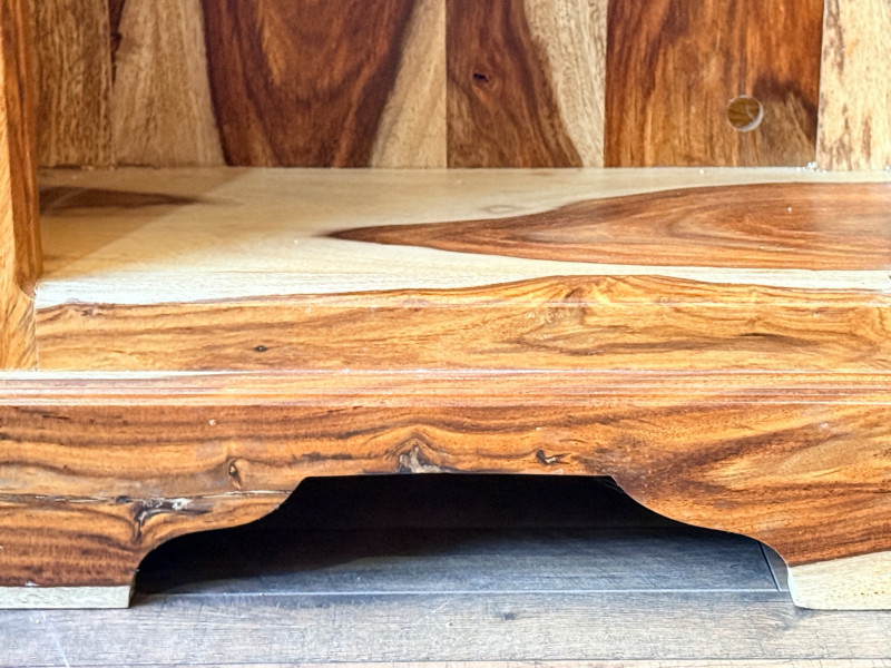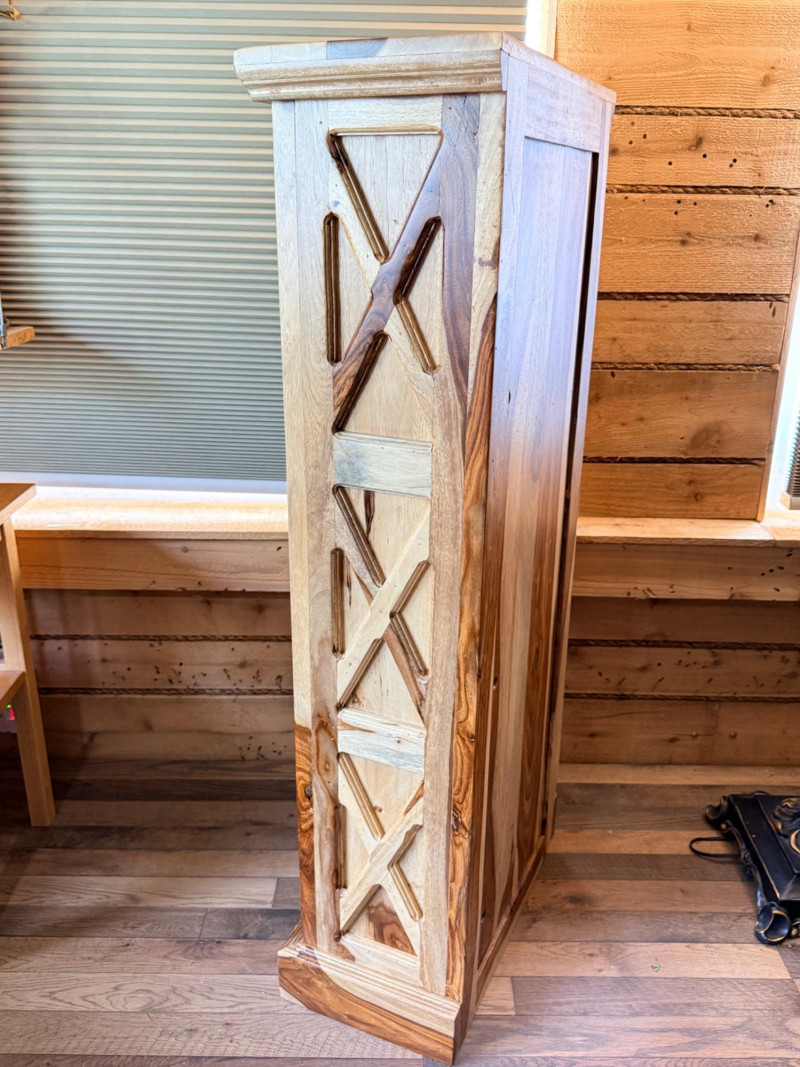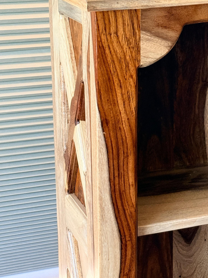 Features open shelving with hand-carved accents and a natural finish that highlights the wood's organic signature.