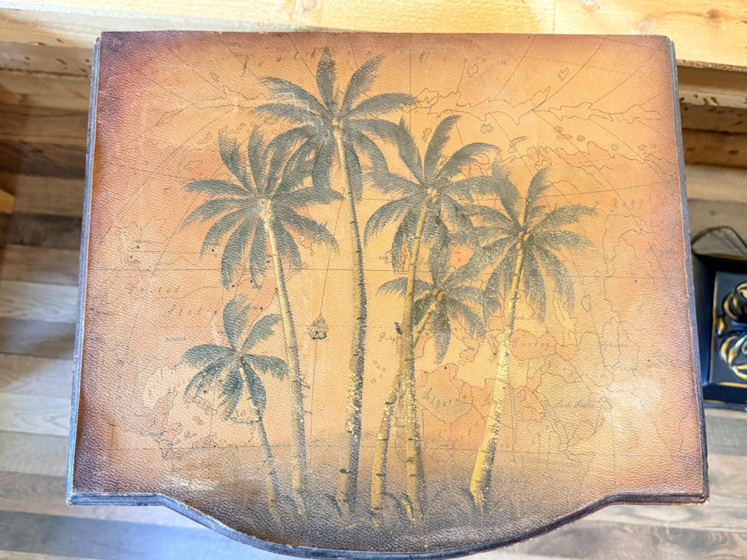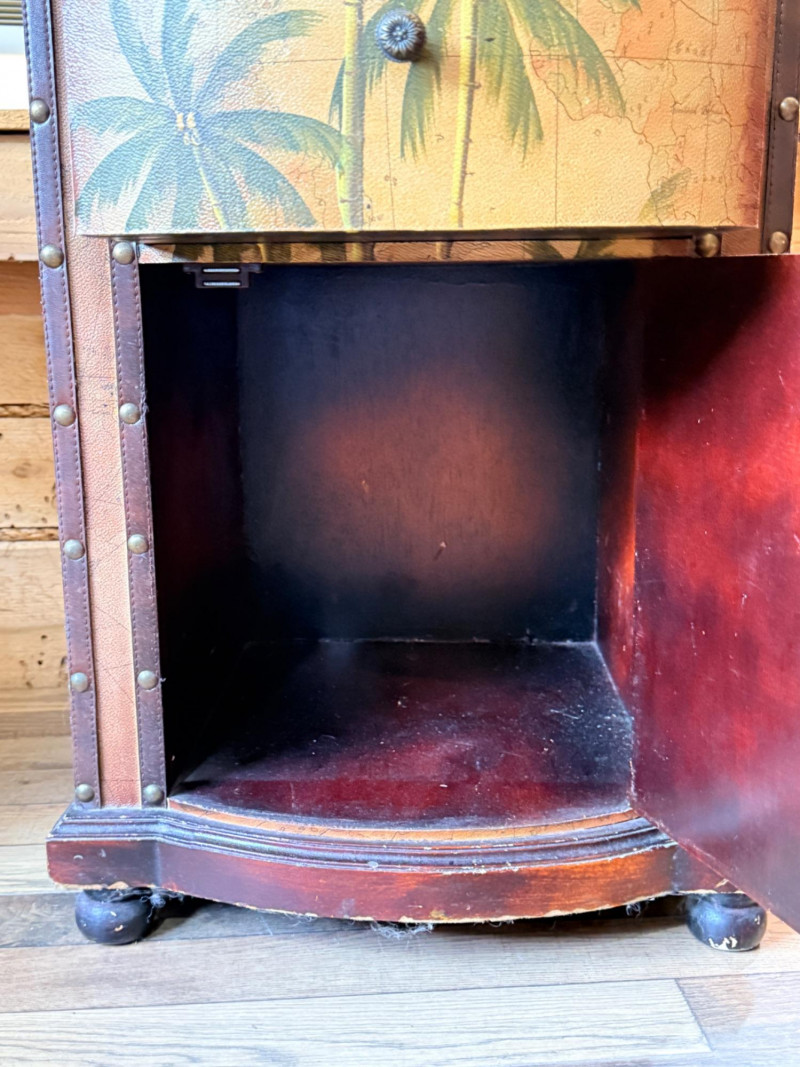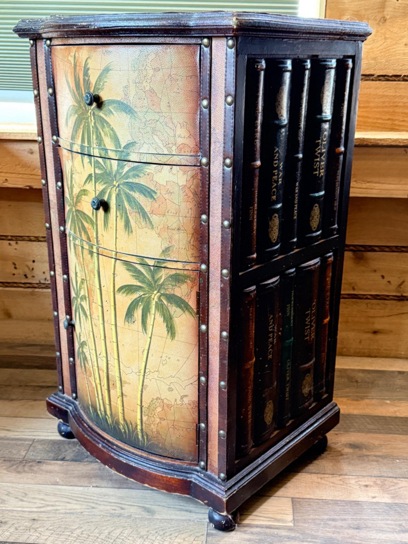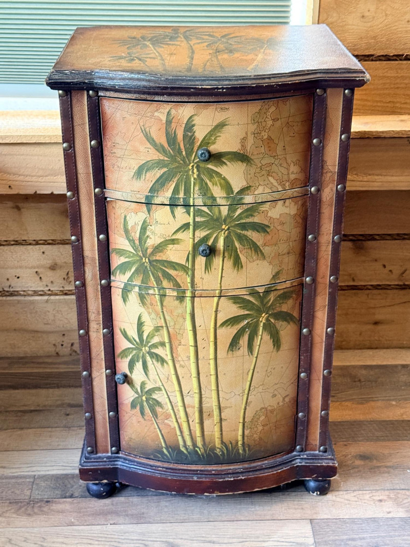 Tarina Tropical Storage Cabinet, featuring hand-painted palm trees on a vintage map background and leather-wrapped top and door/drawer fronts with brass stud detailing. Faux book sides.