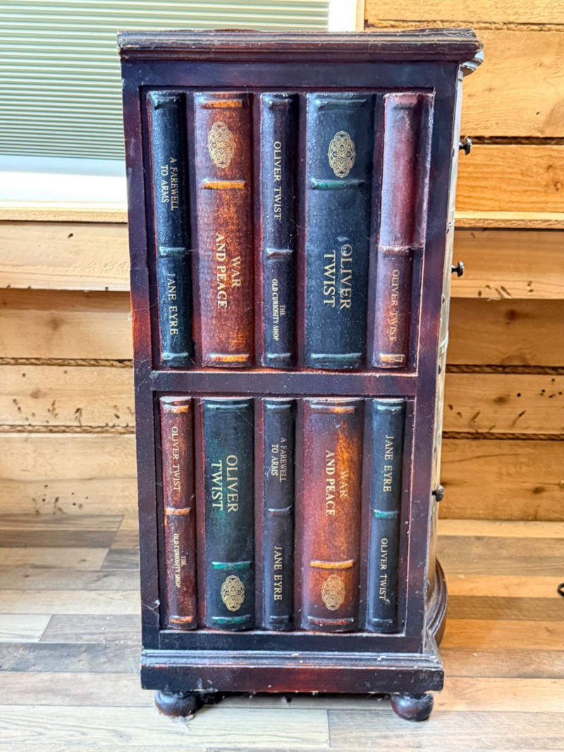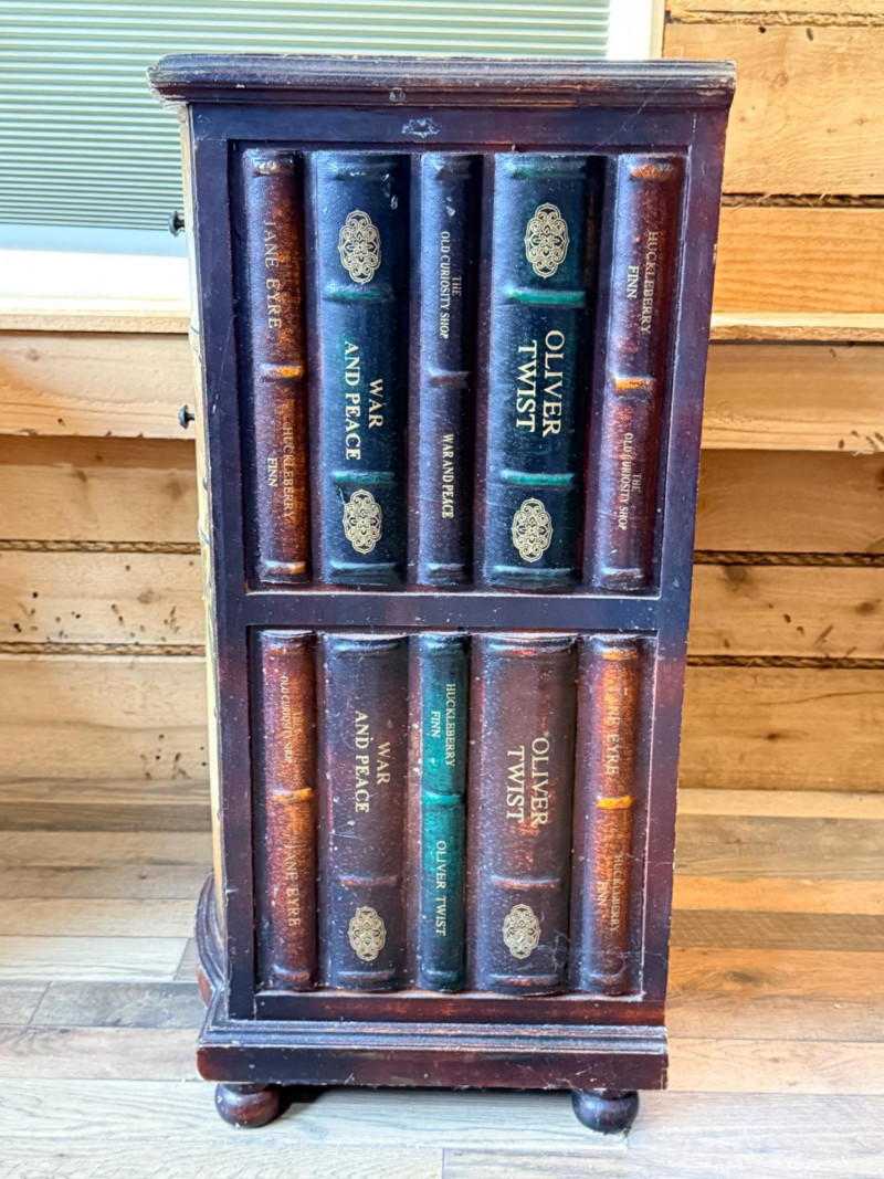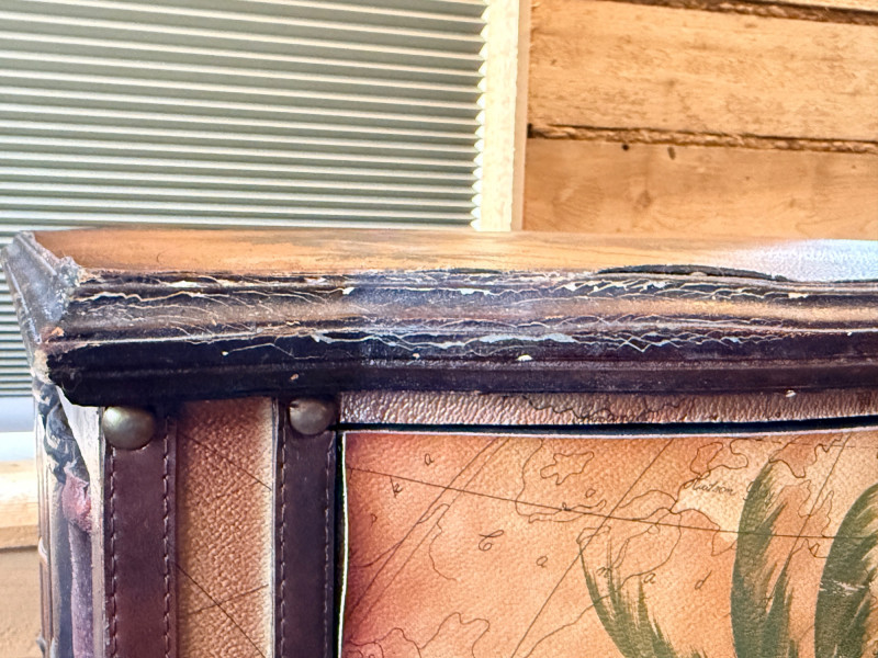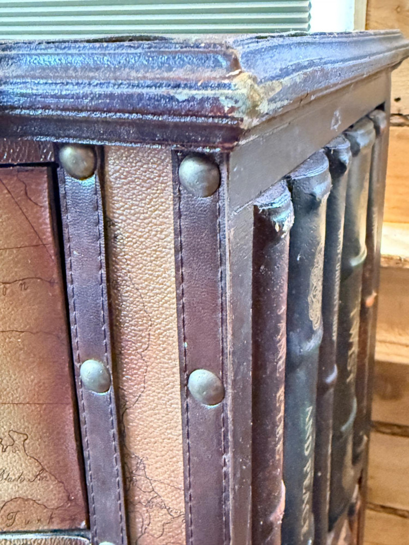 Tarina Tropical Storage Cabinet, featuring hand-painted palm trees on a vintage map background and leather-wrapped top and door/drawer fronts with brass stud detailing. Faux book sides.