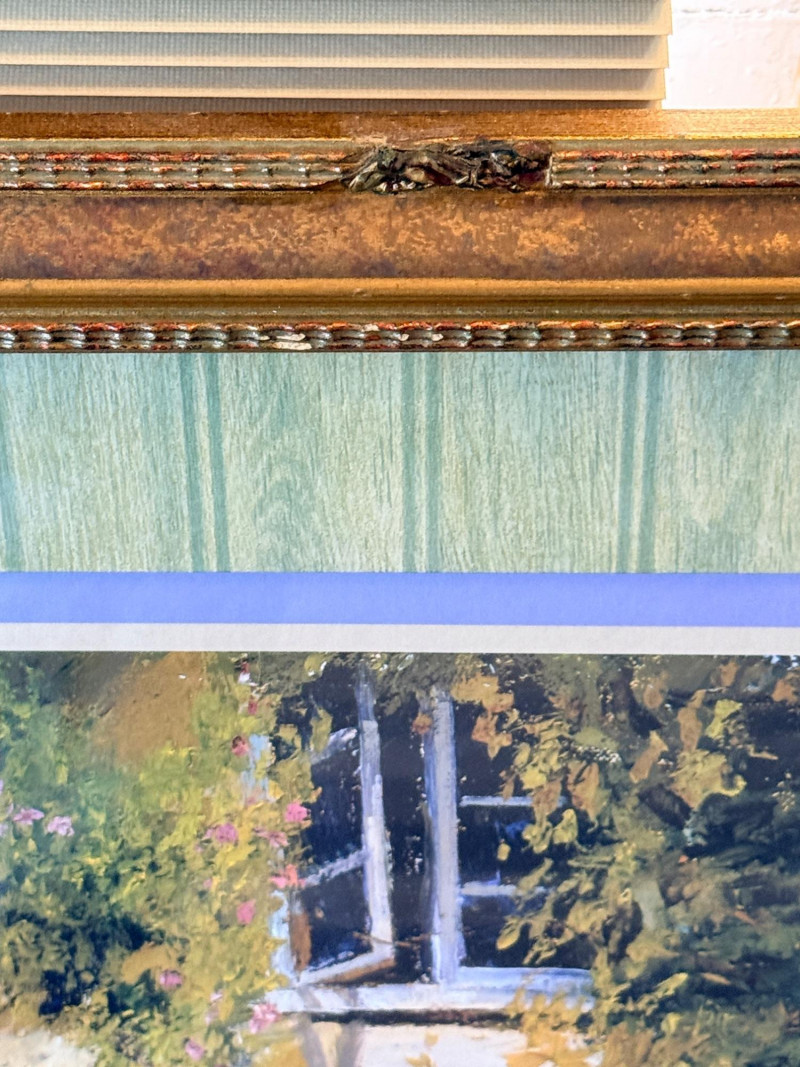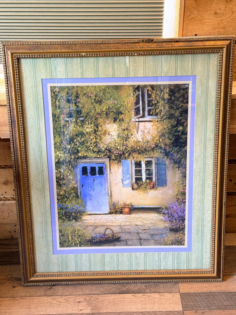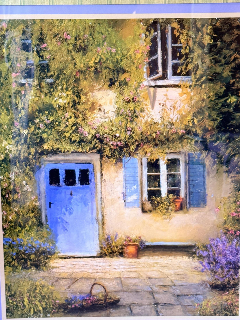 The art depicts a charming European-style cottage entrance with a distinctive blue door and shuttered windows, heavily draped in greenery and flowers