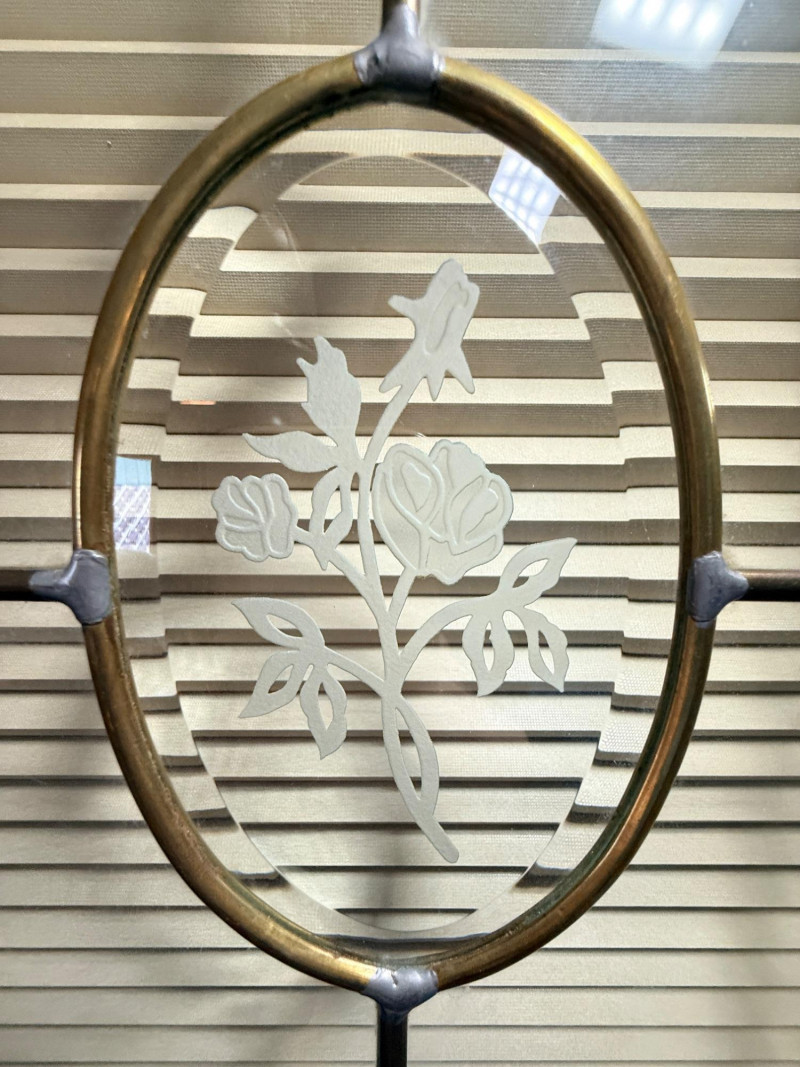 Leaded glass panel surrounded by an etched leafy design, 2 bevel diamonds and roses etched on an oval bevel center point.