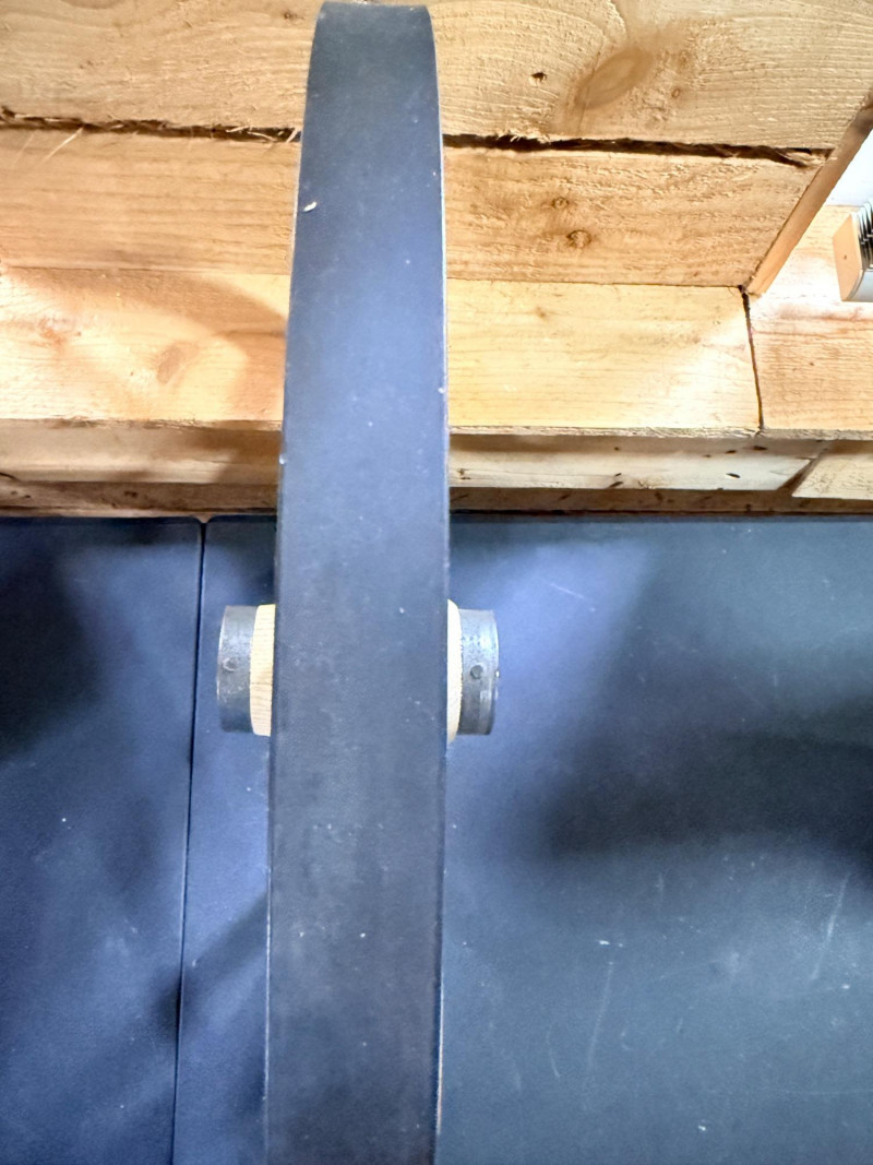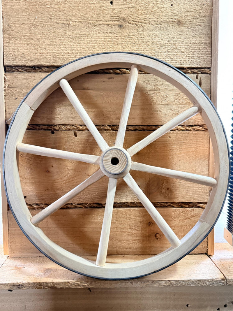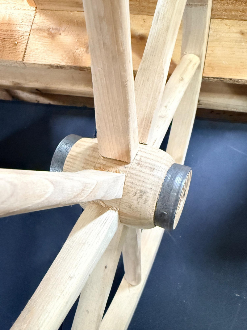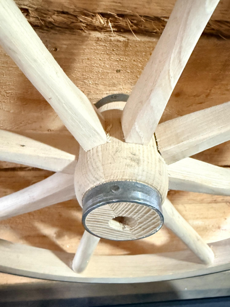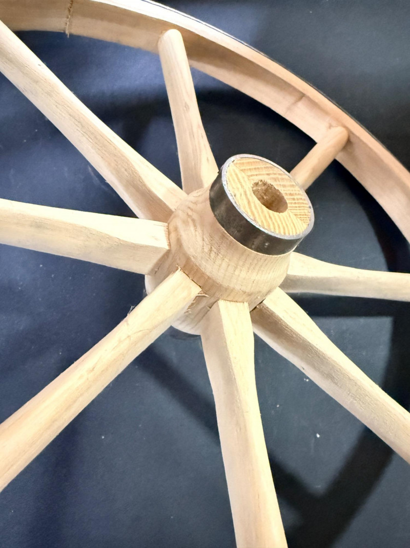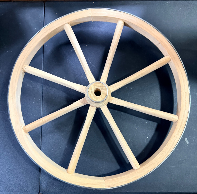 Decorative Wood Spoke Wheel Raw wood wrapped in metal.