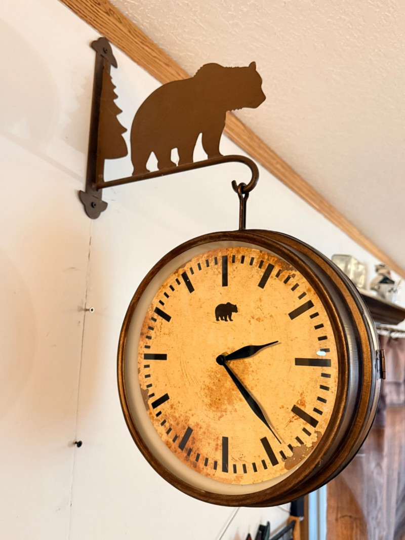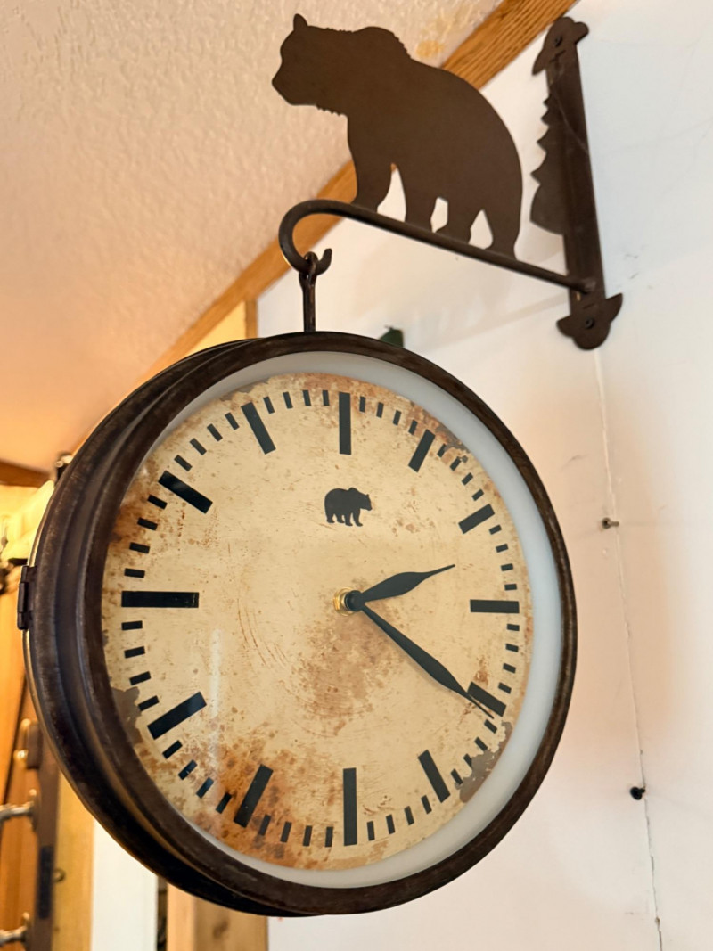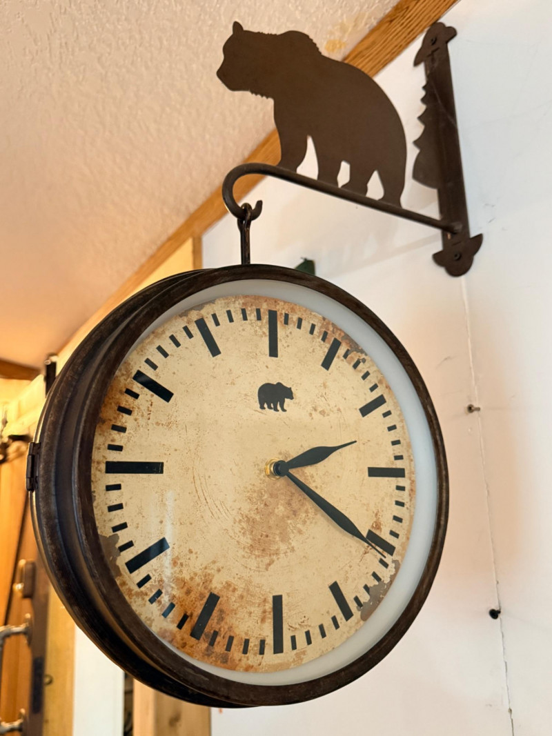 Double Faced Metal Bear Wall Clock This two-sided metal clock allows you to read time information easily at any angle. A large dial scale and a wide 9-inch diameter glass make the time easy to read from up close and far away. No seconds hand, more silent.