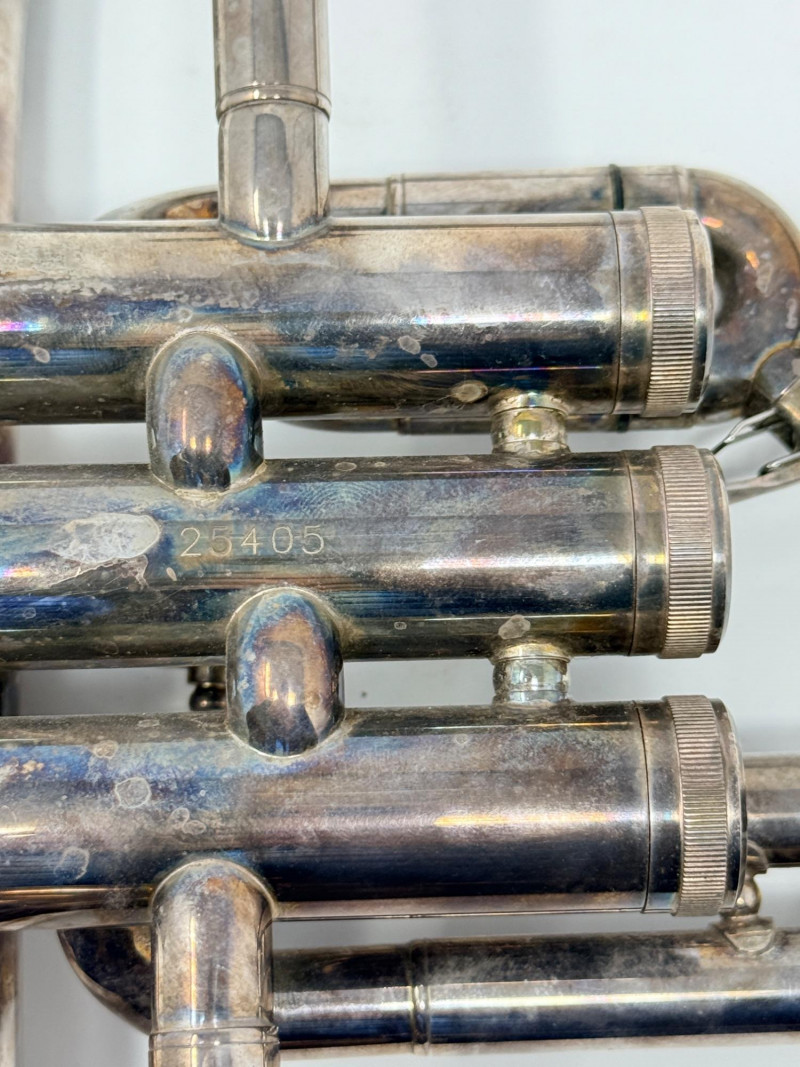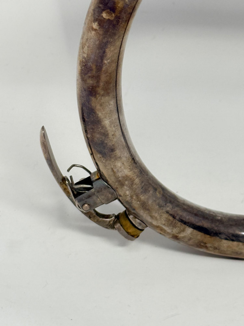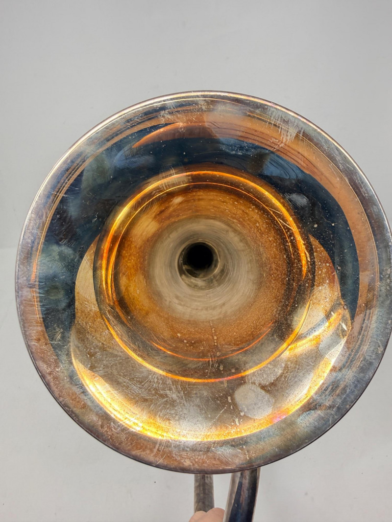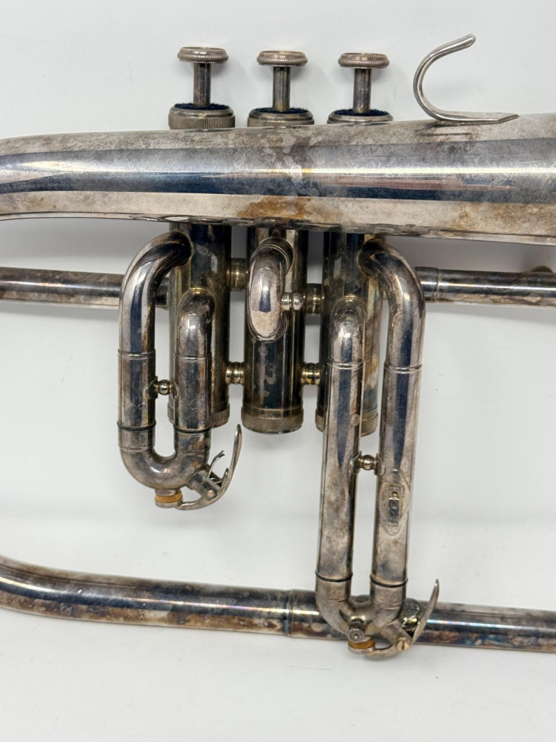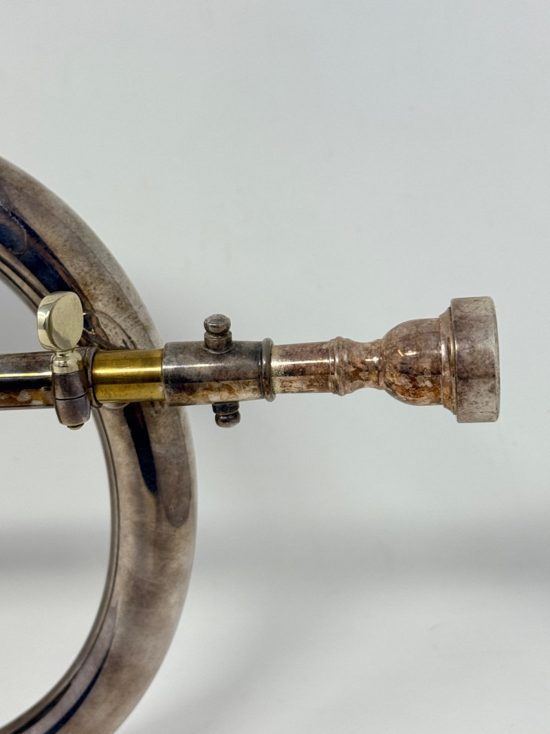 The instrument has a silver-plated finish that is showing significant patina and tarnish from age.