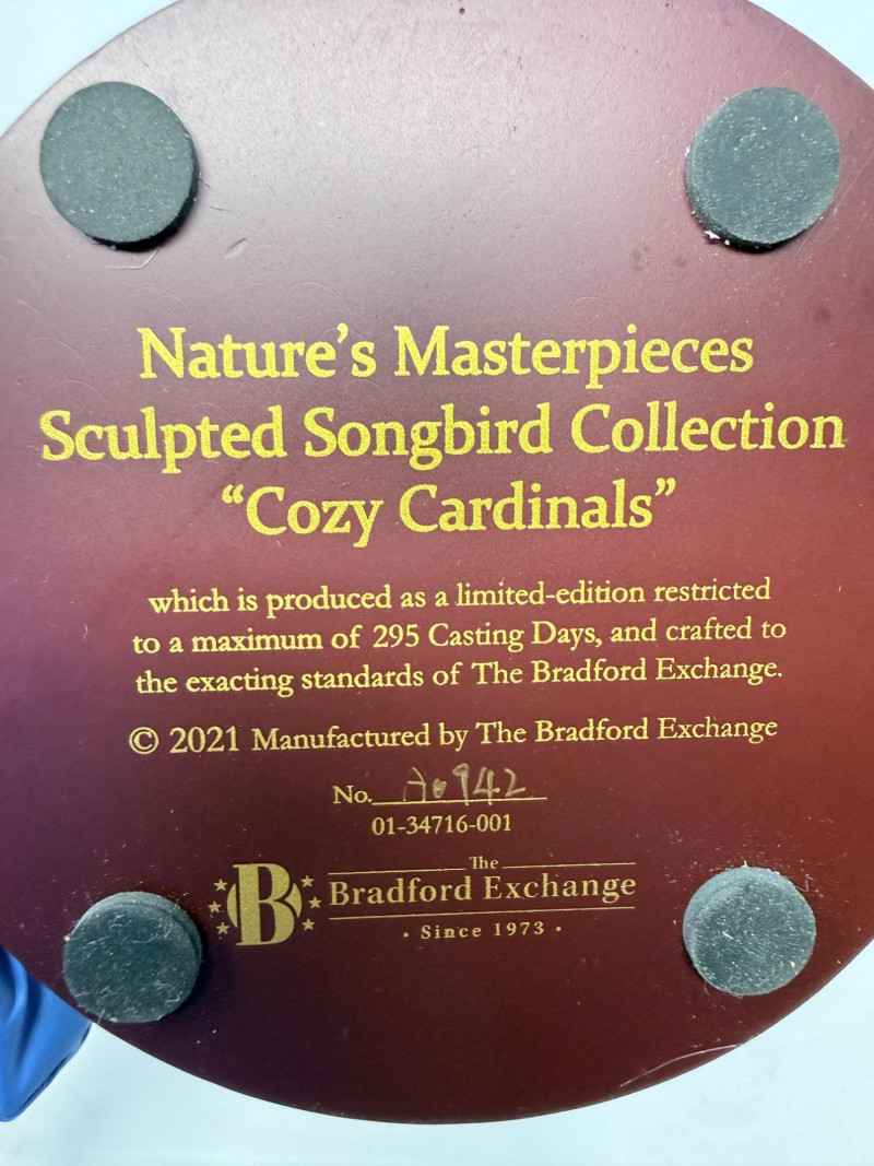 Natures Masterpieces Sculpted Songbirds “Cozy Cardinals“ limited edition hand painted sculpture by The Bradford Exchange in 2021. 7”x10”