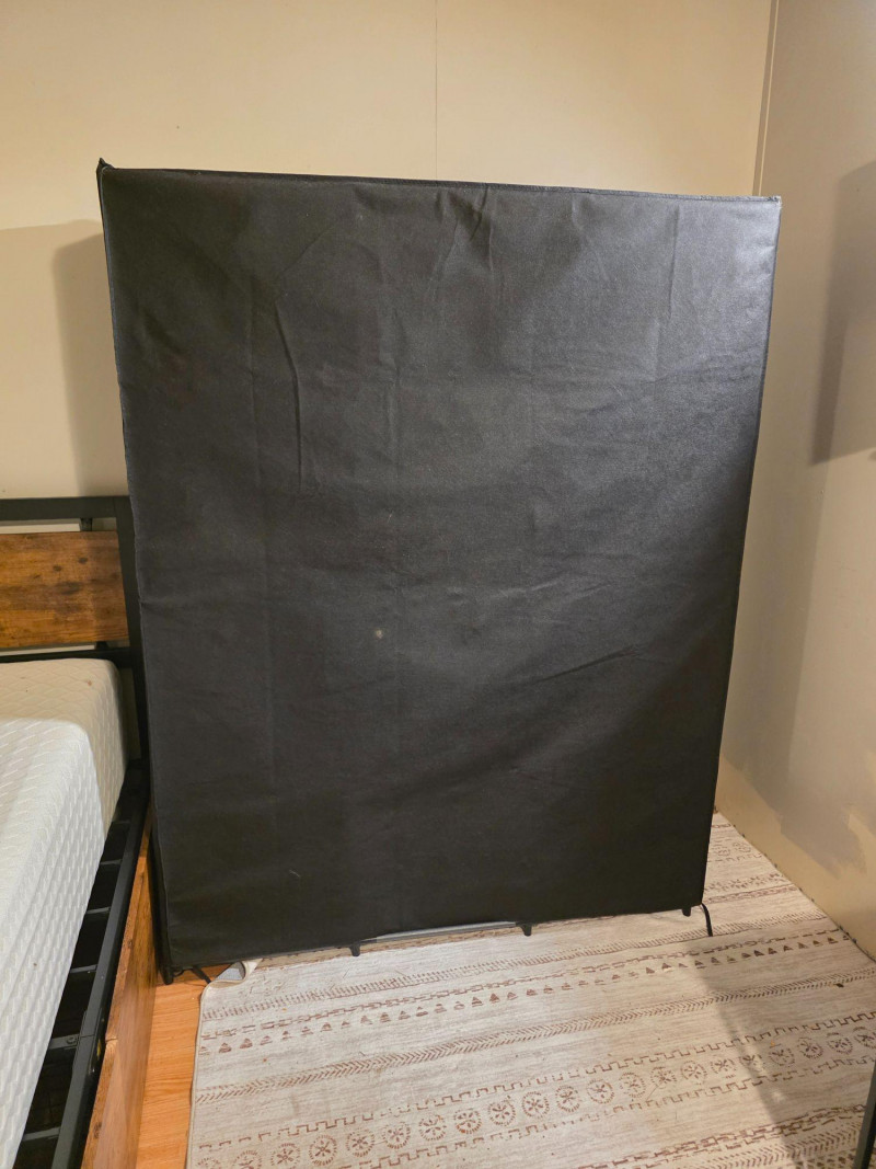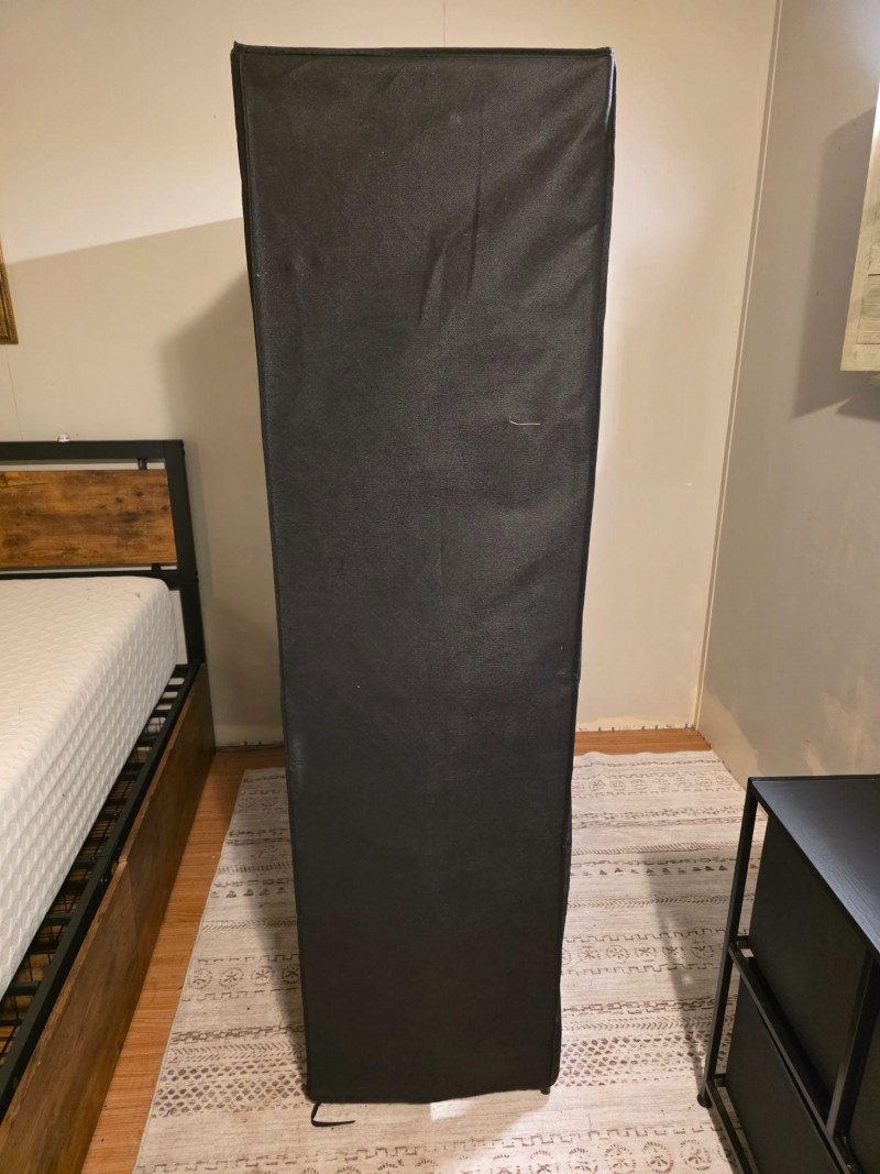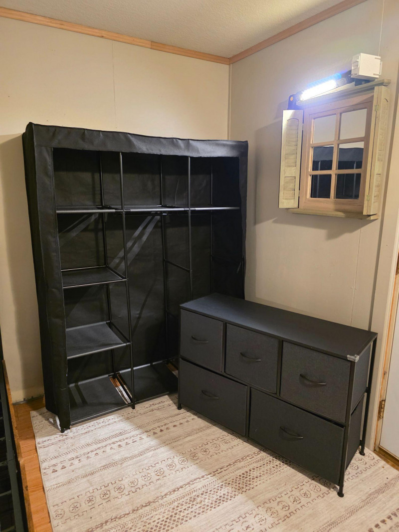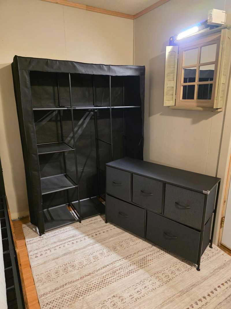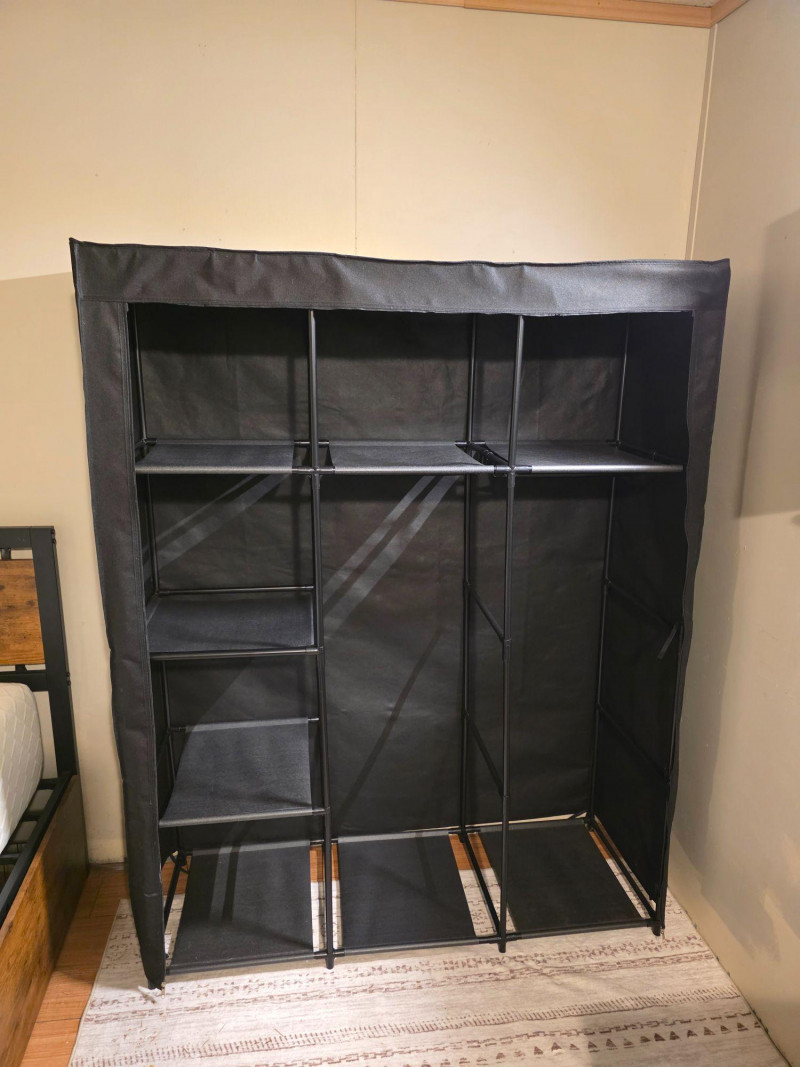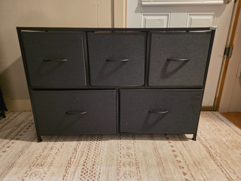 5-drawer Fabric Dresser Storage & Portable Fabric Wardrobe Closet Organizer 5-drawer dresser has a metal frame and MDF top with a black wood-grain finish Includes (3) 11.5"T x 12.5"W x 13"D & (2) 11.5"T x 19"W x 13"D folding fabric drawers Dresser: 27"T x 40"W x 13"D Black portable closet organizer has 6 cubbies for folding clothes/shoes and hangbar closet area with a fabric enclosure & metal tube frame The zipper flap to enclose the front has been cut-off Closet: 65"T x 51"W x 17.5"D