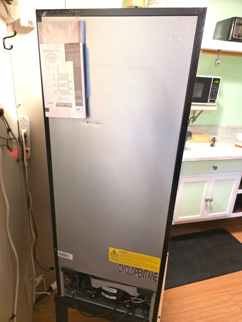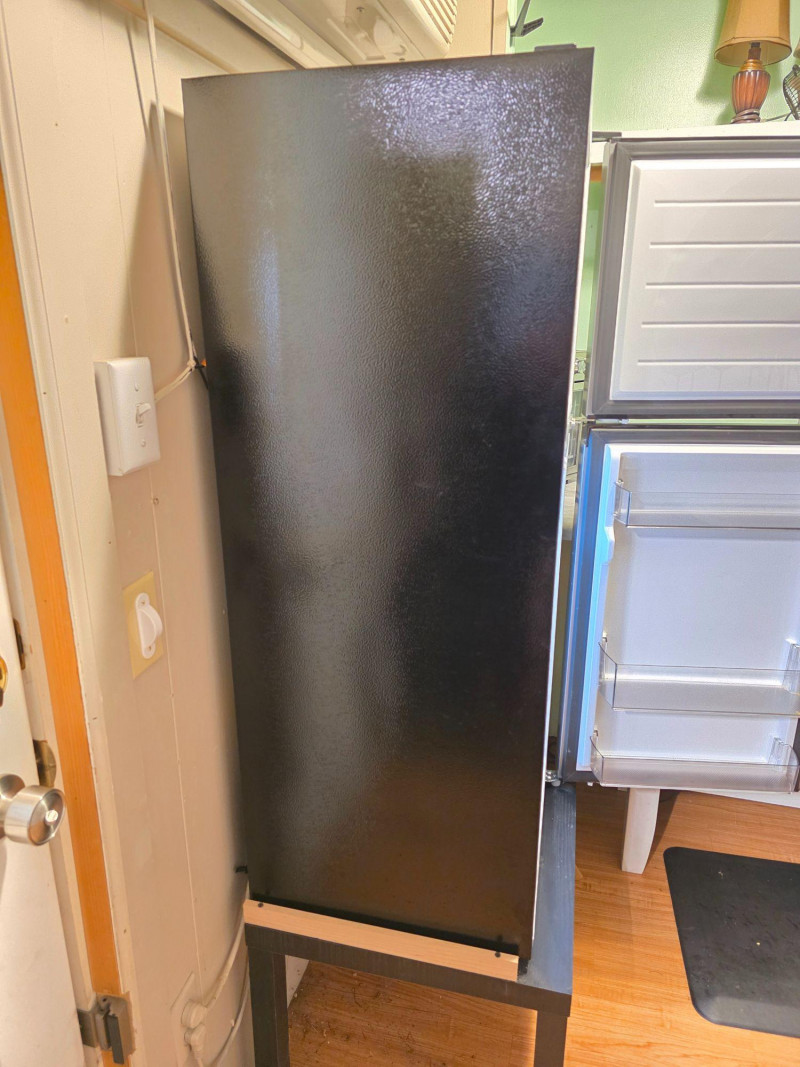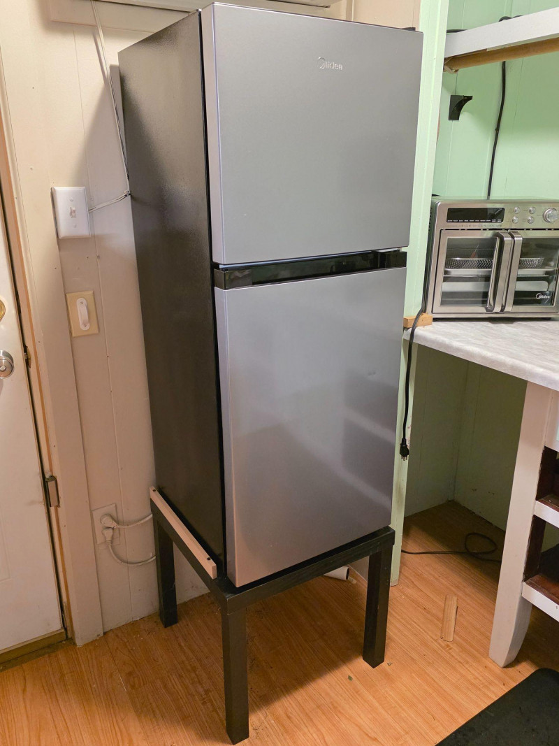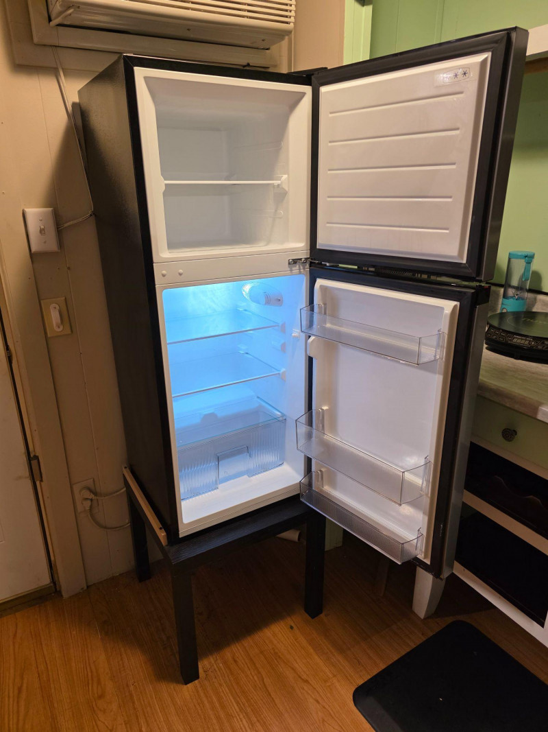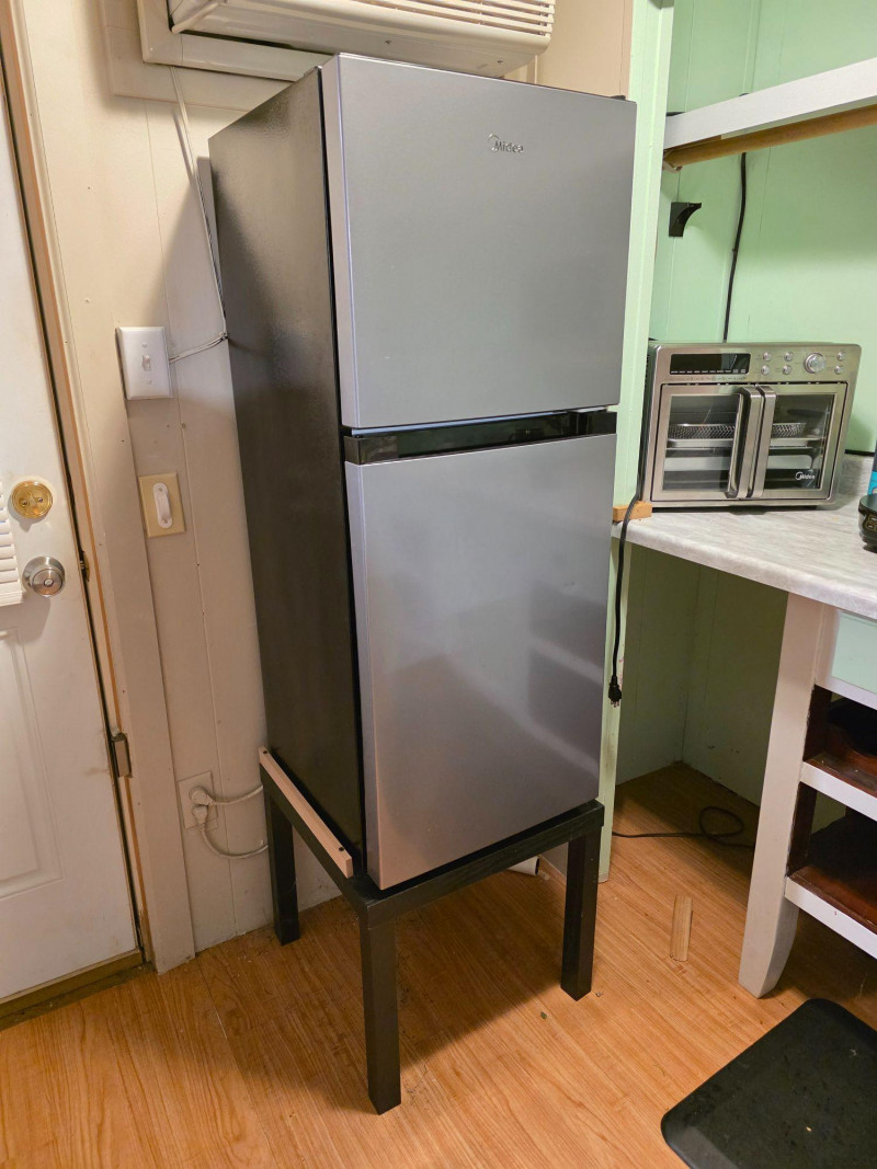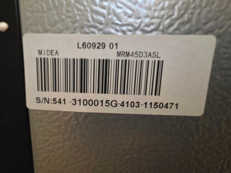 Midea 4.5 cu. ft. 2-Door Compact Refrigerator Midea Model #MRM45D3ASL Stainless steel front & black Capacity: 4.5 cubic feet. Design: Two-door configuration with a dedicated top freezer compartment. Features: Includes a crisper drawer and adjustable glass shelves Flexibility: Reversible doors for left or right opening installation Includes black MDF 17.5"T stand Tested - Works!