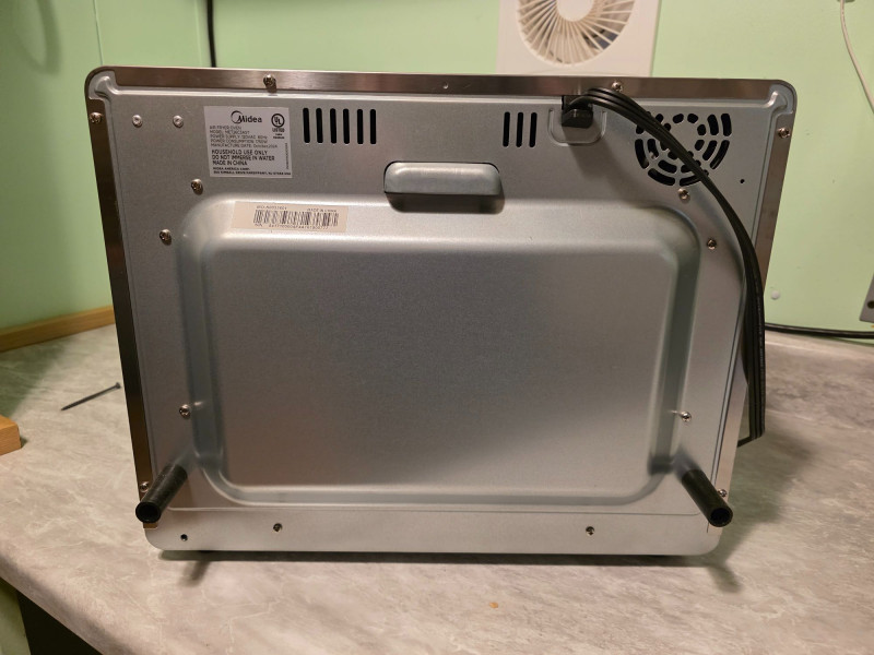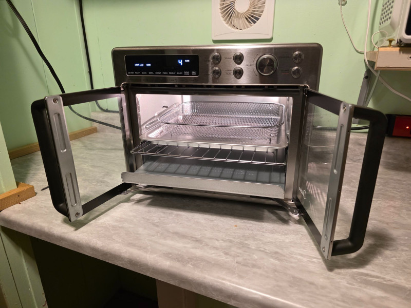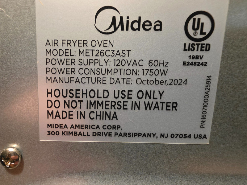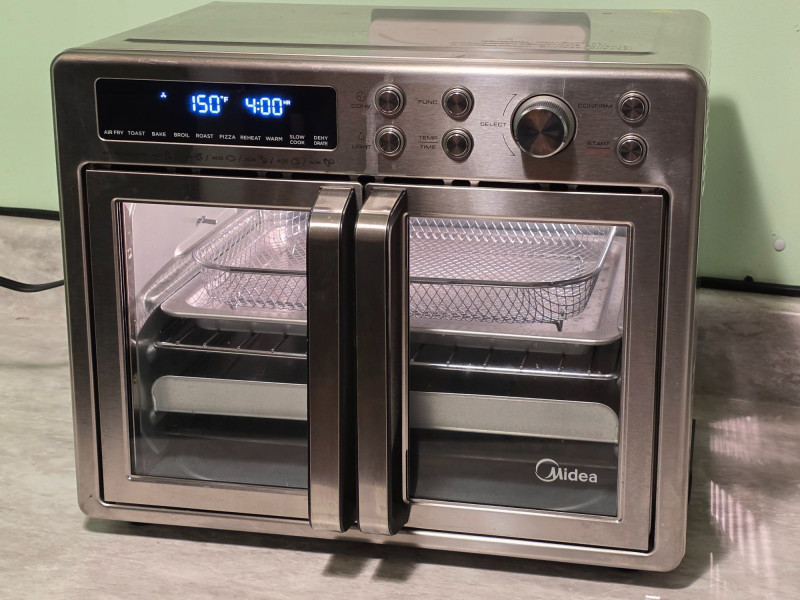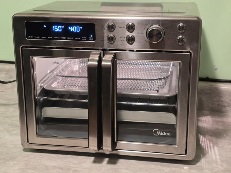Midea Flexify French Door Toaster Oven Air Fryer Combo Idea Model #MET26C3AST Features a large 26.4-quart capacity with a convenient double French door design for easy access. Offers 10 preset cooking options including Air Fry, Roast, Bake, Broil, Toast, Pizza, Reheat, Slow Cook, Dehydrate, and Warm. Utilizes a cyclone convection system with six heating elements and one fan for 25% faster cooking and 90% less oil usage compared to traditional fryers Includes pull out tray, adjustable rack, basket, and pan Very clean, hardly used! Tested - Works! 13 5"T x 16.5"W x 12.5"D