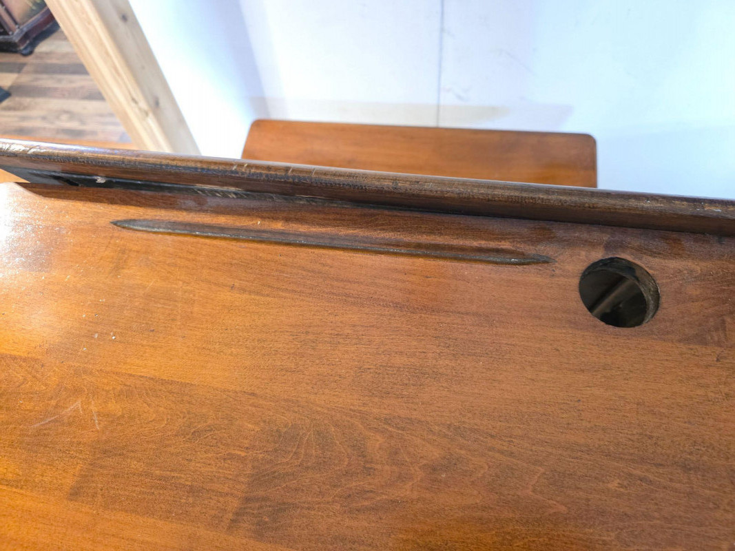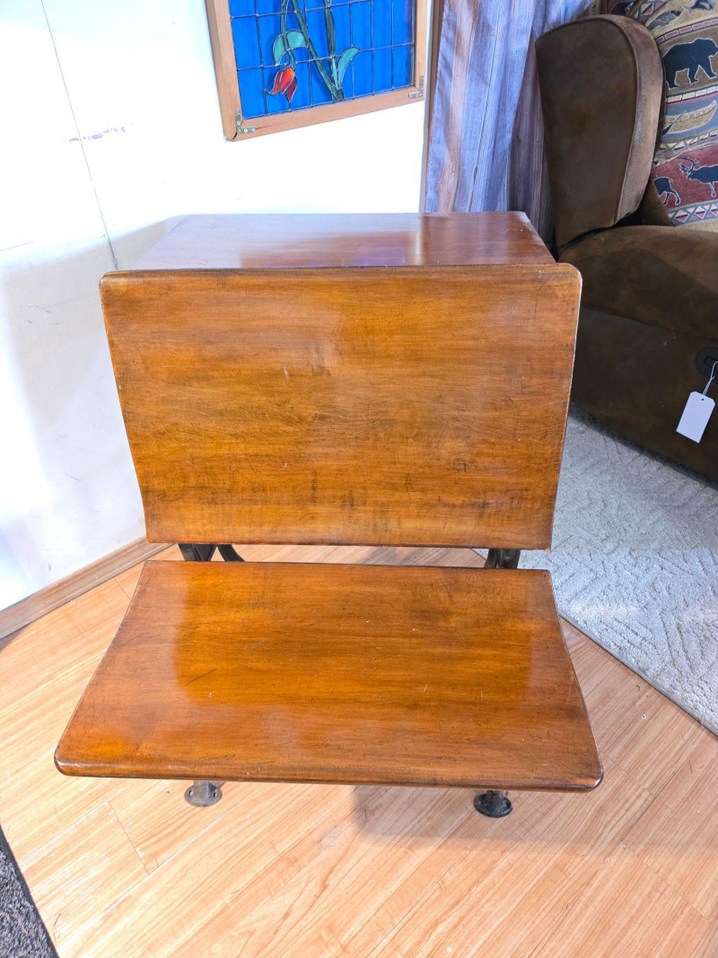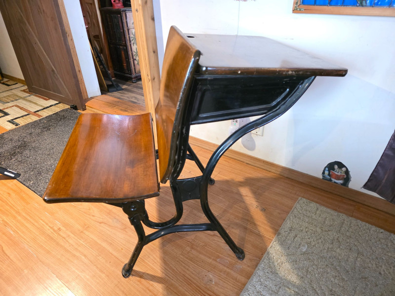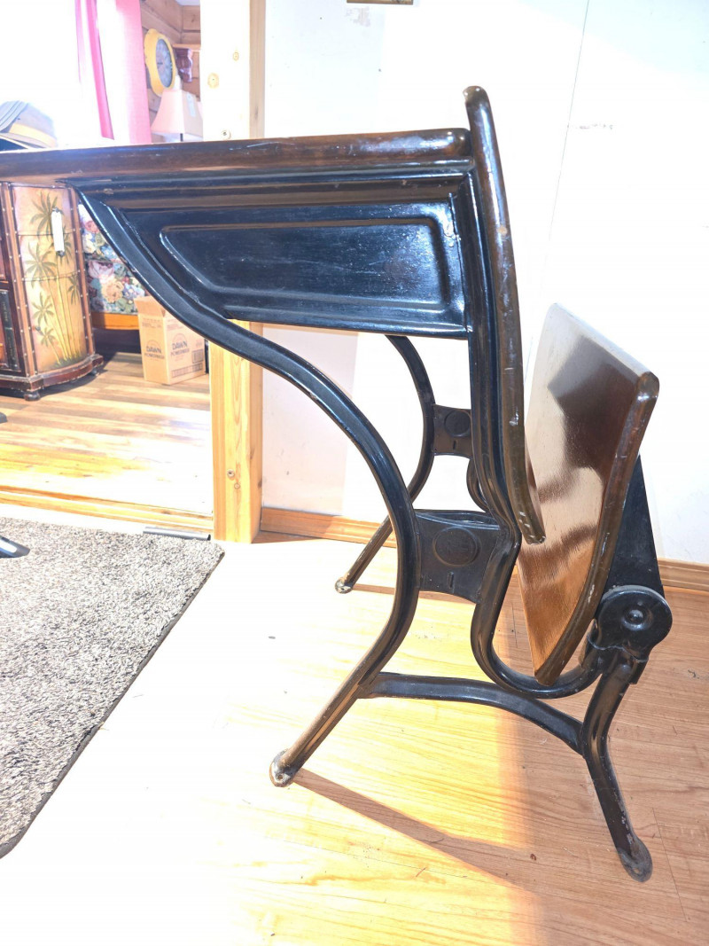 Antique Children's School Desk - Cast Iron & Hardwood Antique school desk, specifically a model by the American Seating Company, Chicago Likely manufactured between 1911 and the 1920s Features a solid hardwood top and seat with a cast-iron frame Includes a sloped writing surface, an inkwell hole, and a hinged seat that flips up for storage and easier cleaning Originally designed as part of a row, with the seat attached to the desk behind it Nice vintage condition, see pics! Seat height: 17.5" 32"T x 30"L x 23.25"W