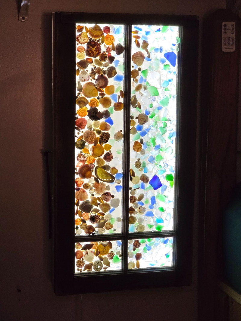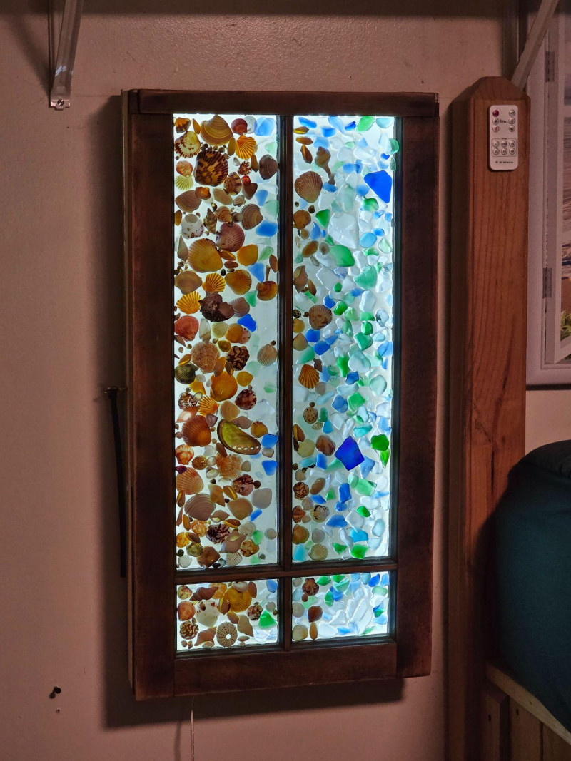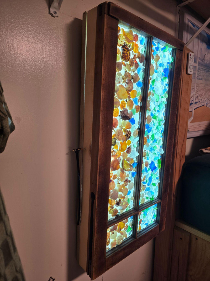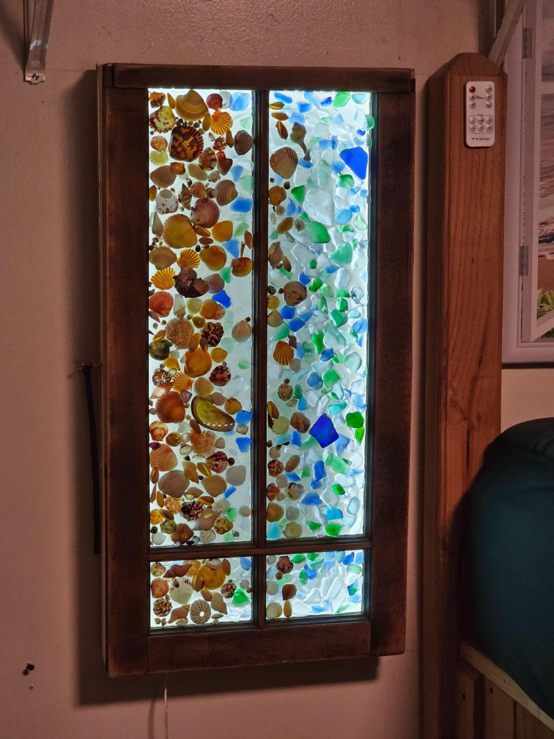 Coastal-Inspired DIY Sea Glass & Shell Mosaic Backlit Window Art Piece Hinged wood frame with sea glass & shell mosaic backlit with remote-controlled LED light strip inside Tested - Works! 31"T x 16"W x 4"D