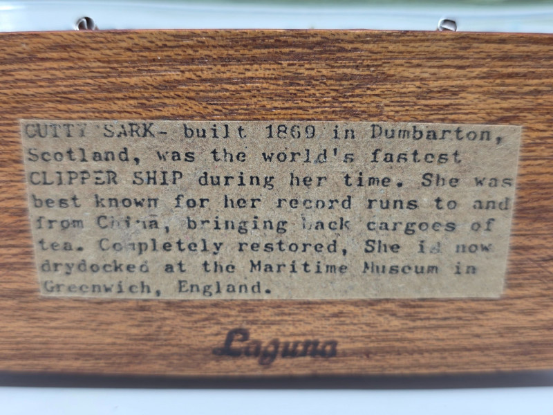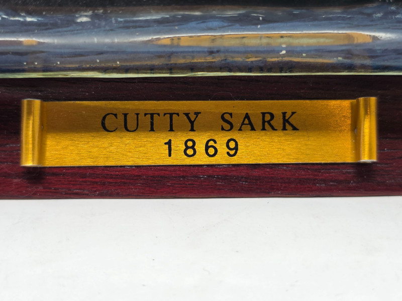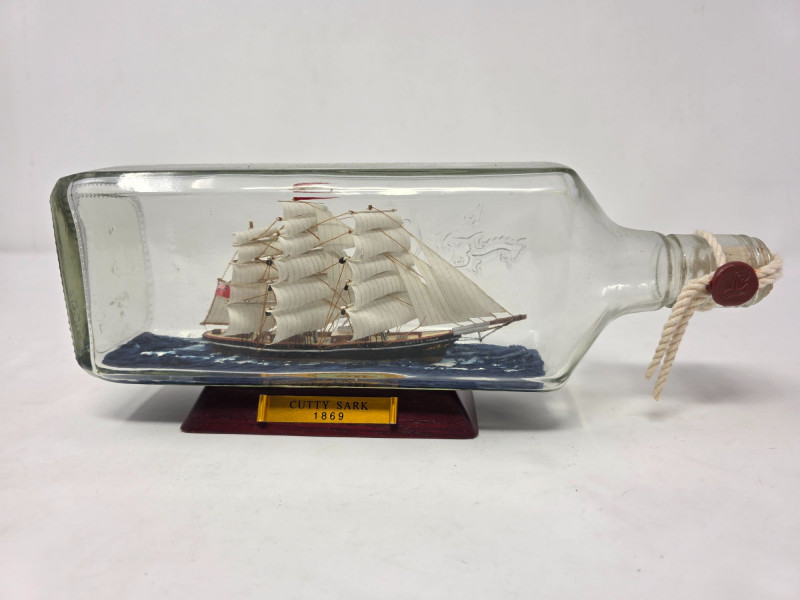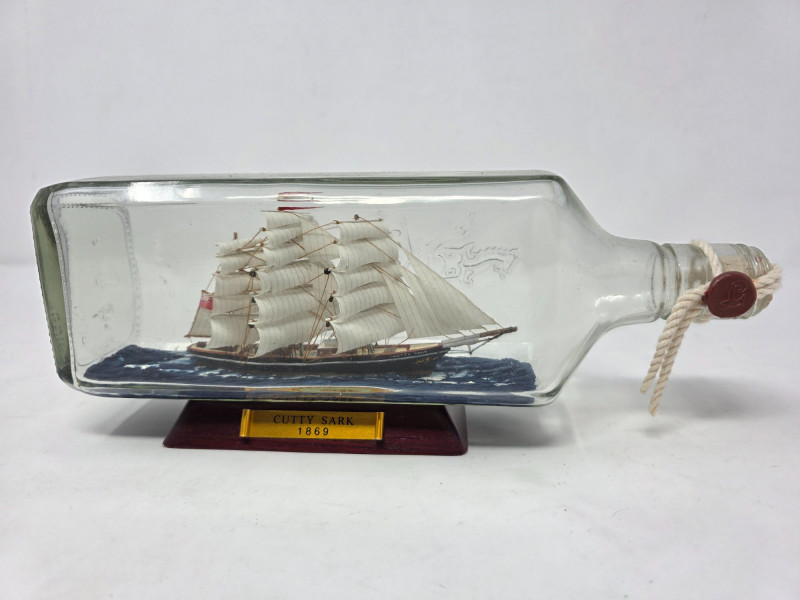 Model Of The Clipper Ship Cutty Sark Handcrafted In A Glass Bottle Decorative miniature model of the clipper ship Cutty Sark (labeled 1869) handcrafted inside a glass bottle, designed to sit on a wooden stand Cutty Sark clipper ship replica Encased in a glass bottle with sealed cork and a polished wooden base Story of the "Cutty Sark" is on the bottom See pics for condition! 4"T x 10.5"L x 2.25"W