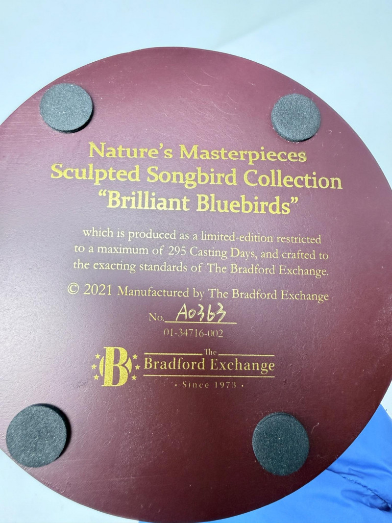 Bradford Exchange Natures’s Masterpieces Sculpted Songbird Collection "Brilliant Bluebirds" sculpture. Hand cast and hand painted in 2021, limited edition No. AO363 7”x10”