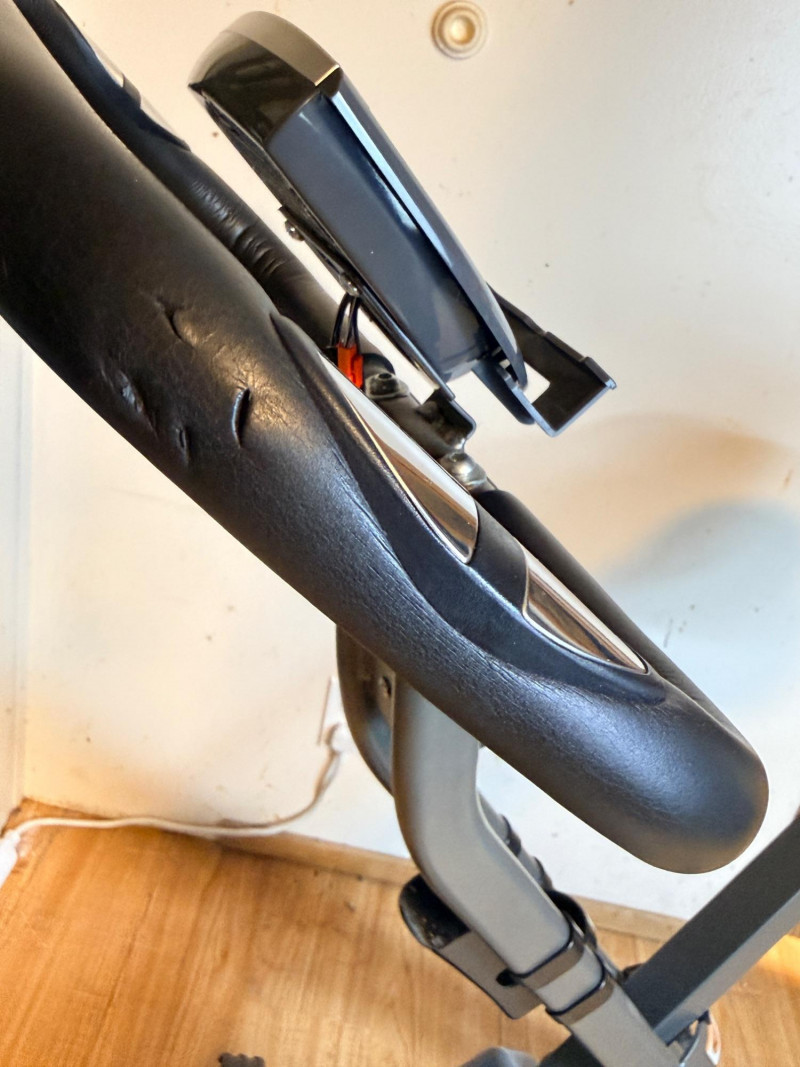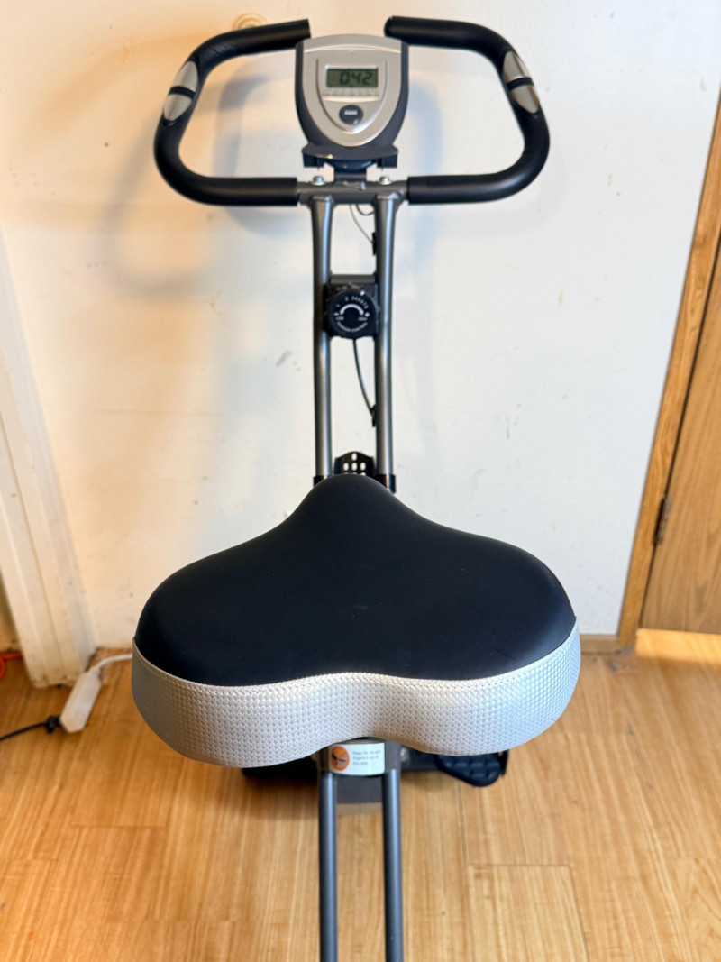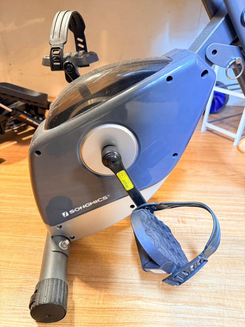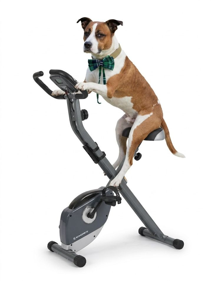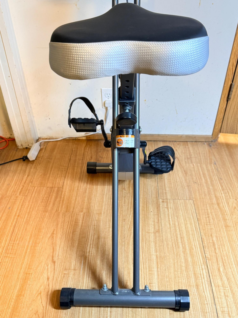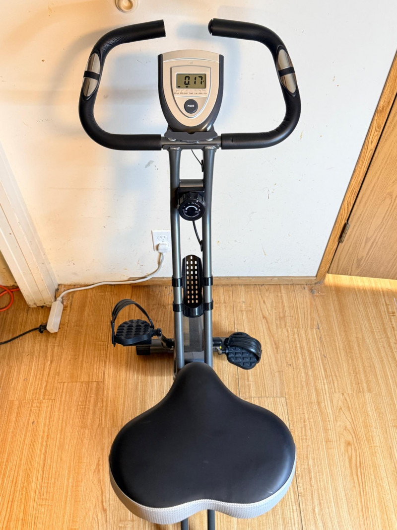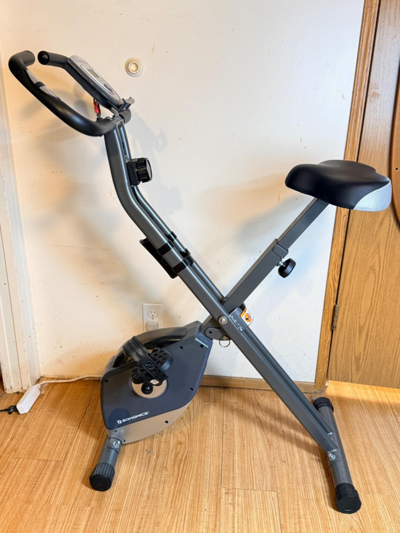 SONGMICS Folding Exercise Bike, known for its compact, space-saving design suitable for home workouts by FredCo International. Equipped with non-slip pedals and adjustable foot straps to ensure stability during exercise. Ensuring quiet operation, it uses a magnetic wheel and belt drive system for a near-silent cycling experience. Tested, works! No animals were harmed in the making of this auction lot. Super cute rider not included. See pics for minor handle damage, otherwise appears in good condition. Measures 36“ x 43“ x 17“ wide