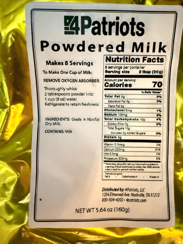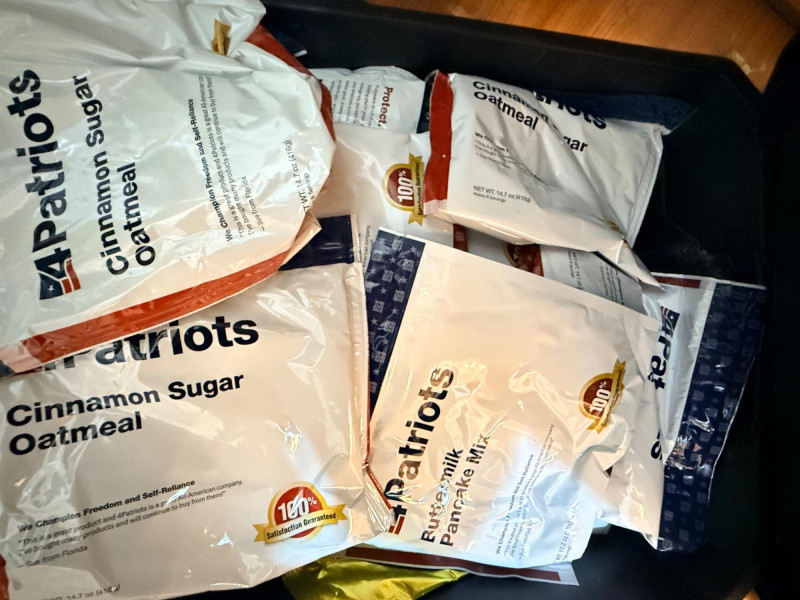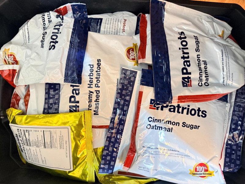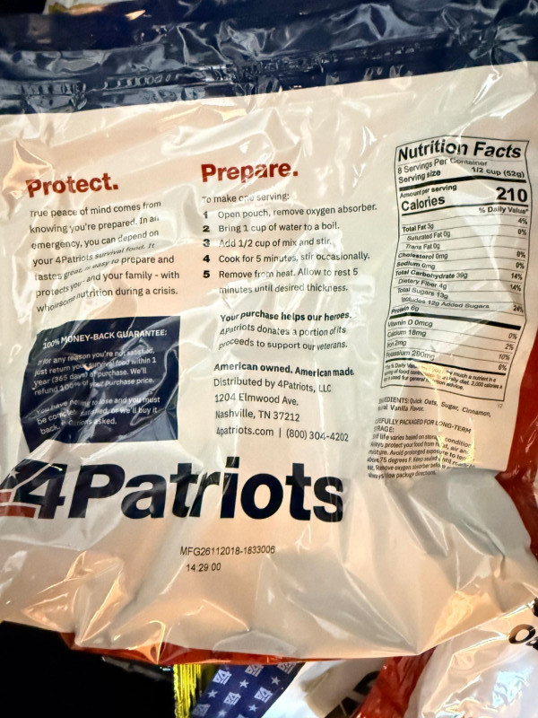 Tote of 38 - 4 Patriots Freeze Dried Food and Beverages cinnamon sugar oatmeal powdered milk white rice strawberry energy drink buttermilk pancake mix nine grain cereal Homestyle chili Mac corn chowder cream of wheat vanilla pudding creamy herb mashed potatoes Purchased in 2018, good until 2043 Tote is 25” x 18” x 8 1/2” tall