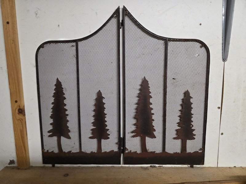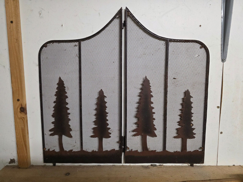 Rustic-Style Metal Trees 2-Panel Fireplace Screen #1 Constructed from durable steel to contain sparks while providing a decorative, forest-themed aesthetic Functional fireplace screens often feature multi-panel hinged designs for ease of use and placement in front of a hearth (2) Panels: 21.5"T x 11"W
