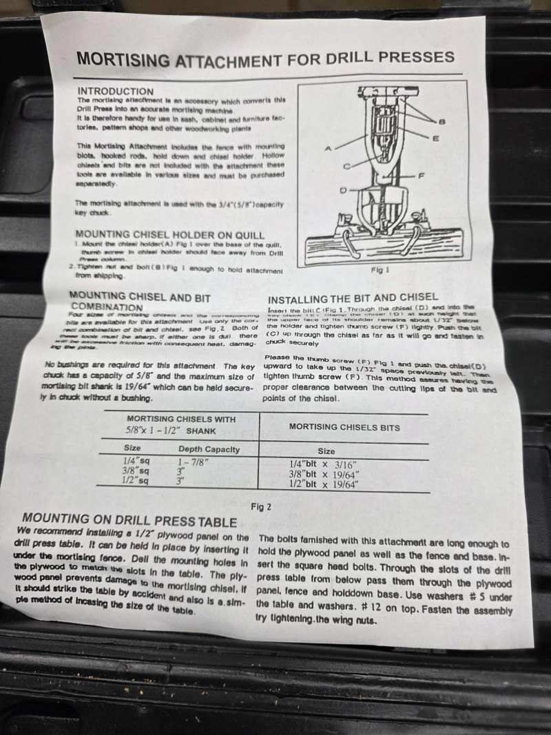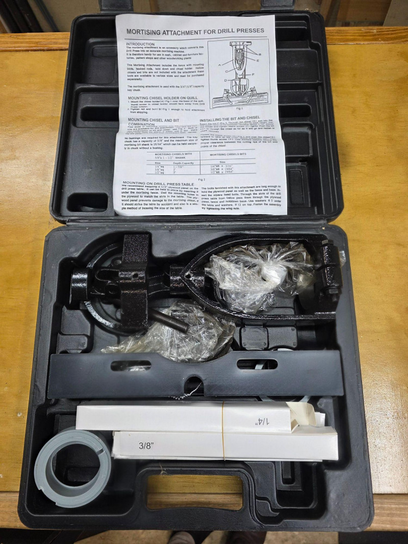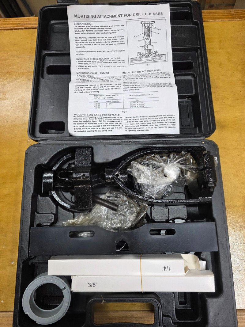 New In Box Mortising Attachment For Drill Press Converts a drill press into a machine for creating accurate square holes for mortise and tenon joints. Components: Includes a fence, hooked rods, hold-down, and chisel holder; hollow chisels and bits must be purchased separately. New in box!