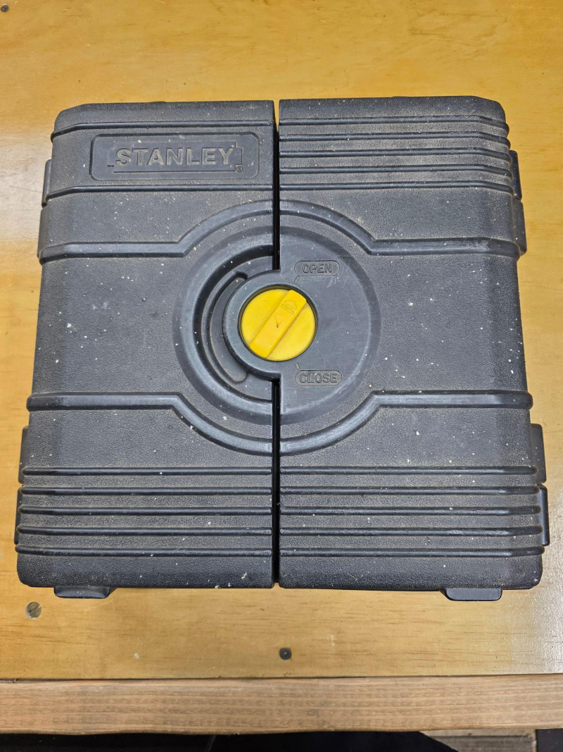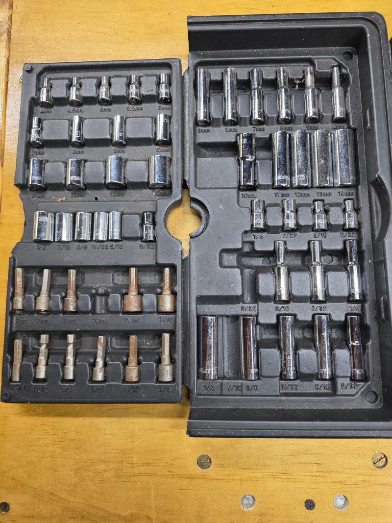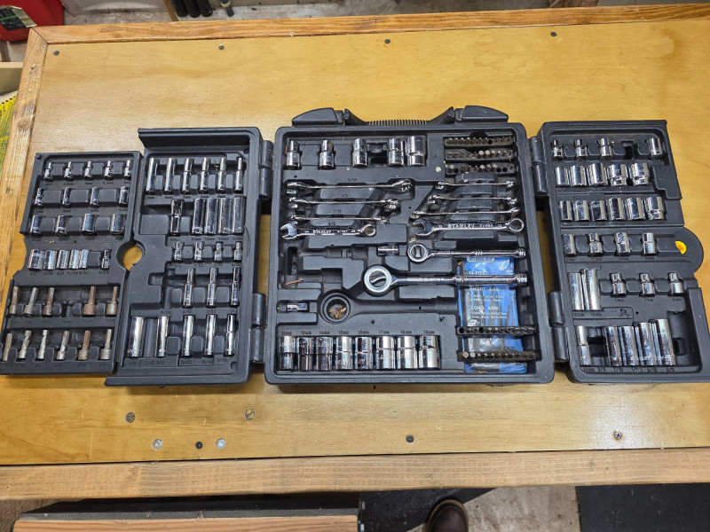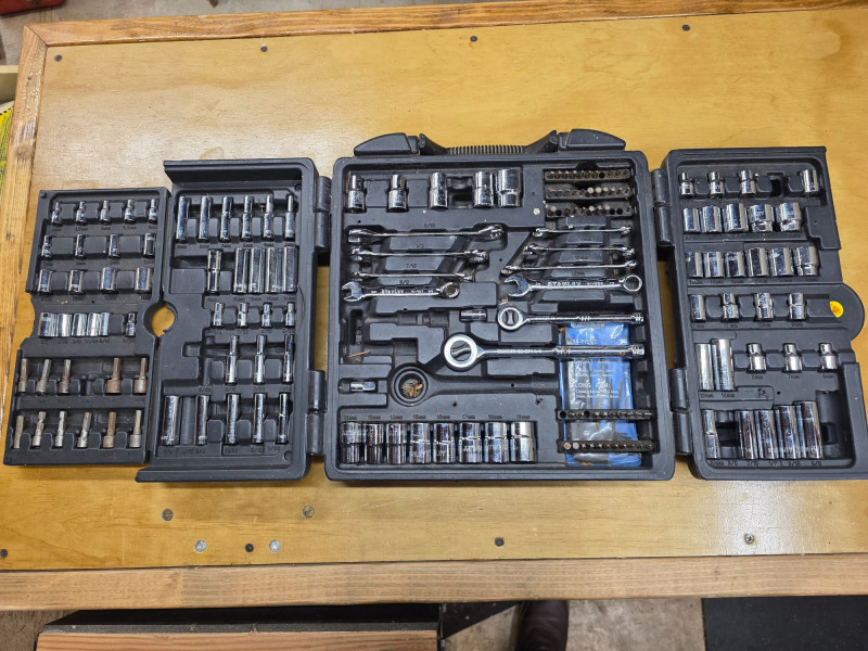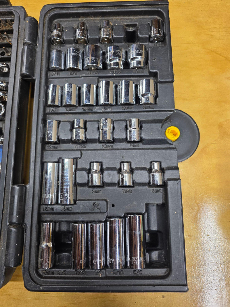 Stanley 150-Piece Mechanics Tool Set In Wall Cabinet Includes 1/4-inch and 3/8-inch drive ratchets, extension bars, spark plug sockets, and a variety of sockets in both standard (SAE) and metric sizes Features a rugged, blow-molded carrying case with a snap-in mechanism to keep tools organized and secure Missing a few pieces, see pics! 14.5"T x 14.5"W x 4"D