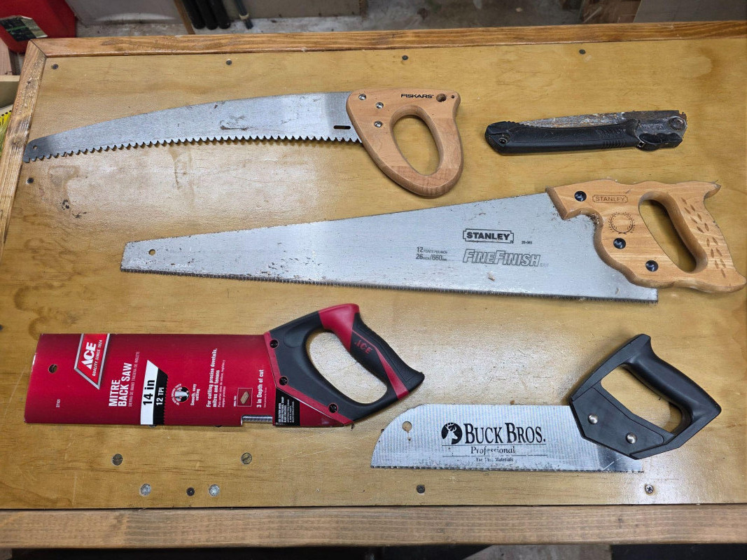 (5) Wood Saws (1) Fiskars Pruning Saw (1) 26" Stanley Fine Finish Hand Saw (1) 14" Mitre Back Saw (New in box) (1) Buck Bros. Professional Laminate Saw (1) G-Saw Multi Purpose Folding Saw 5 pieces in all!
