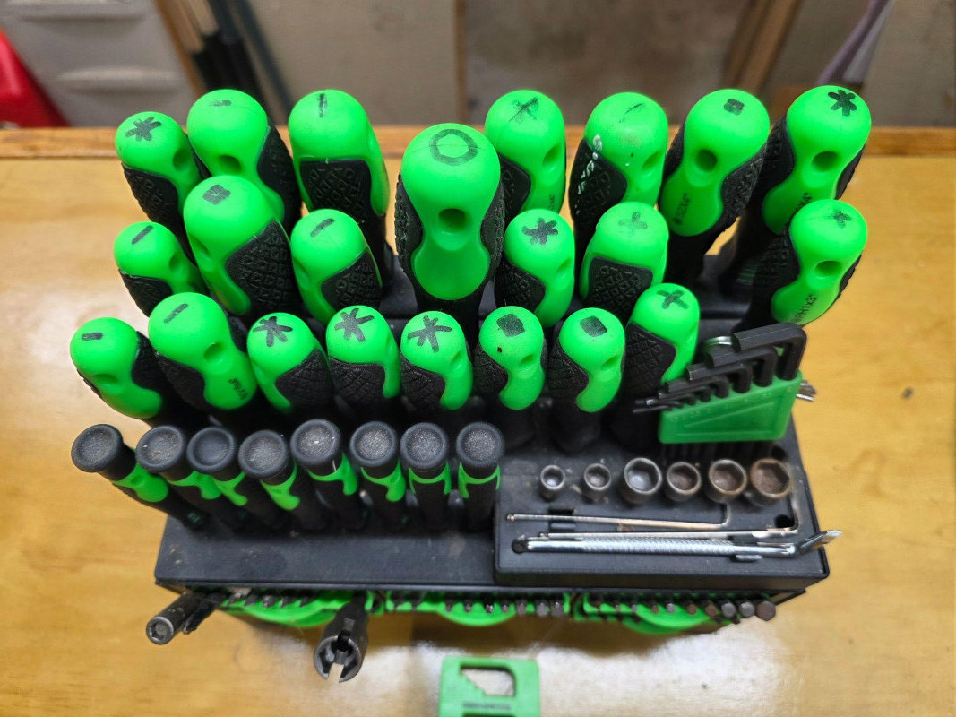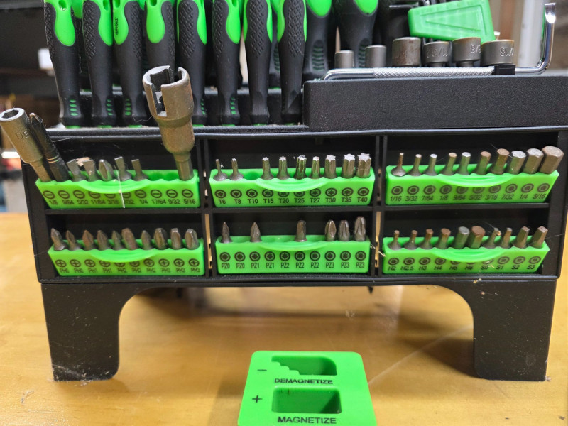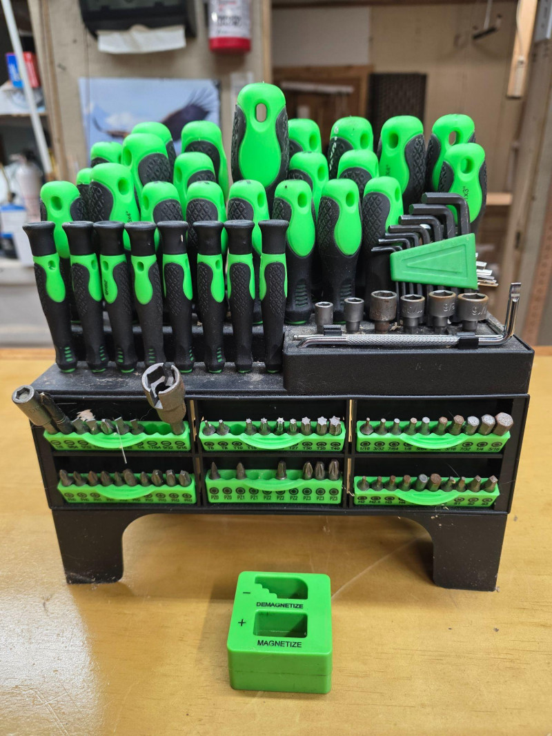 118-Piece Magnetic Screwdriver Set with Plastic Racking, Precision Screwdrivers, Magnetizer, Demagnetizer, Nut Drivers, Ratchet Handles, Allen Keys, Sockets & More Two screwdrivers and 7 screw bits missing Pretty complete set! 11"T x 10.5"W x 6"D