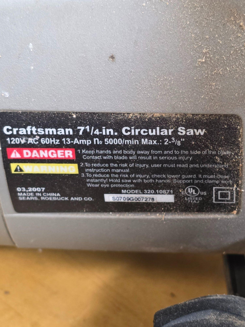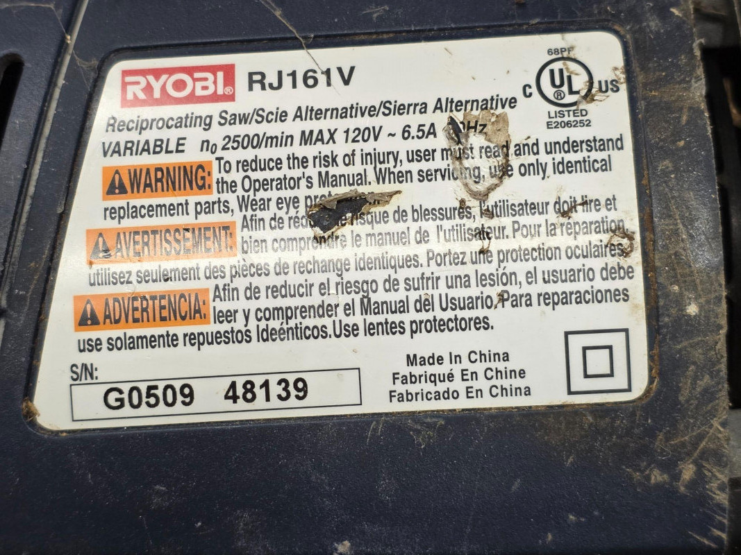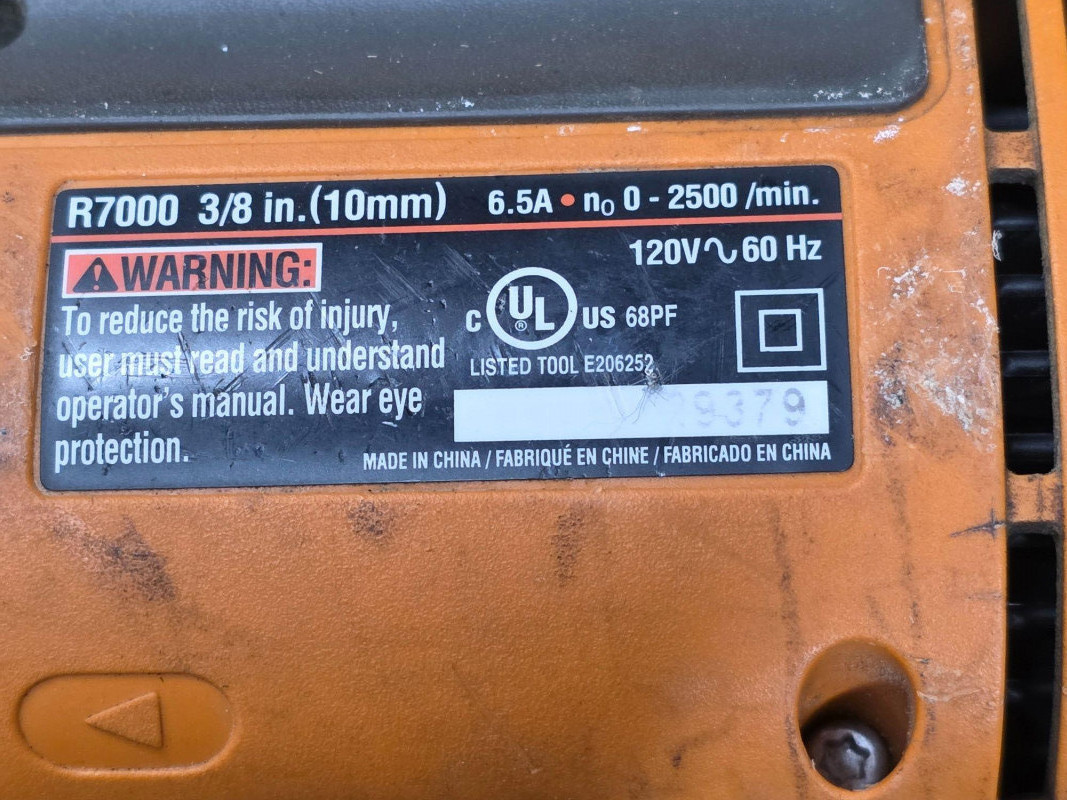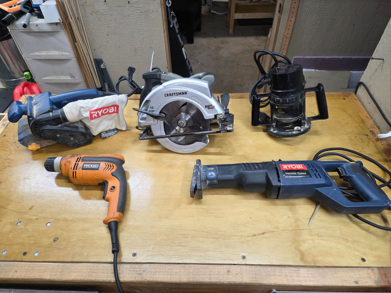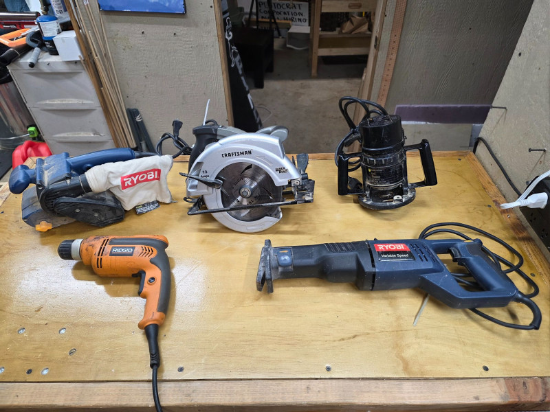 (5) Corded Power Tools: Black & Decker, Craftsman, Ryobi & Rigid (1) Craftsman 7.25" 13amp LaserTrac Corded Circular Saw Model #320.10871 (1) Ridgid 3/8" 6.5amp Corded Drill Ridgid Model #R7000 (1) Ryobi Variable Speed Corded Reciprocating Saw Ryobi Model #RJ161V (1) Ryobi 3" x 18" Corded Belt Sander Ryobi Model #BE318-2 (some fraying on cord) (1) Black & Decker 1hp Corded Router Black & Decker Model #7604 All Tested - All Work!