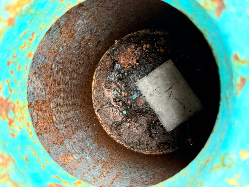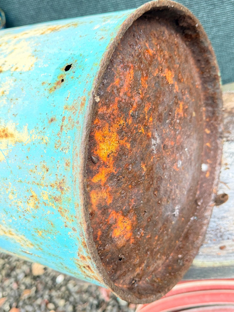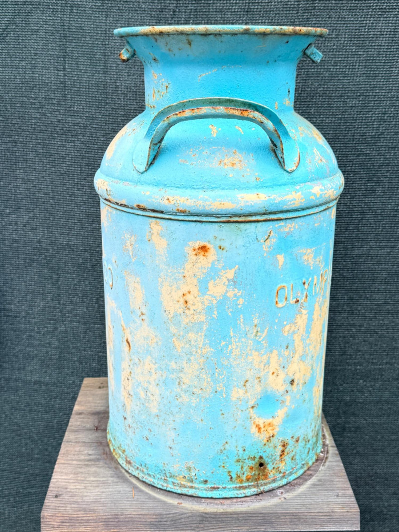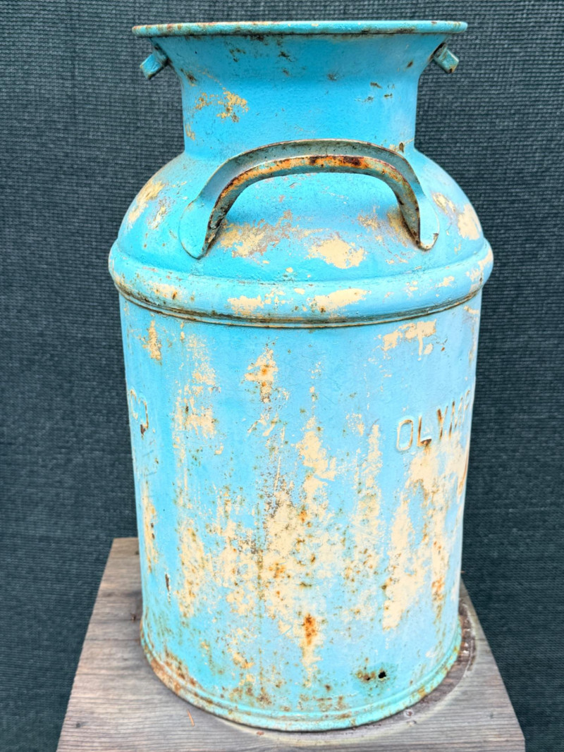 Olympia Cry Co Rusty Metal Milk Can Painted blue over previous yellow with an authentic patina. 11”x19”