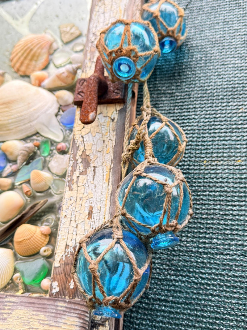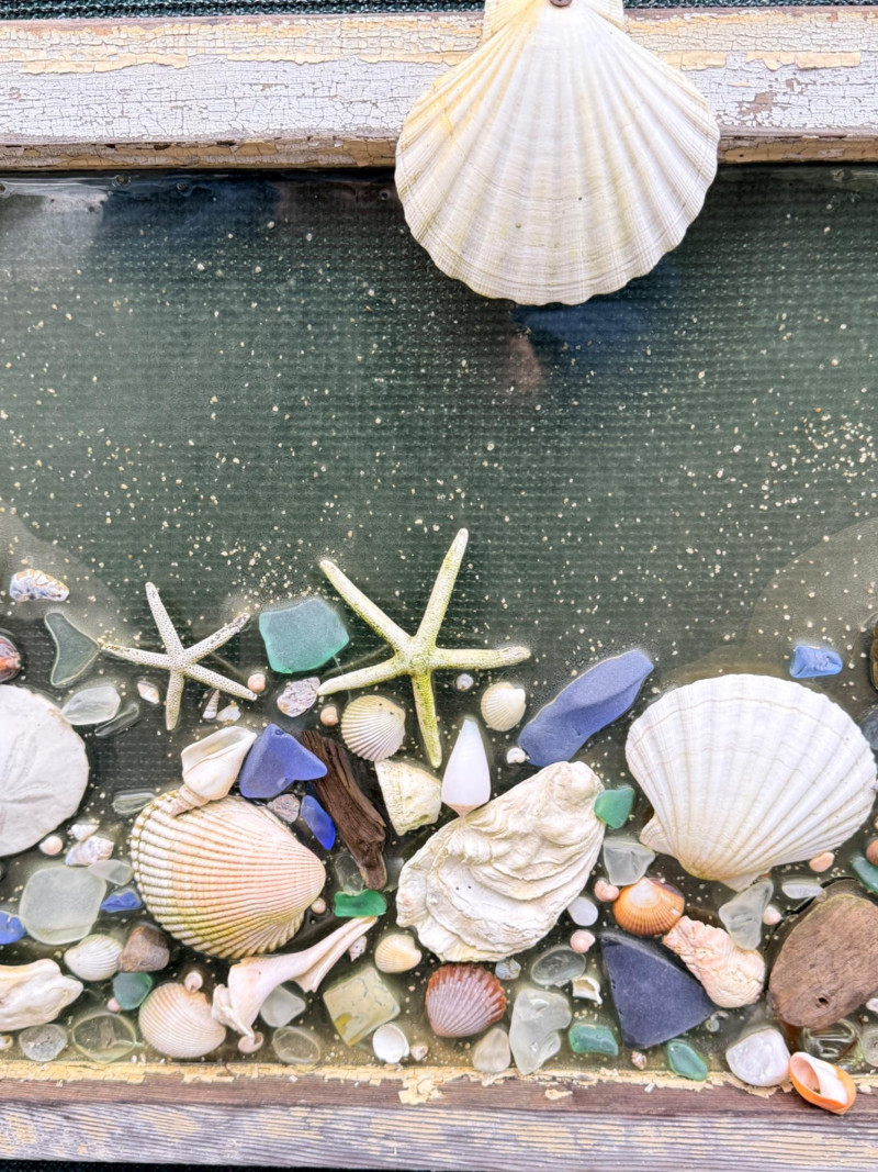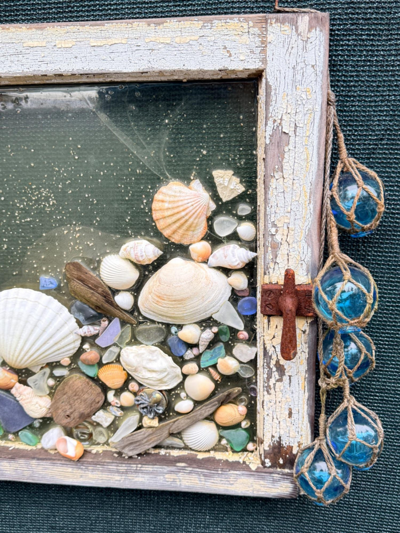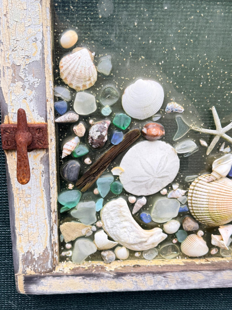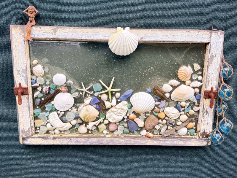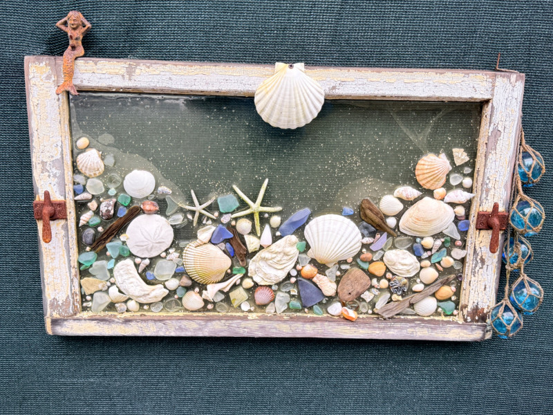 Outdoor Sea Life on Antique Window & Iron Mermaid. Seashells, colored beach glass and driftwood decor. Some pieces have fallen but are included. Measures 30“ x 18“