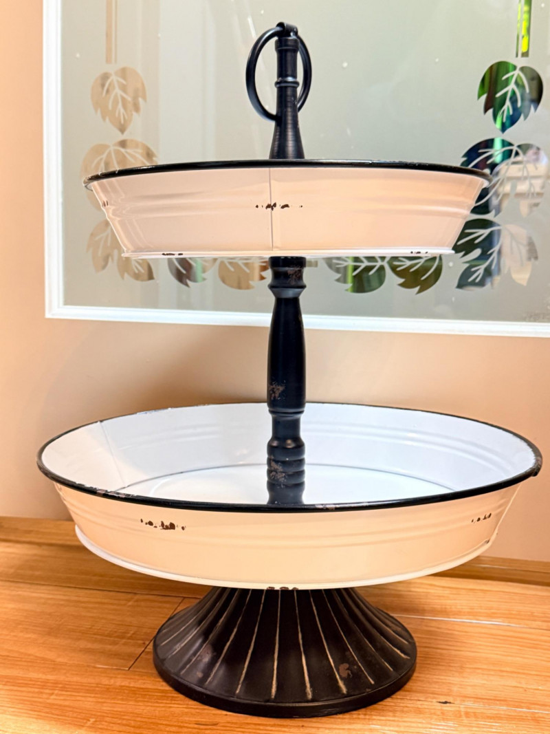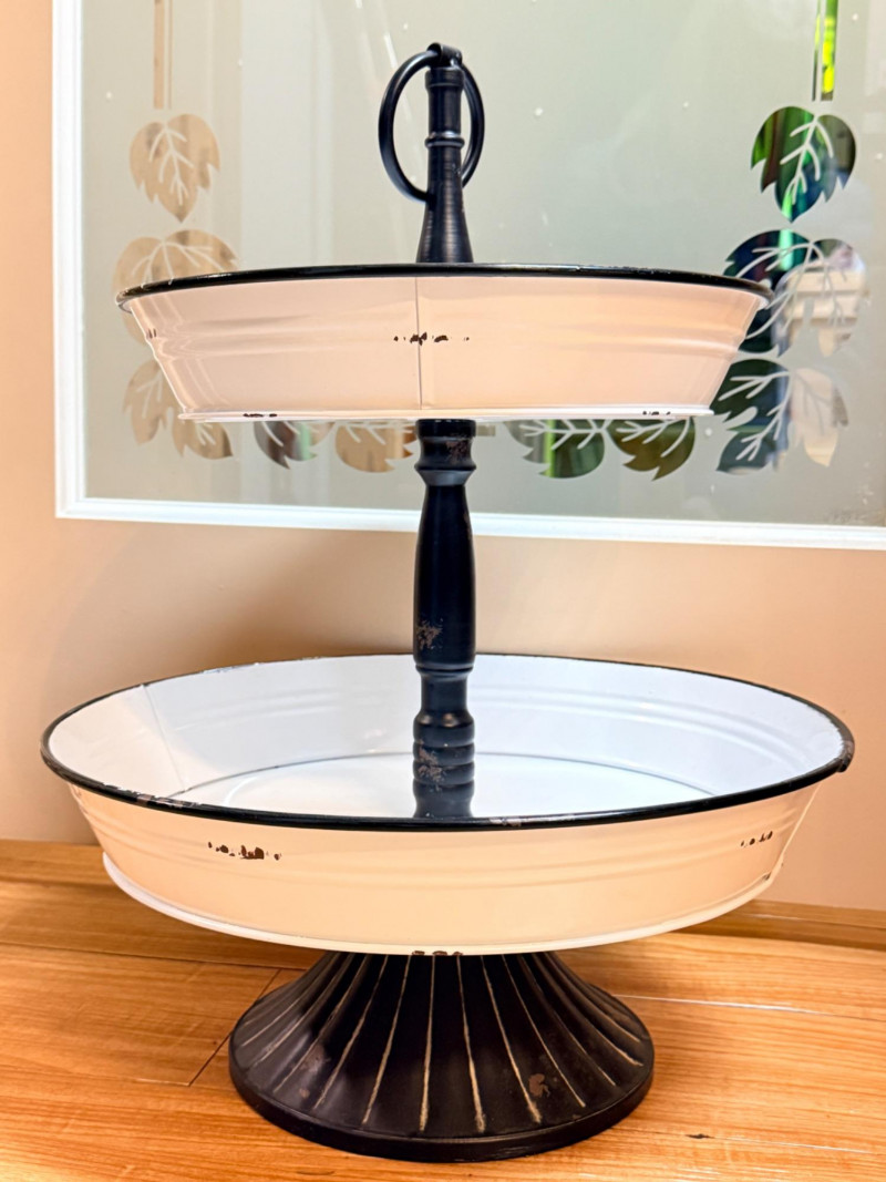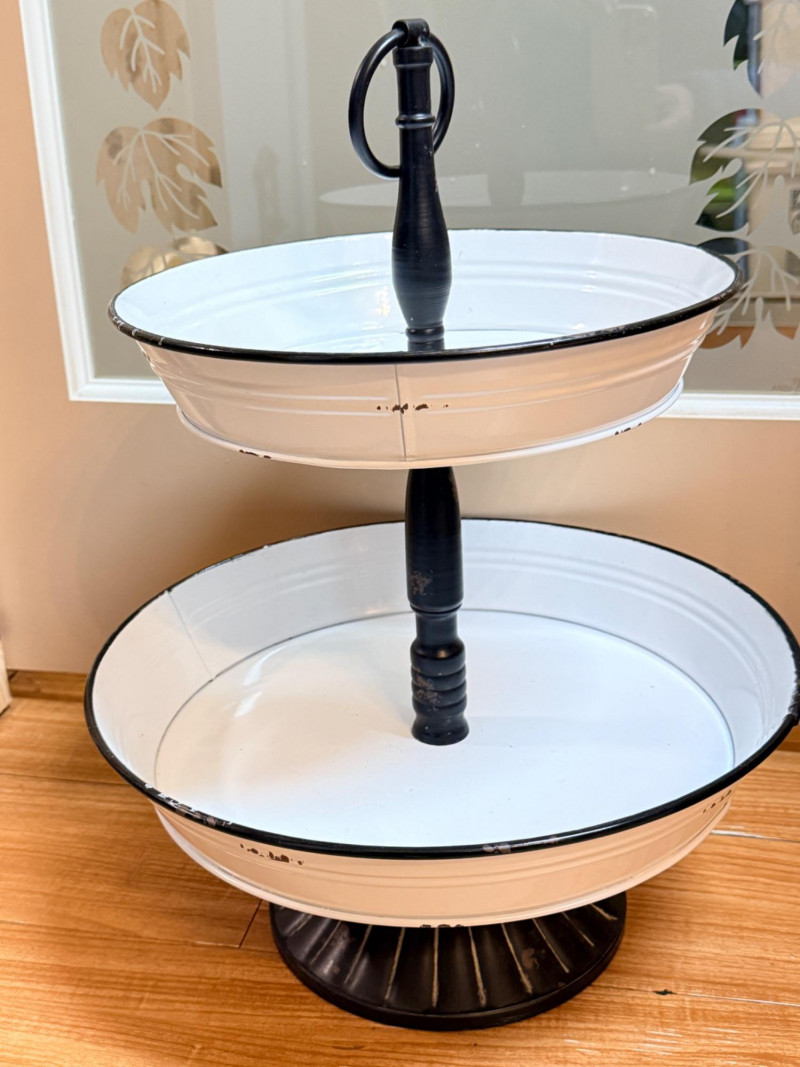 White Enameled Metal Server, a vintage farmhouse inspired 2 tiered stand.