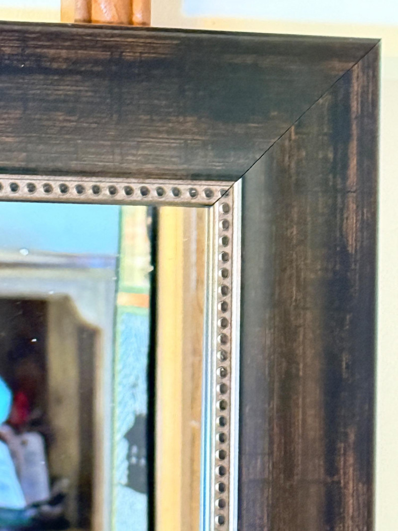 A traditional wall-mounted home decor mirror featuring a dark wood-toned frame with beaded inner edges.