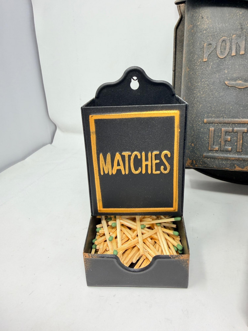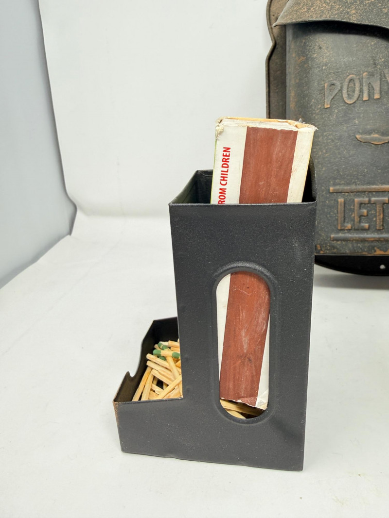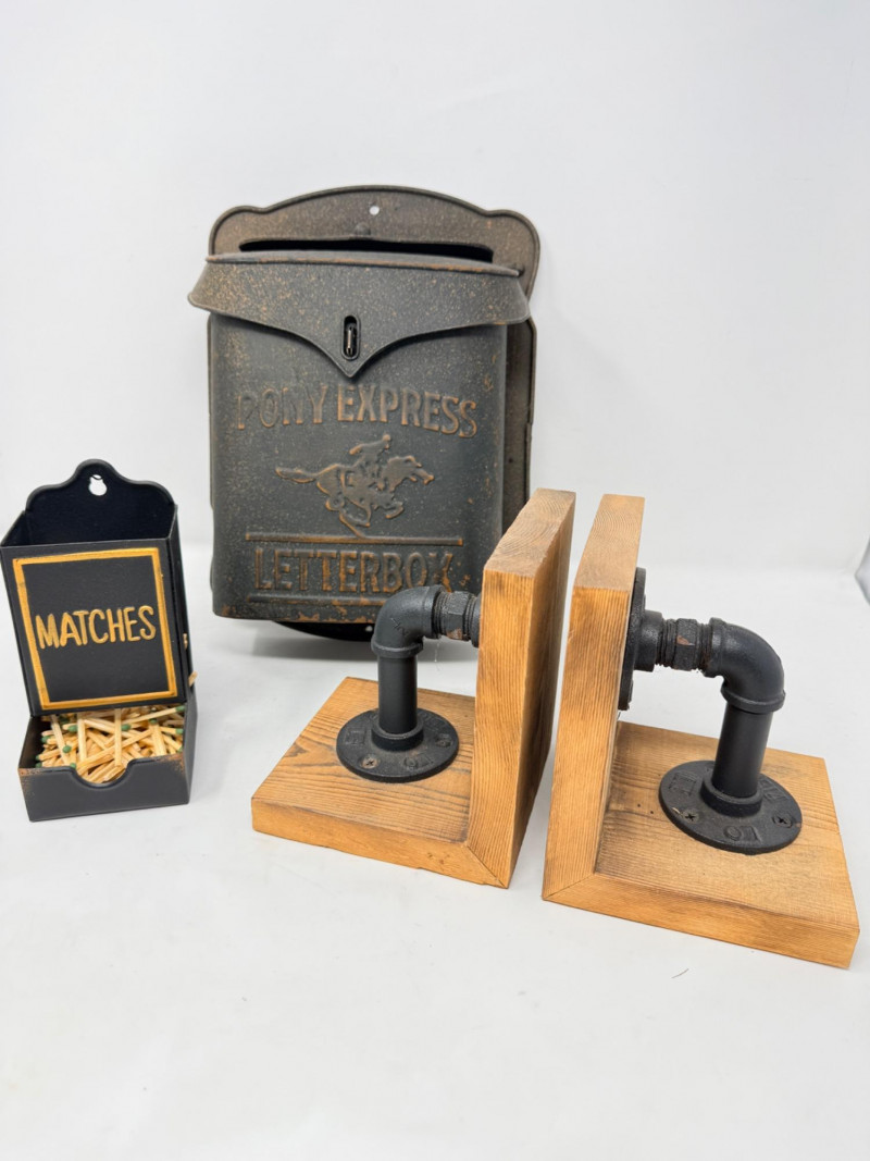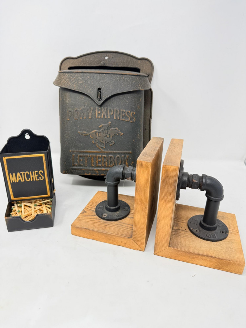 Metal Letterbox - Pipe Bookends & Matchstick Holder Pony express lockable lid with mail slot letterbox measures 11.5” x 9” x 4” aluminum painted black. Pipe bookings measure 5“ x 5“ x 6“ tall Matchstick box with matches.