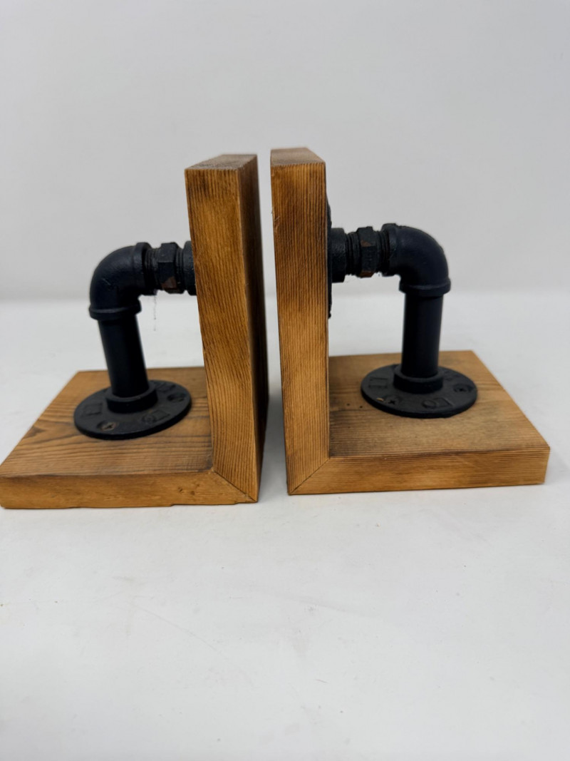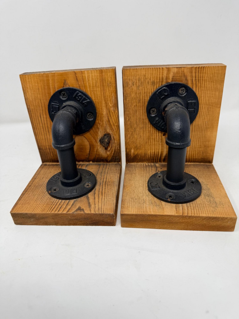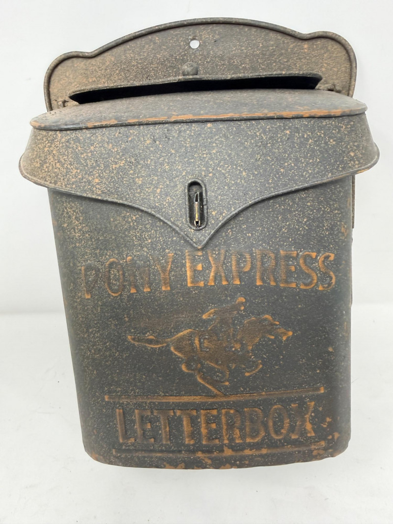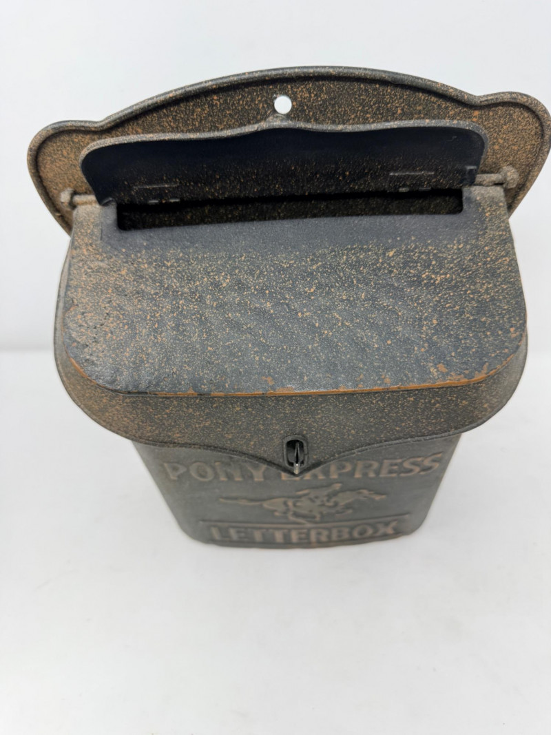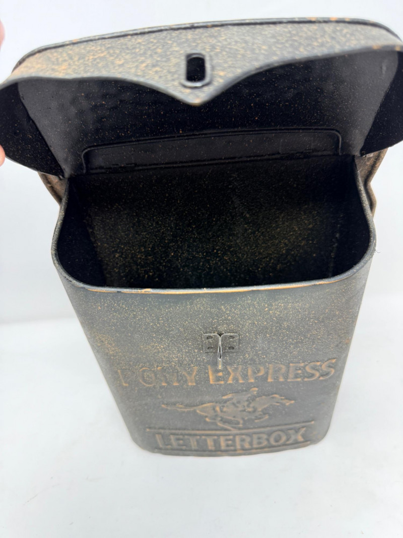 Metal Letterbox - Pipe Bookends & Matchstick Holder Pony express lockable lid with mail slot letterbox measures 11.5” x 9” x 4” aluminum painted black. Pipe bookings measure 5“ x 5“ x 6“ tall Matchstick box with matches.
