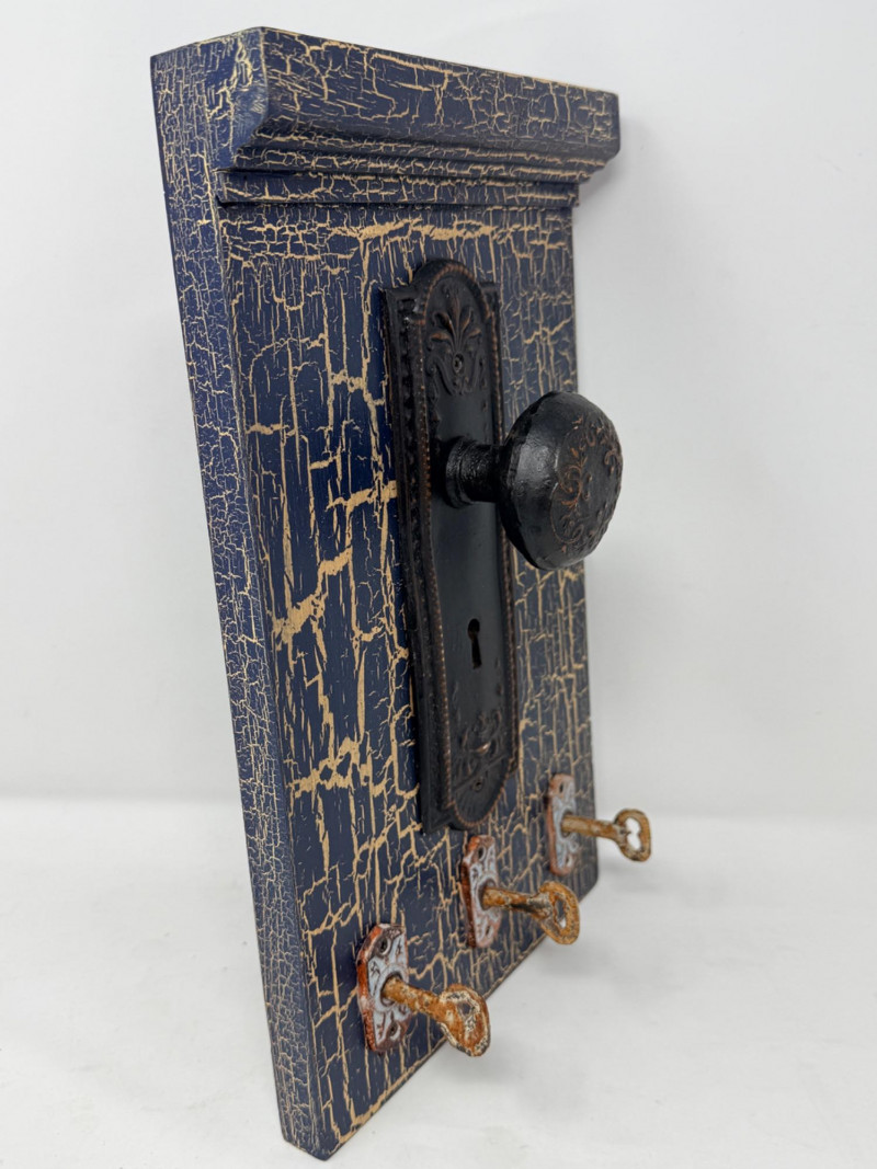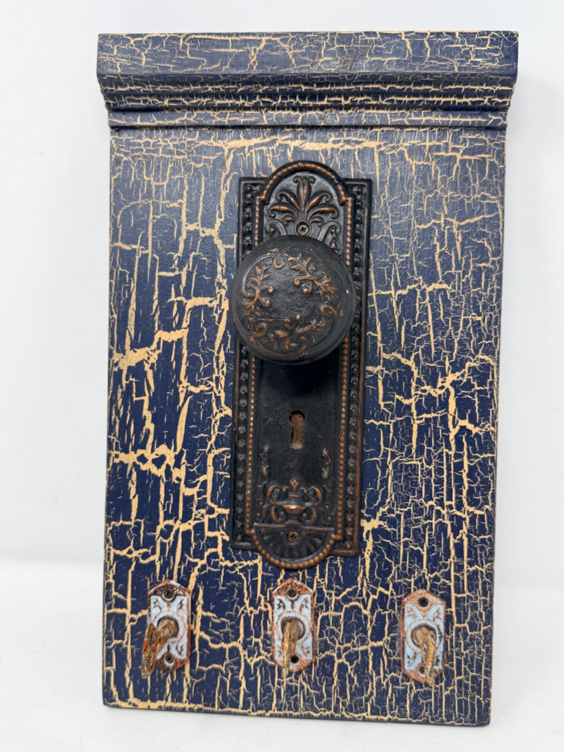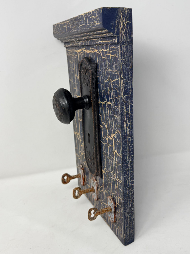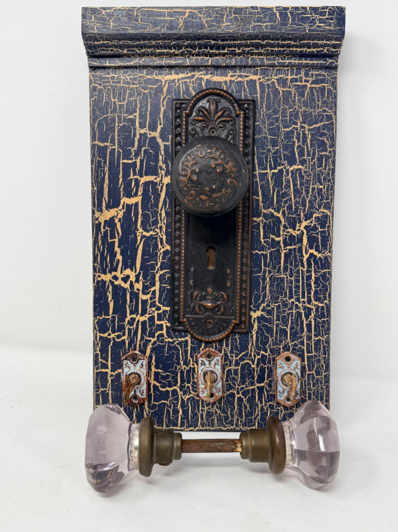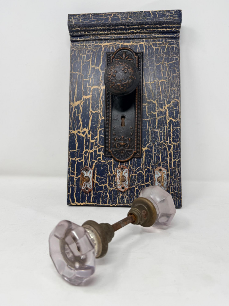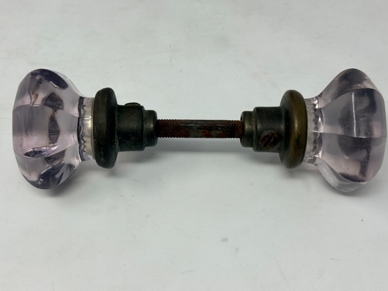 Antique Glass Door Handle Set & Doorknob & Key Hook Wall decor knob and key set is 7 1/2 x 12 1/2. Antique glass door knob set has a purpleish hue to the glass and measure measures 6.5” x 2”