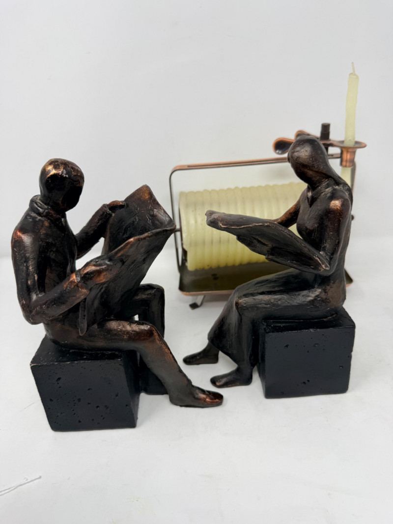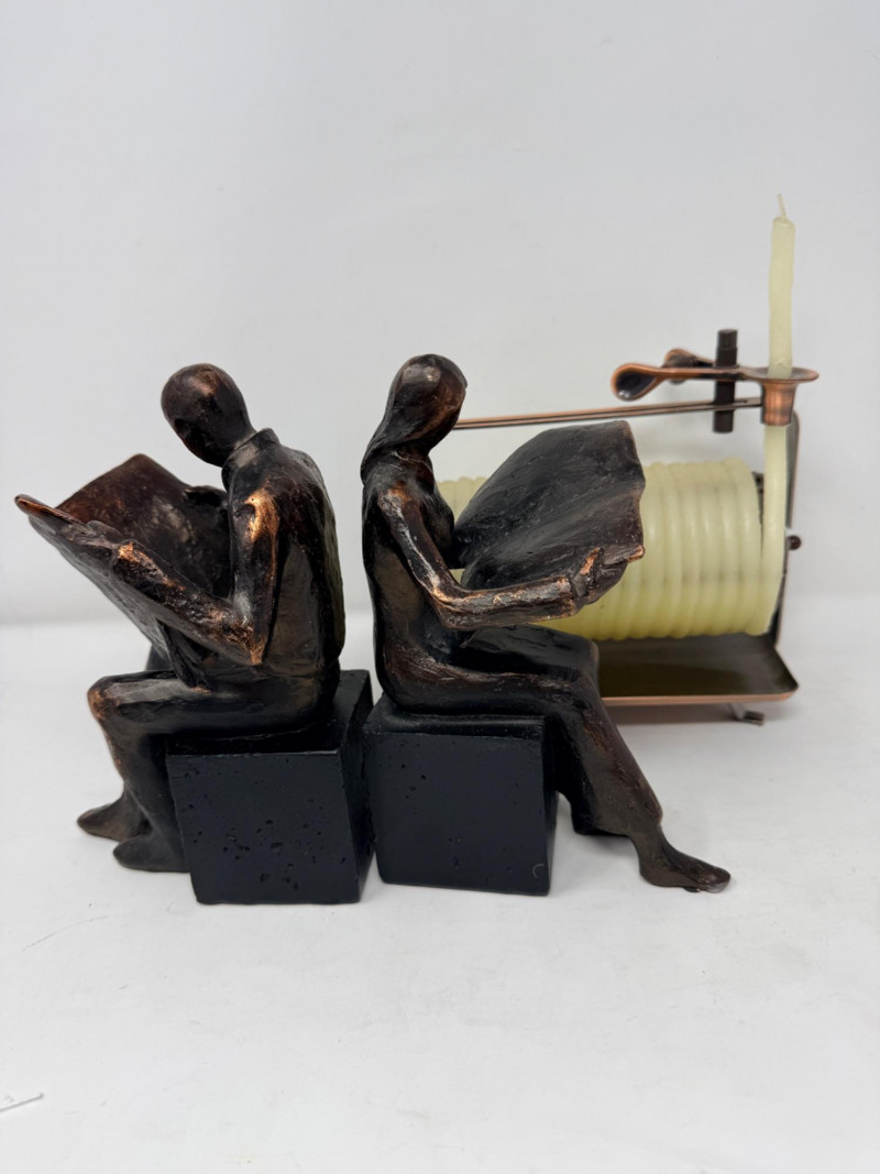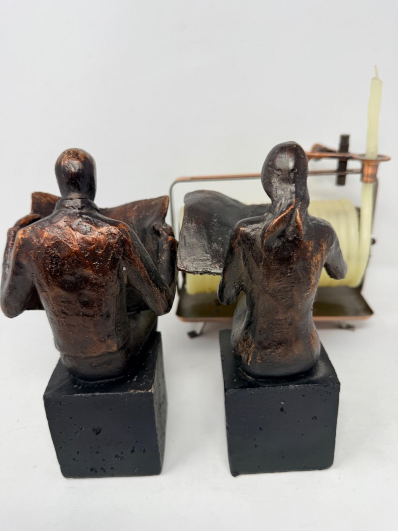 Lot # 194 - Bronze Tone Man/Woman Book Ends & Beeswax Spiral Candle