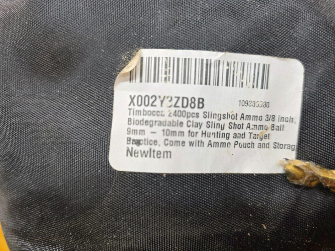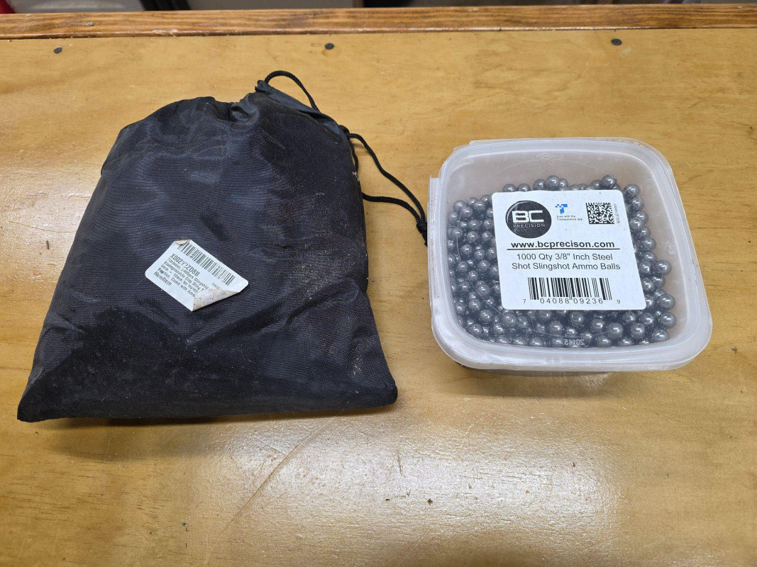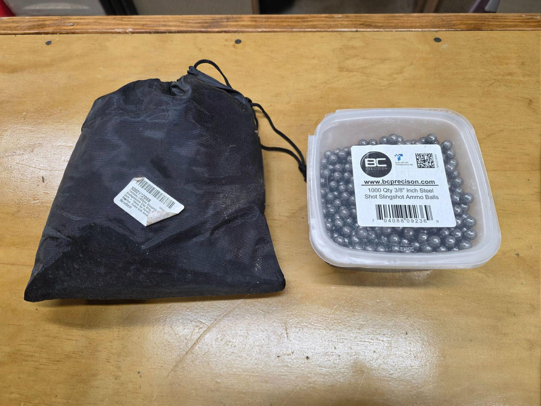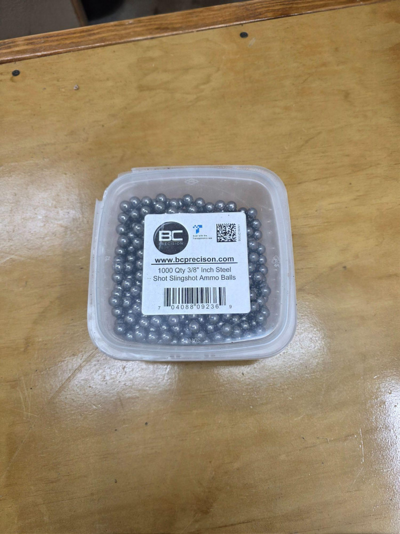 (2) Containers Of 3/8" Slingshot Ammo Balls (1) Black bag contains 3/8" Biodegradable Clay Slingshot Ammo Balls (Bag says quantity of 2400 balls) 9mm - 10mm for hunting & target practice 2.5"T x 8"W x 8"D (1) Plastic lidded container holds 3/8" Steel Shot Slingshot Ammo Balls (Containers say quantity of 1000 balls) 3"T x 6"W x 6"D