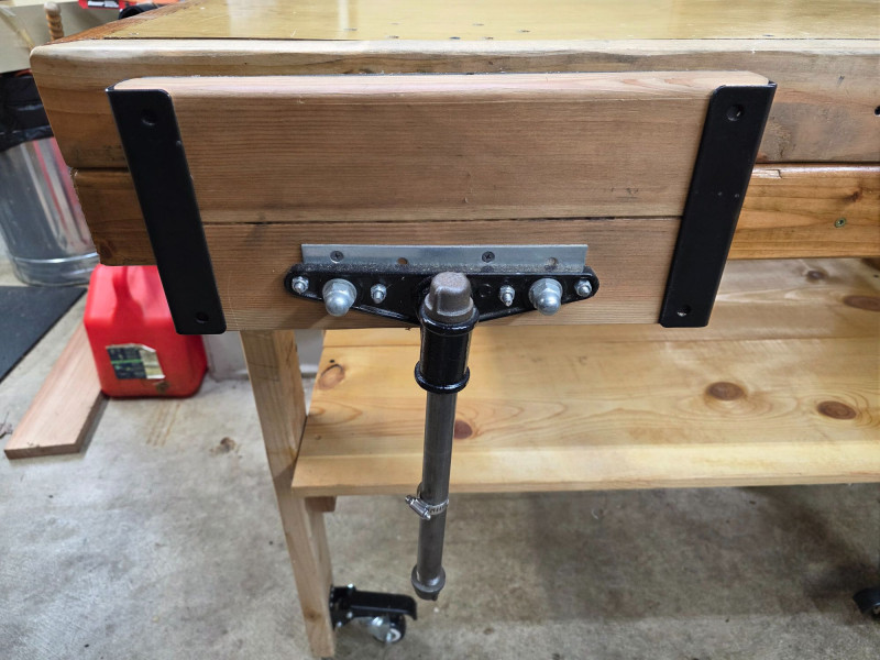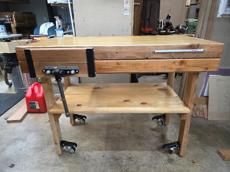 51" Home-Made Wood Workbench On Casters Well made wooden work bench with built in wood vise Bench has locking casters for easy portability Single shelf below work surface 39.5"T x 51"L x 27"W