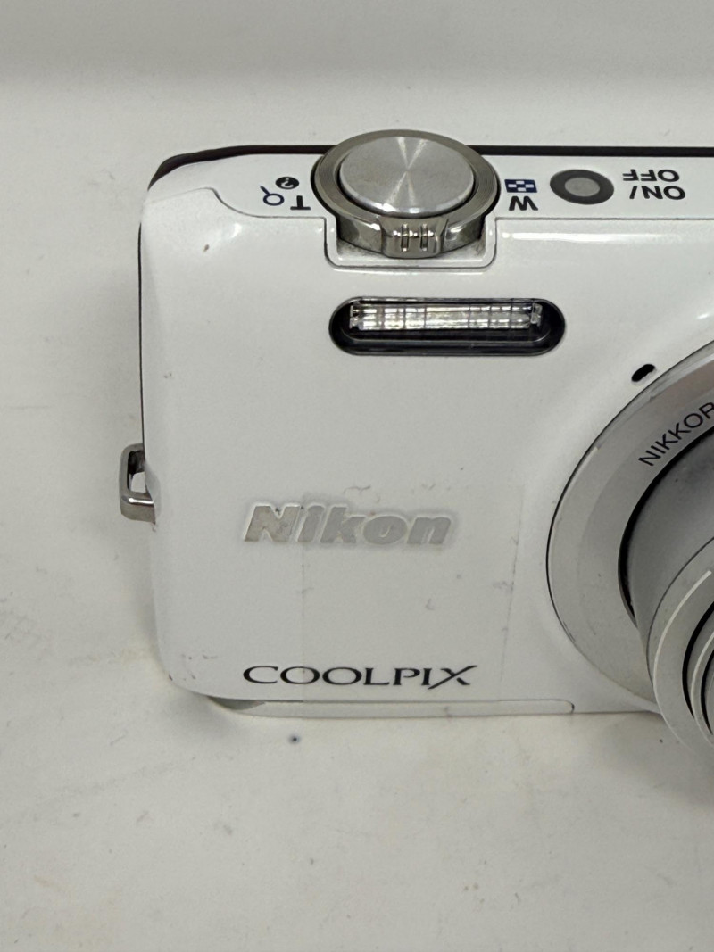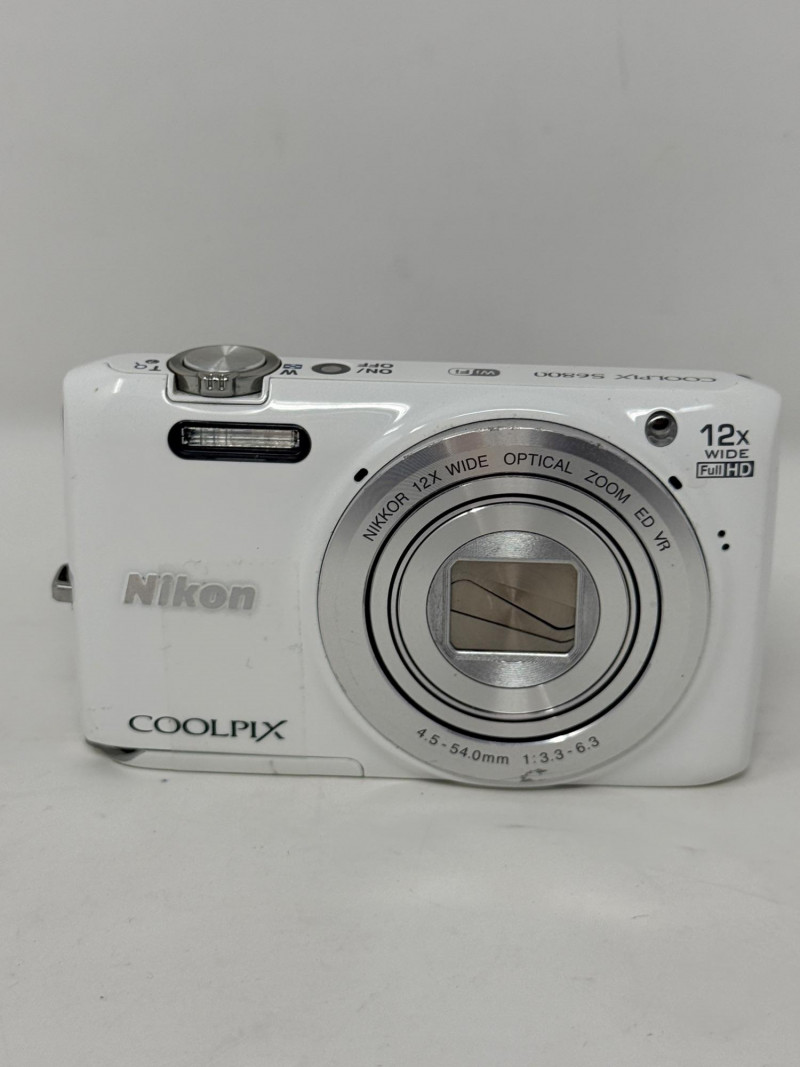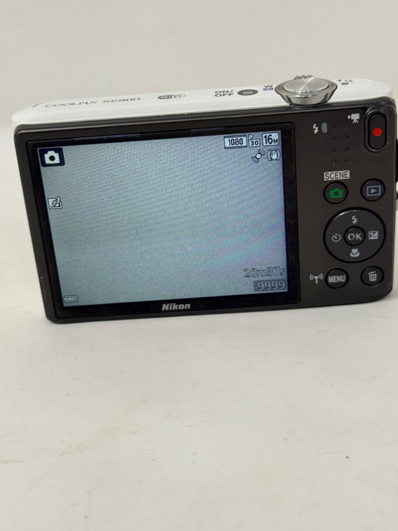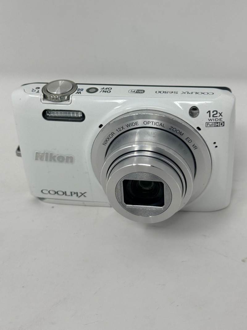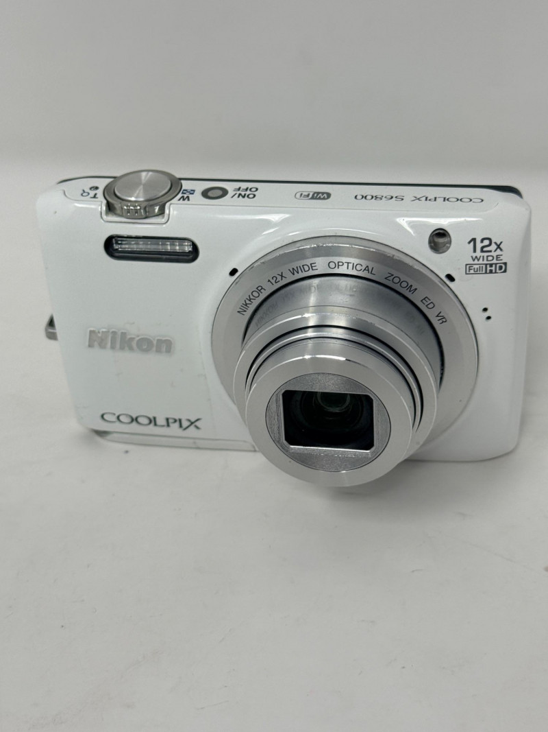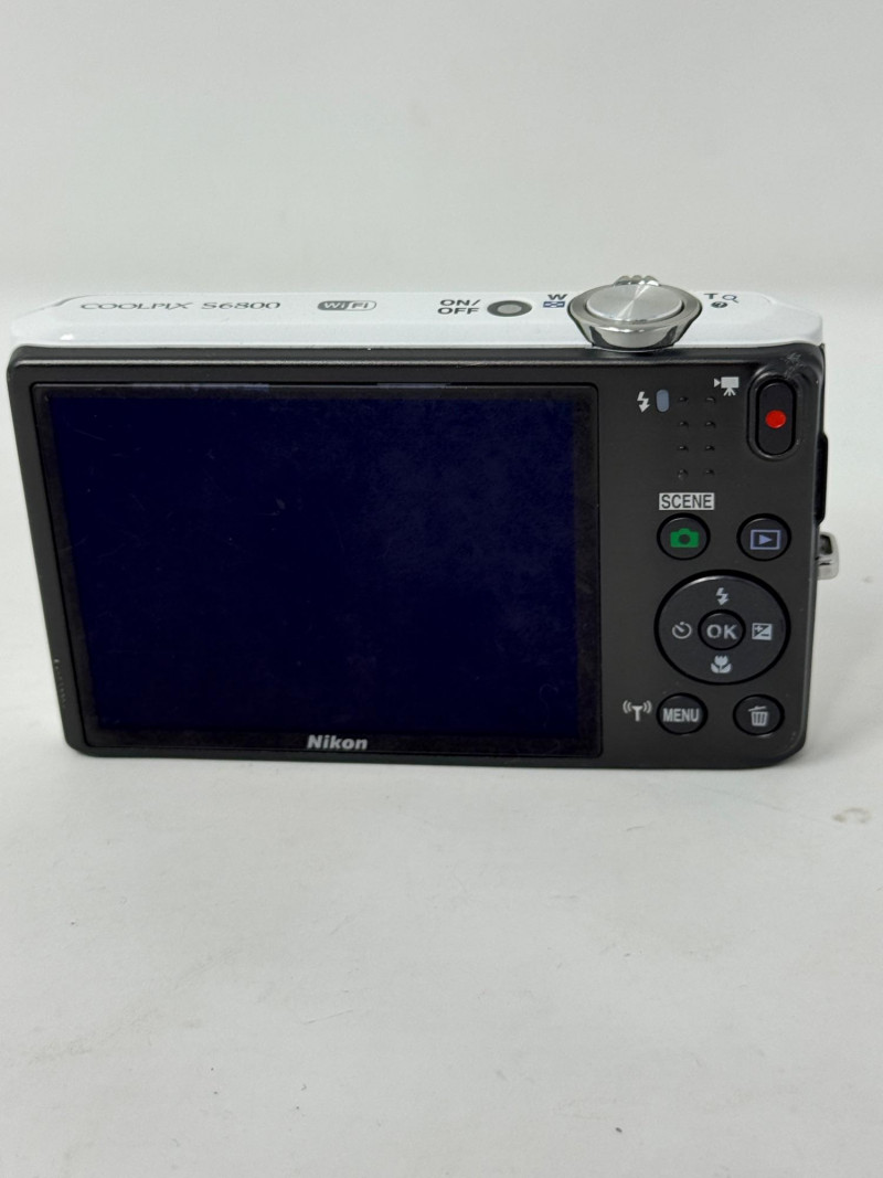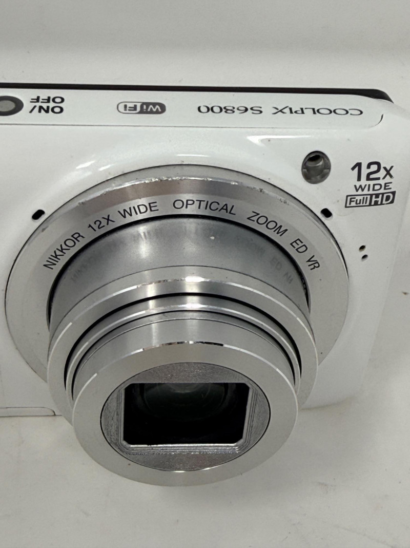 White body Nikon CoolPix S6800 16.0-megapixel 1/2.3" Back-illuminated CMOS sensor. 12x optical zoom (25-300mm equivalent). Full HD 1080p recording at 30p or 60i with stereo sound. 0-inch 460k-dot TFT LCD with anti-reflection coating. Built-in Wi-Fi for transferring photos to smartphones and remote shutter control. Ultra-slim body weighing approximately 5.2 oz Tested, works!