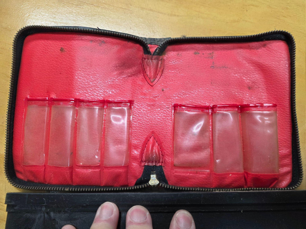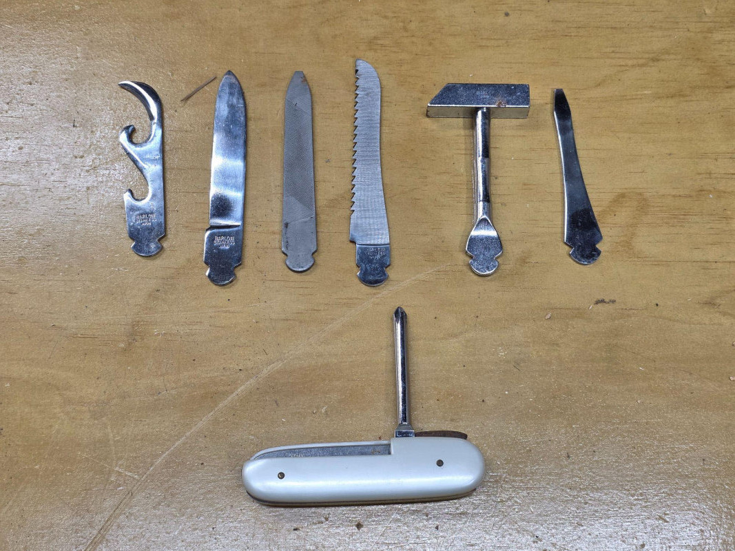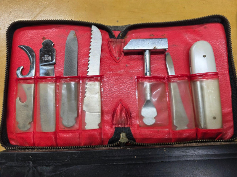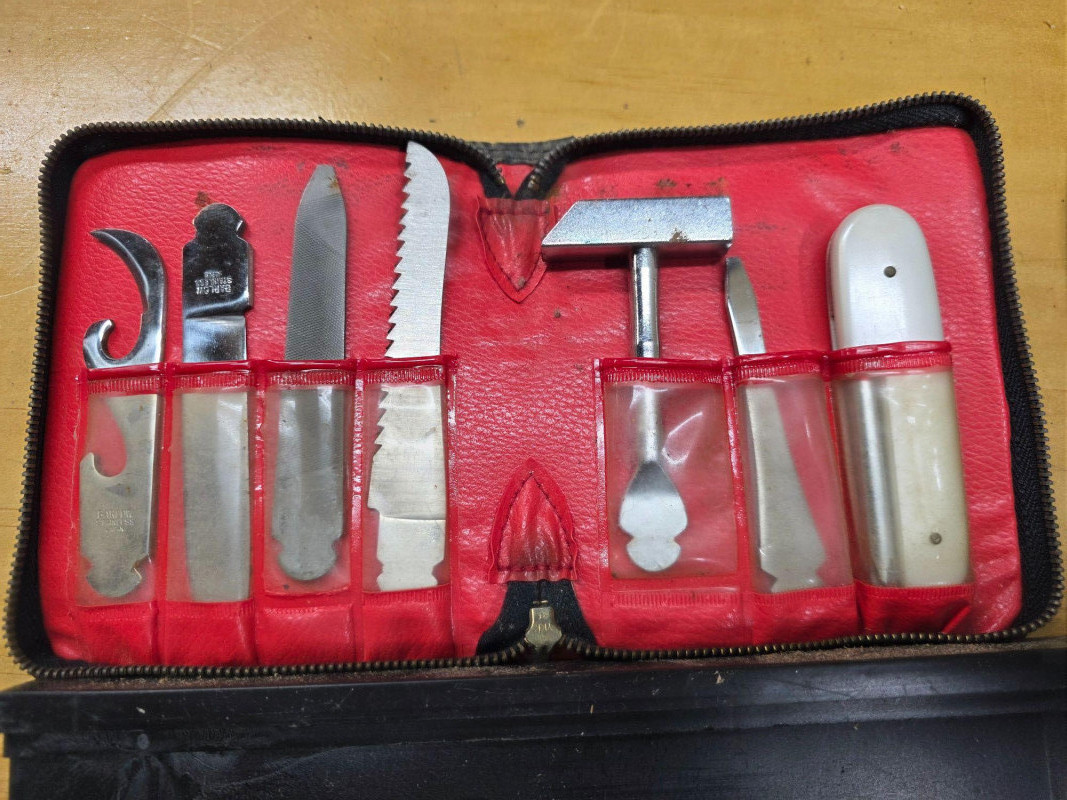 Vintage Barlow 7-piece Multi-Tool Executive Kit Promotional Item For AAMCO Manufactured by Barlow in Japan during the 1960s or 70s These sets were commonly used as promotional items for various companies This kit was produced for AAMCO Transmissions Of Santa Barbara California The logo is on the vinyl toll kit cover The set features a primary handle with a white pearl-style finish that acts as the base for the other tools. Includeds stainless steel tools such as a saw blade, file, hammer, knife blade, phillips screwdriver and a bottle opener. Housed in a zippered faux-leather case with a red interior and clear plastic slips to hold the individual components in place Set is complete! 9"L x 5.5"W