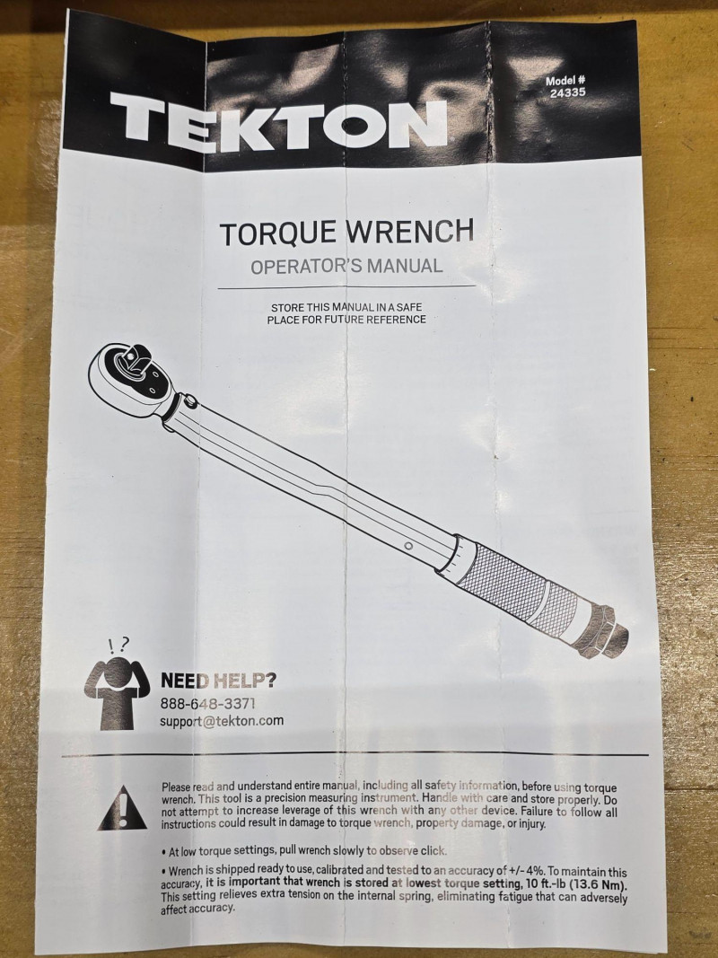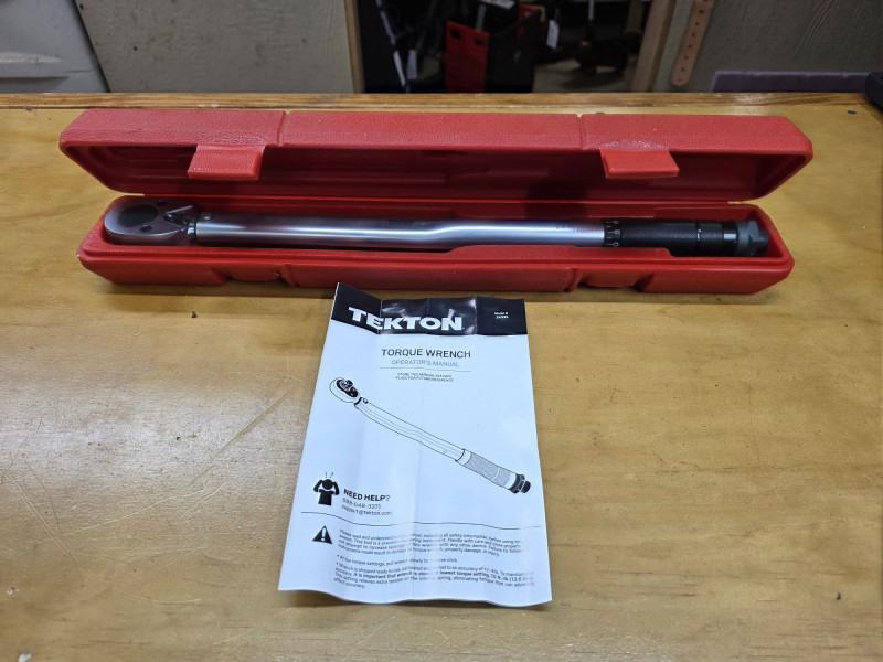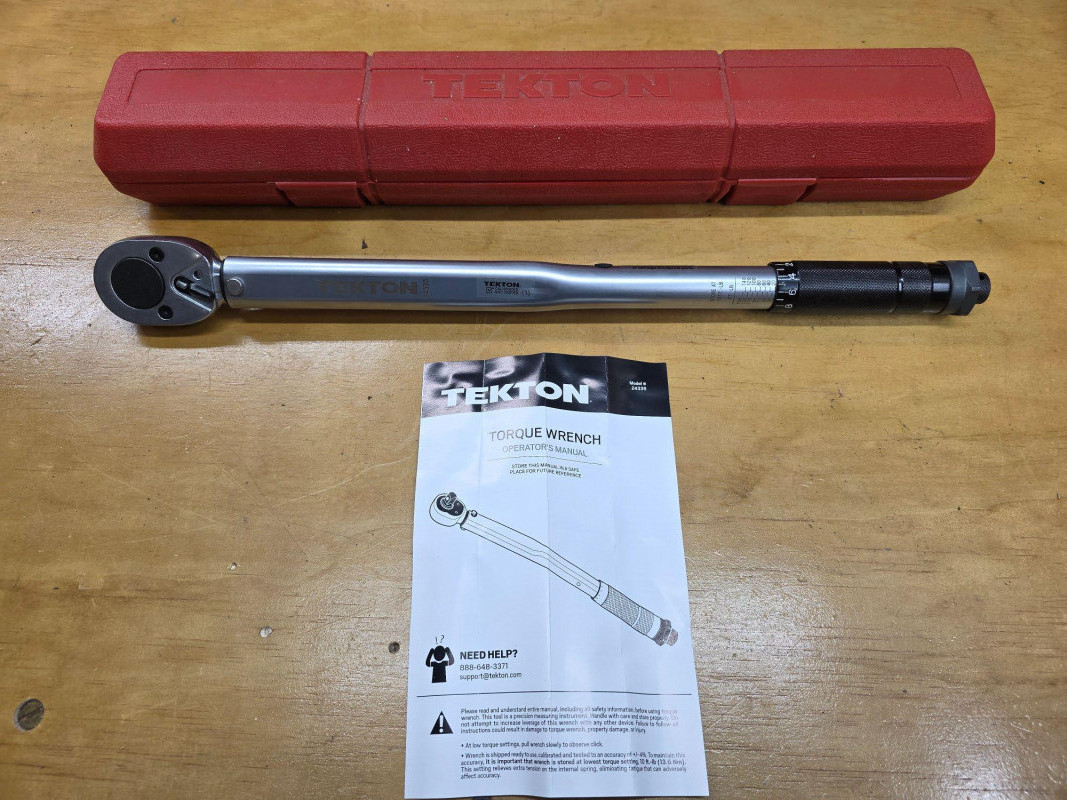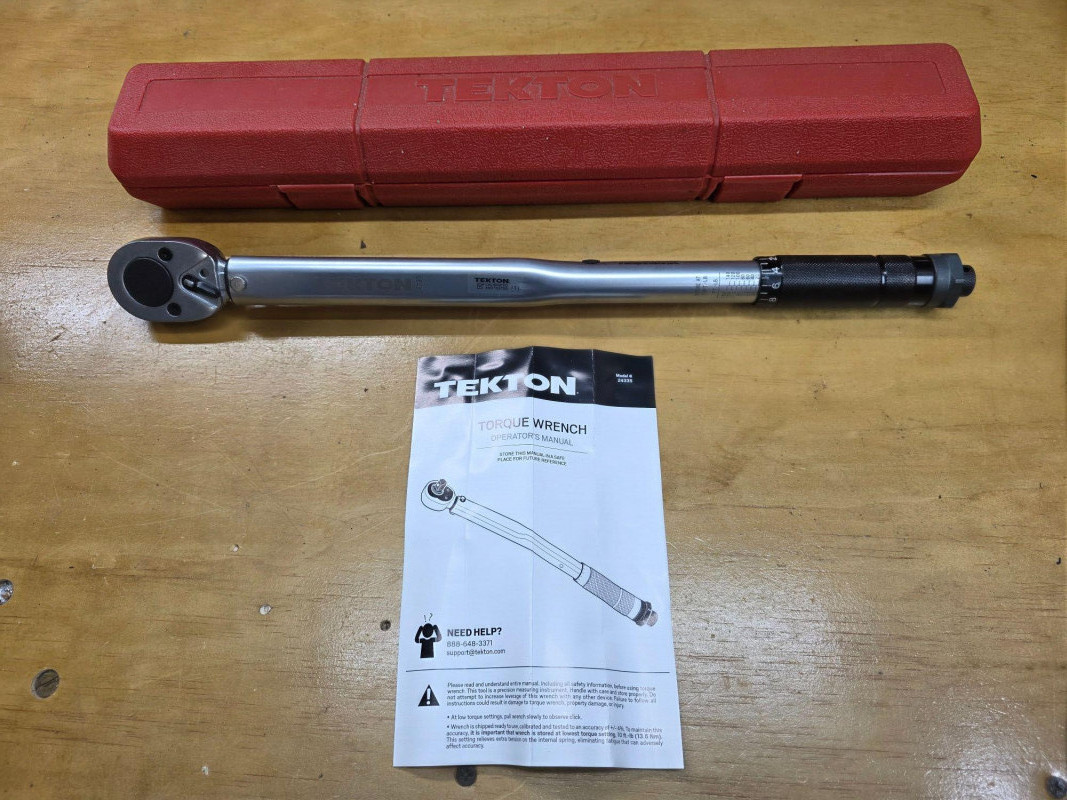 TEKTON 1/2-Inch Drive Click Torque Wrench Model #24335 Drive Size: 1/2-inch drive. It has a dual-range scale of 10-150 ft.-lb. and 13.6-203.5 Nm. The wrench features durable all-steel construction with no plastic parts. It emits a "click" sound and feeling when the preset torque value is reached. It is calibrated to an accuracy of +/- 4%. The high-contrast scale is designed to be easy to read, even in low light conditions Appears to be in new to like new condition! Includes case and instructions 18.5"L