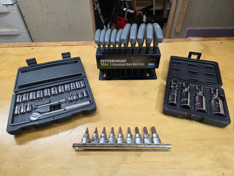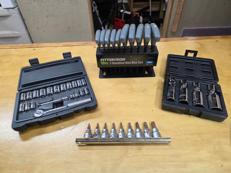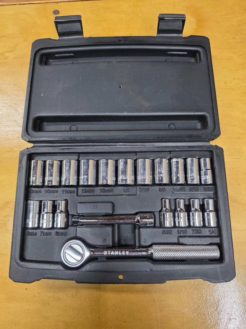 (4) Small Tool Kits: Stanley, Everlast, Pittsburgh & More (1) Stanley 20-Piece Mechanic Tool Set Stanley #92-802 Contents: 18 Drive Sockets (1/4"), 1/4" Drive Extension Bar (3"), 1/4" Ratchet, Blow Molded Carry Case Complete! (1) Evercraft 4-Piece Spark Plug Socket Set Set is designed for the removal and installation of spark plugs, featuring flexible joints to allow access in cramped engine bays 9/16", 5/8", 3/4", 13/16" Complete! (1) Torx Bit 10-Piece Socket Set The torx kit is a bit rusty! (1) Pittsburgh 10-Piece T-Handled Metric Hex Key Set Pittsburgh #62172 4 kits in all in a Stanley Tool Bag!