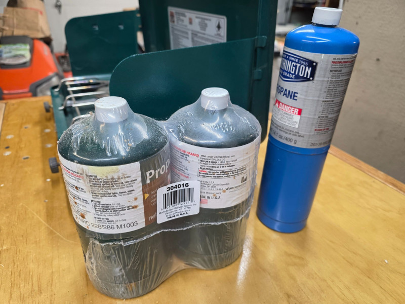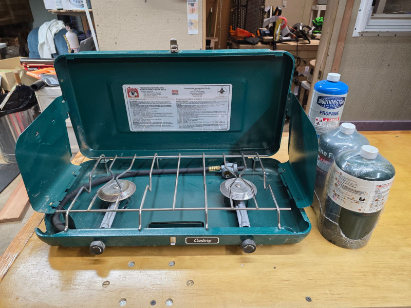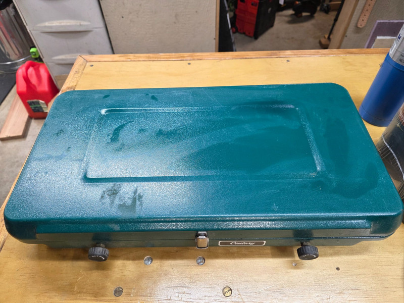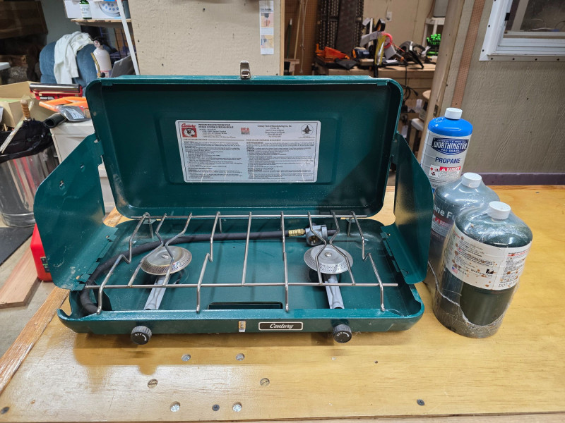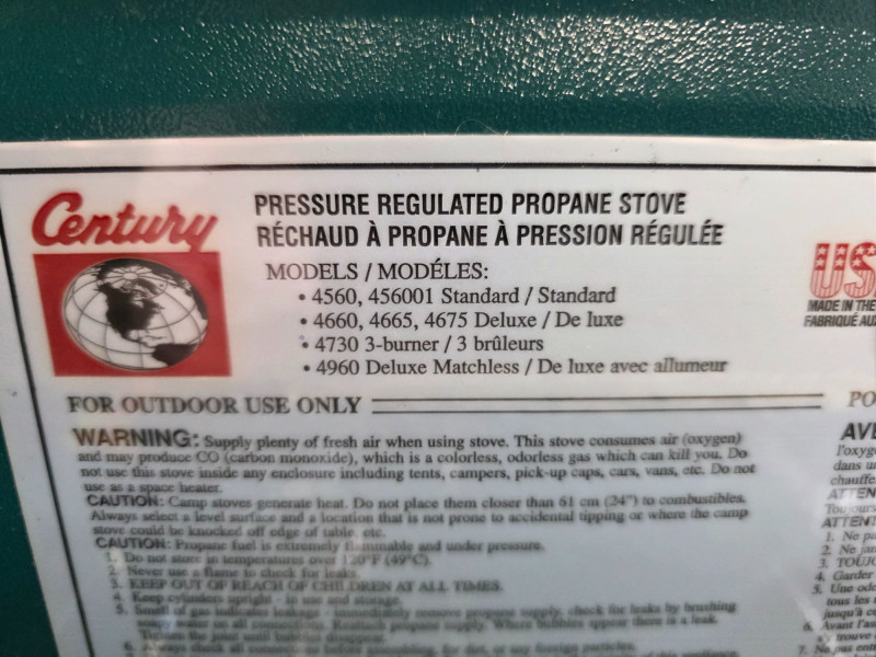 Vintage Century Primus 2 Burner Propane Camp Stove Century Model #4560 A portable green metal stove designed for camping and hiking Uses propane fuel with 3 standard canisters included Includes a built-in metal travel case that doubles as a windscreen Untested, but looks lightly used (the right burner appears to have never been lit) 3.5"T x 21"W x 11.5"W