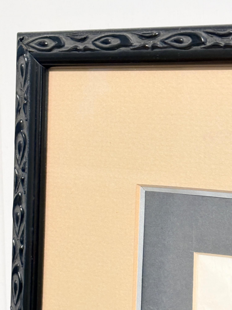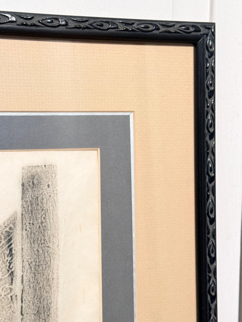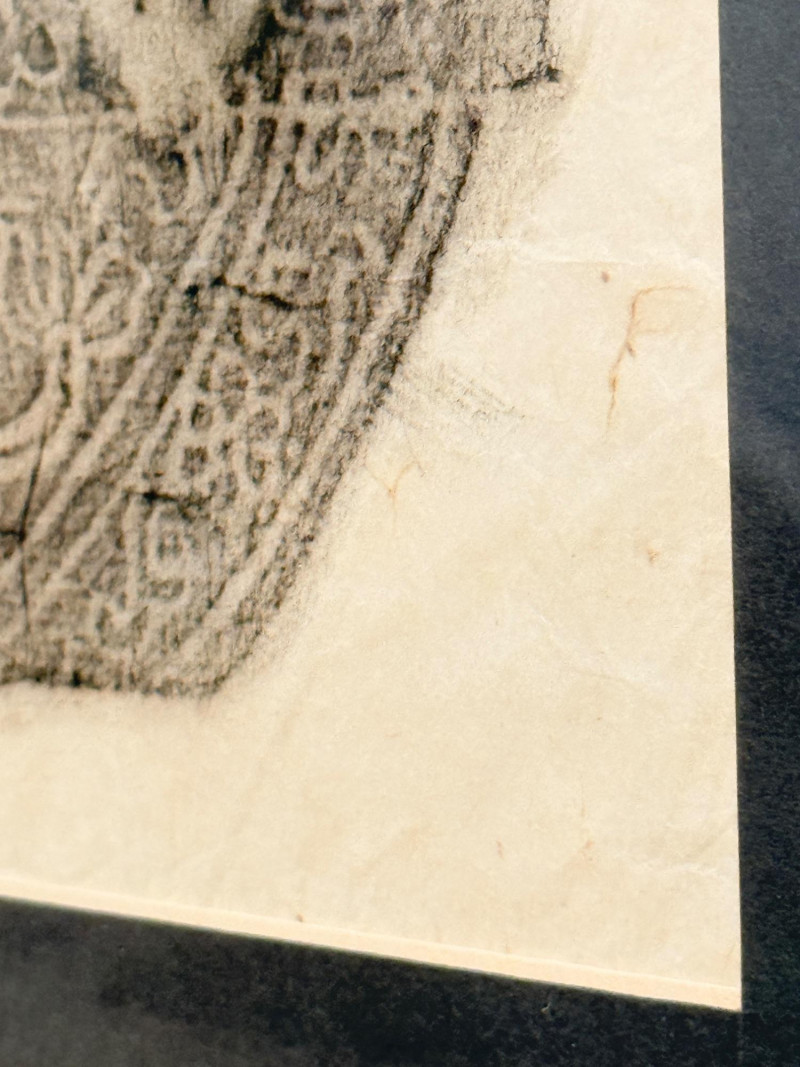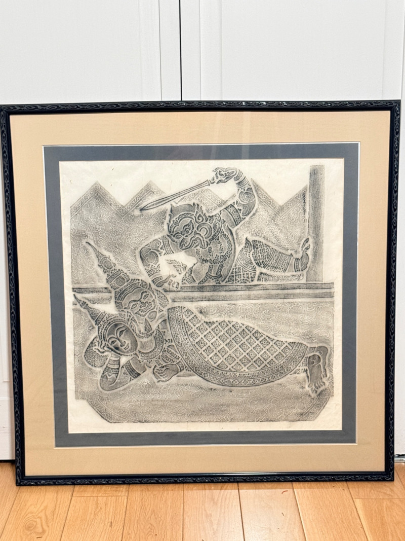 Scene of The Ramakien - A Vintage Thai Temple Rubbing Vintage Original Thai temple rubbing featuring a scene from the Ramakien, from Wat Pho in Bangkok. Traditionally created by placing paper over stone carvings and rubbing with charcoal or colored wax to capture the image. This rubbing depicts the monkey warrior Hanuman discovering the demon king Ravana sleeping with his wife, Mandodari. Similar rubbings were popular souvenirs for travelers and military personnel visiting Bangkok during the 1960s and 1970s. Due to wear on the original stone reliefs, making new rubbings is now banned, making existing ones historical souvenirs. Black wood frame surrounds this rubbing and measures 24.75”x25”