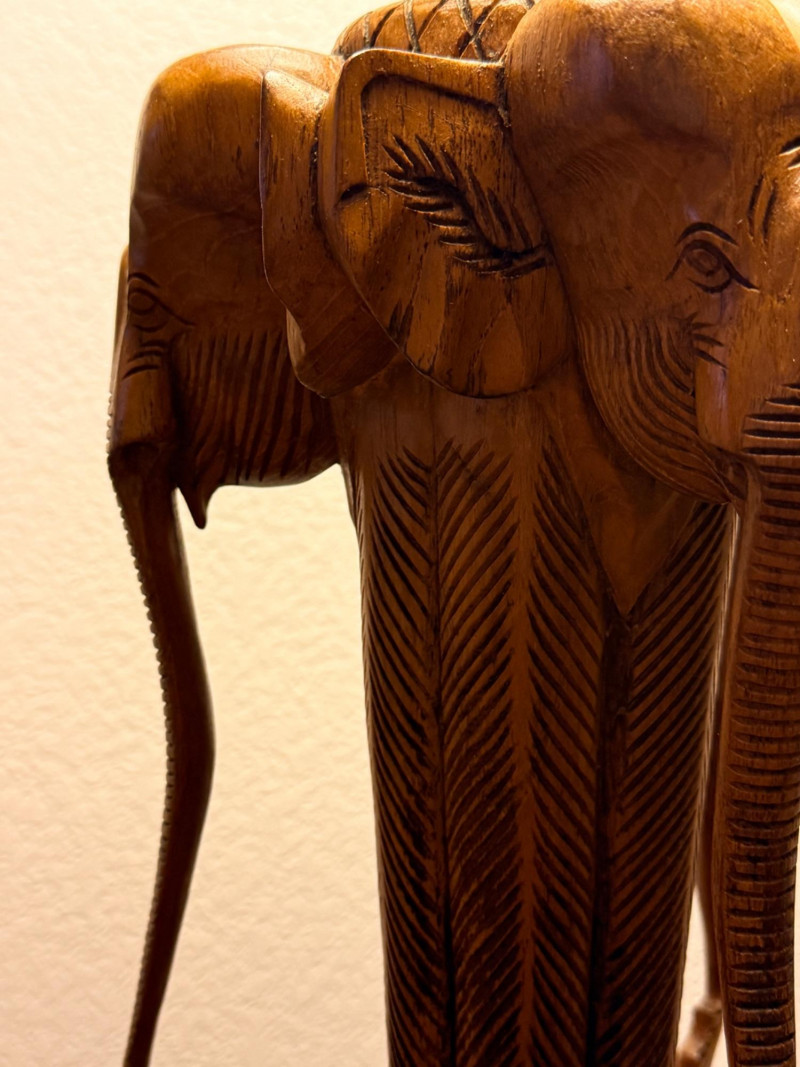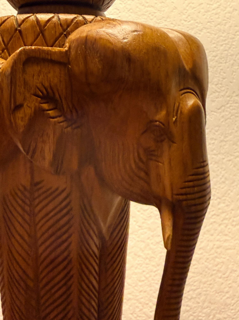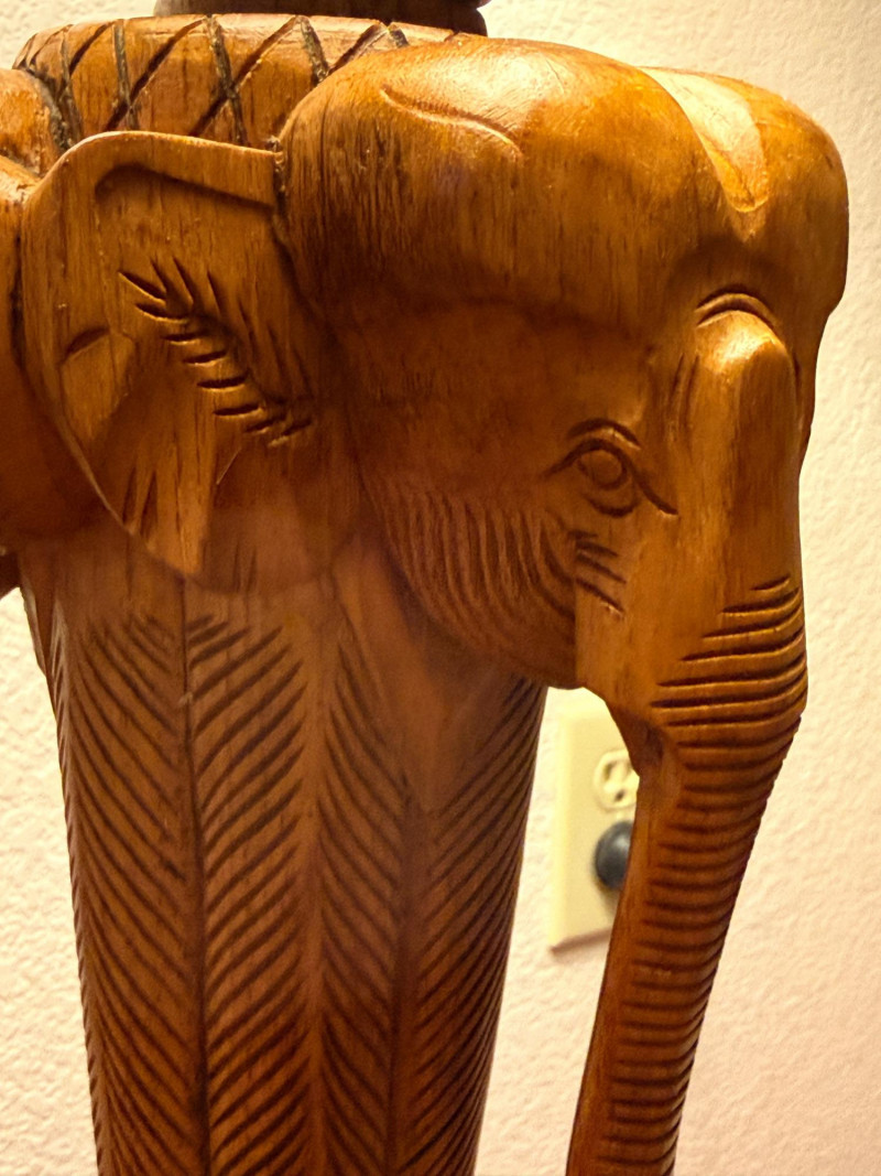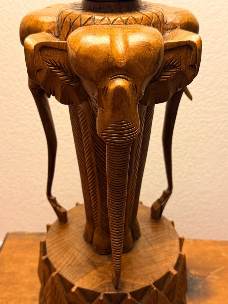 Carved from solid teak, the base showcases three elephants with trunks down, supporting a central wooden column.