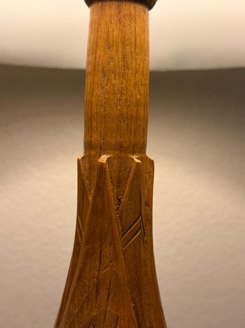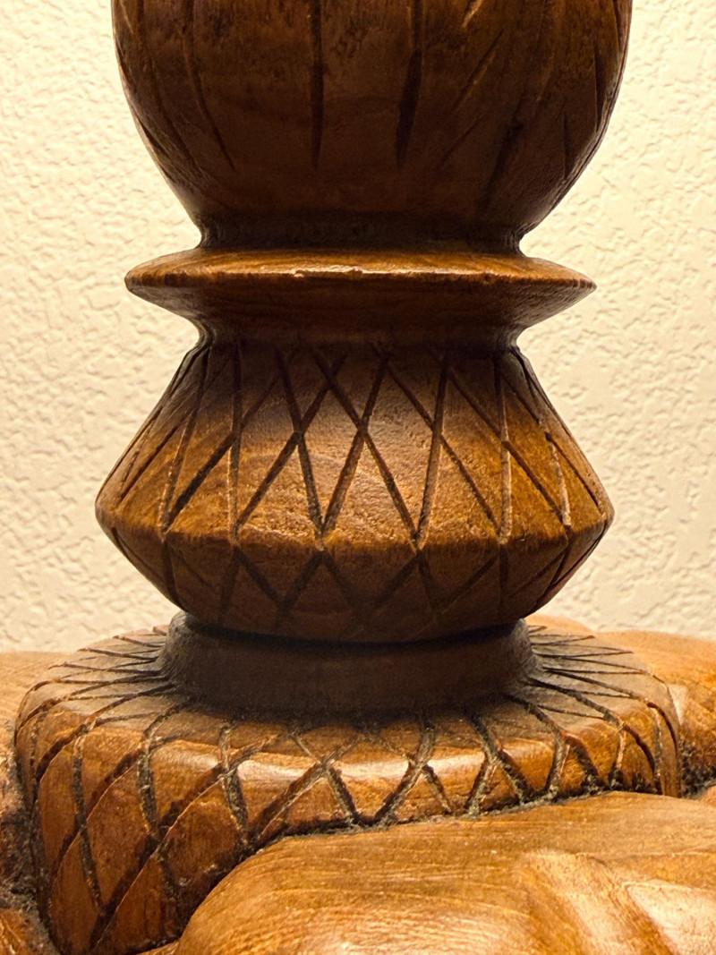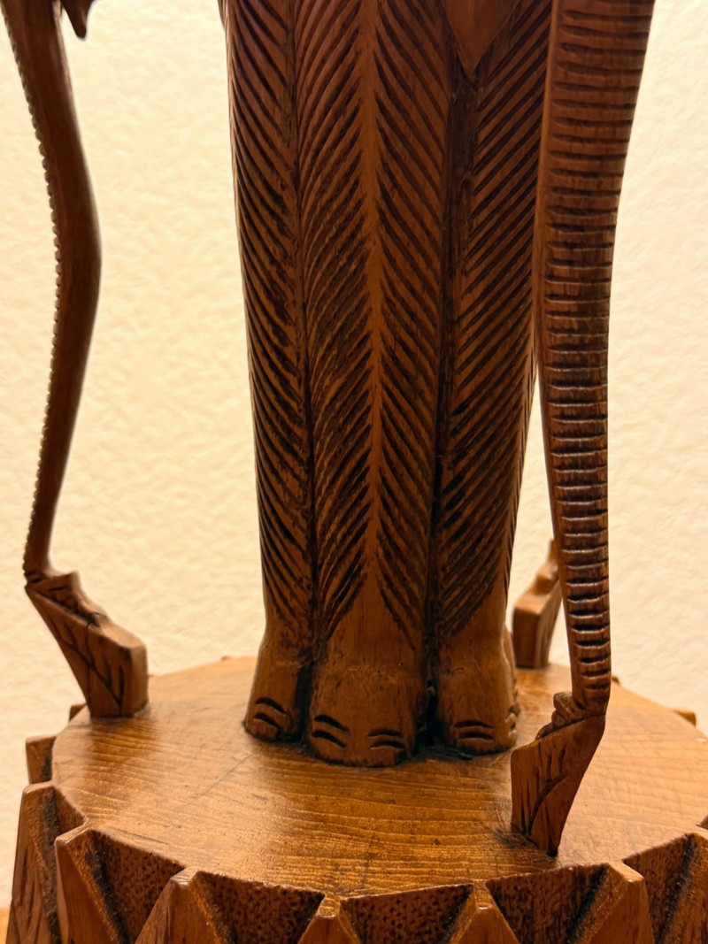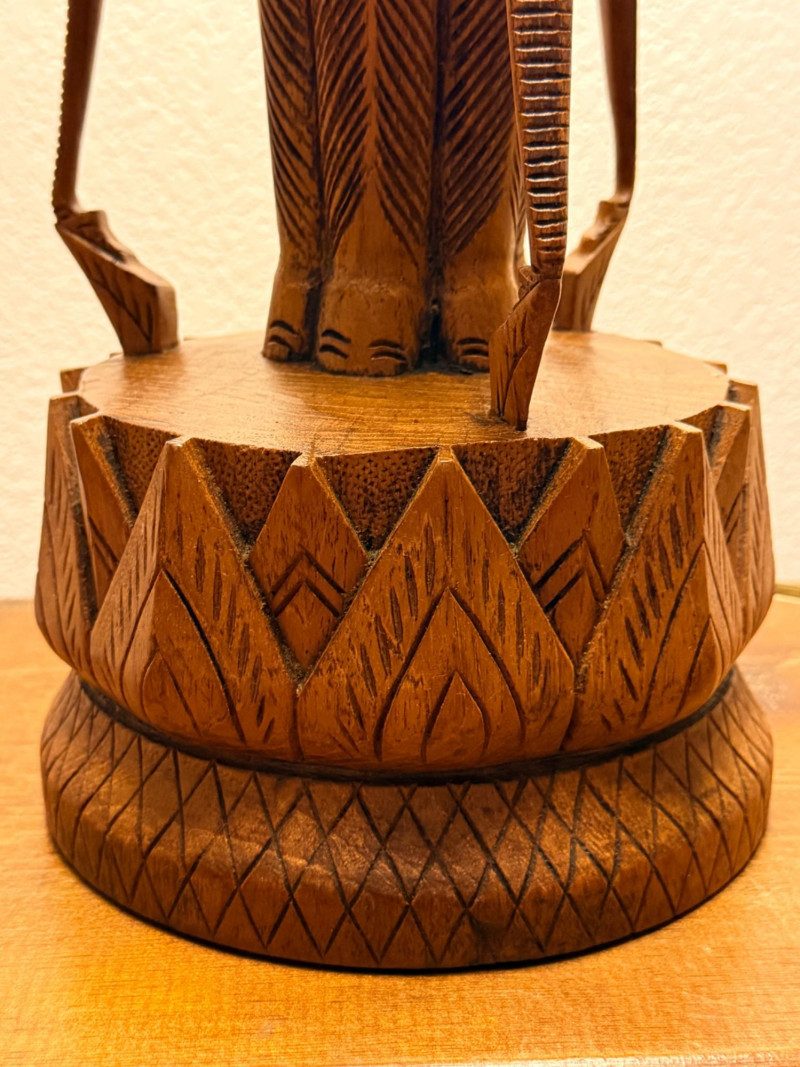 Carved from solid teak, the base showcases three elephants with trunks down, supporting a central wooden column.
