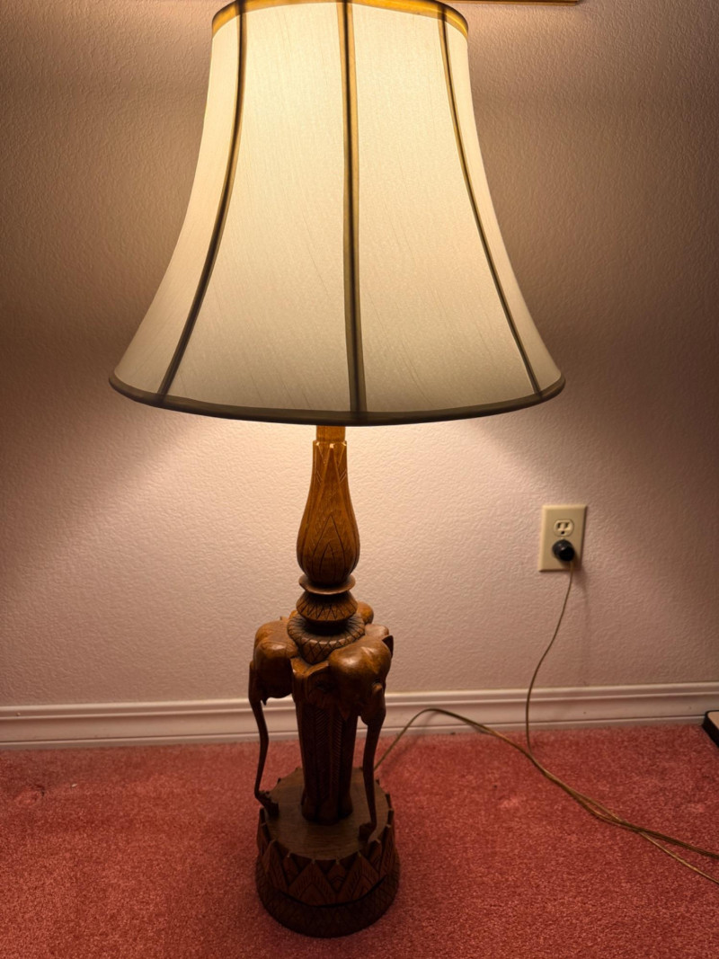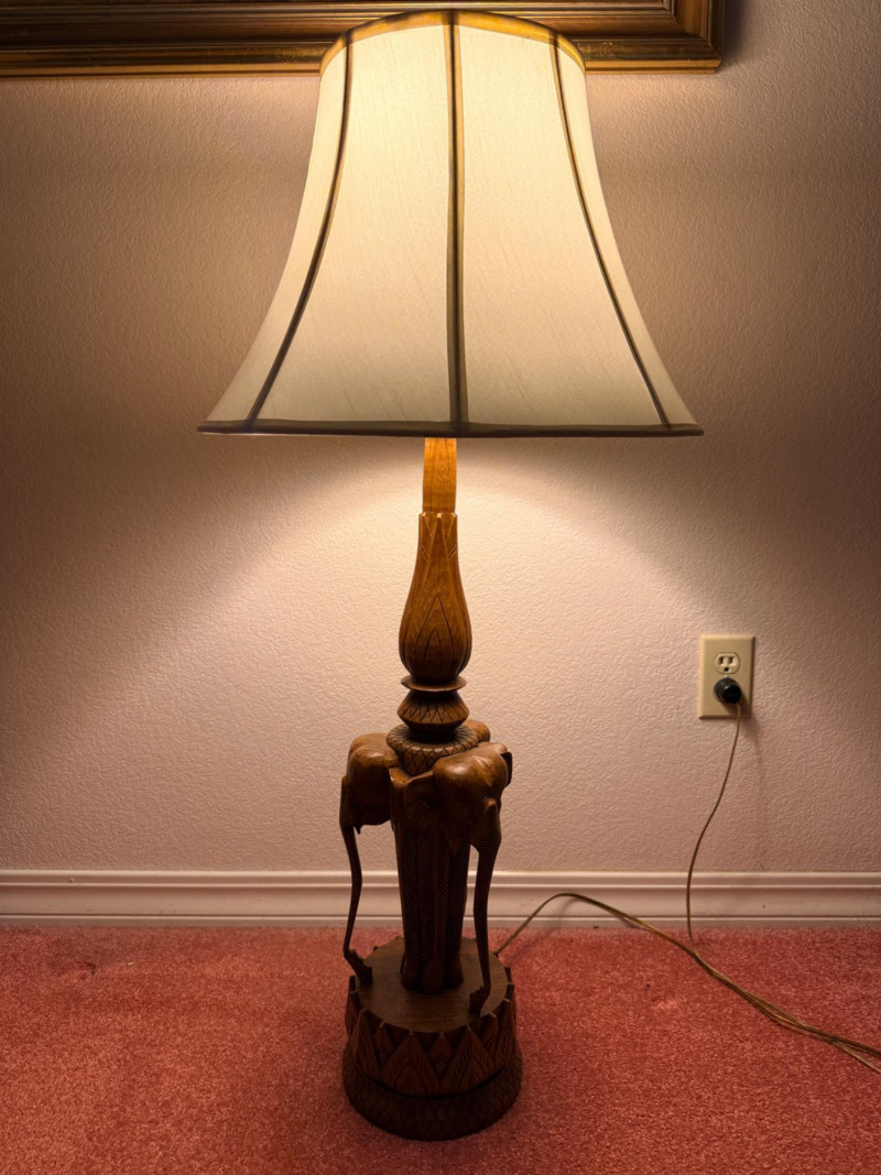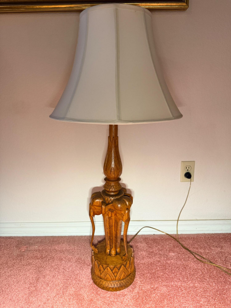 MCM Hand Carved Teak Elephant Trio Lamp Dimensions: These lamps are quite tall. 8” base by 48 inches in height with a 19” lined shade.